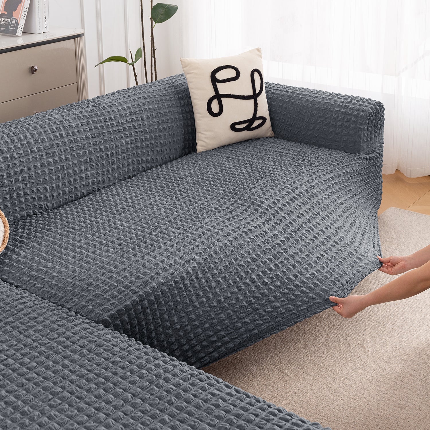 Premium Fabric: 280 GSM stretchable bubble fabric fits most L-shape sofas; check size guide before purchase.