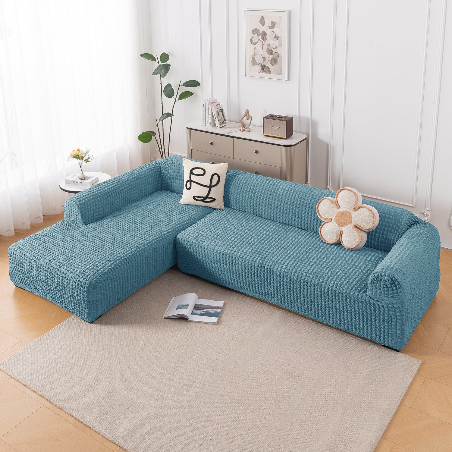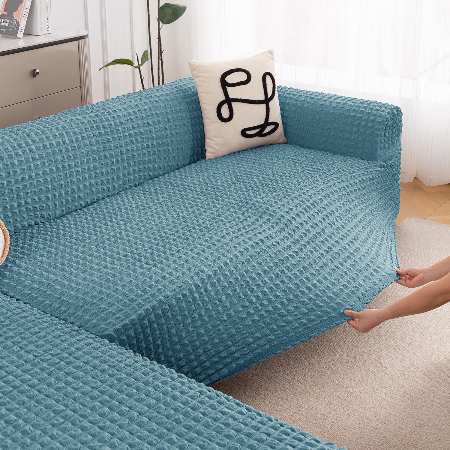 Premium Fabric: 280 GSM stretchable bubble fabric fits most L-shape sofas; check size guide before purchase.