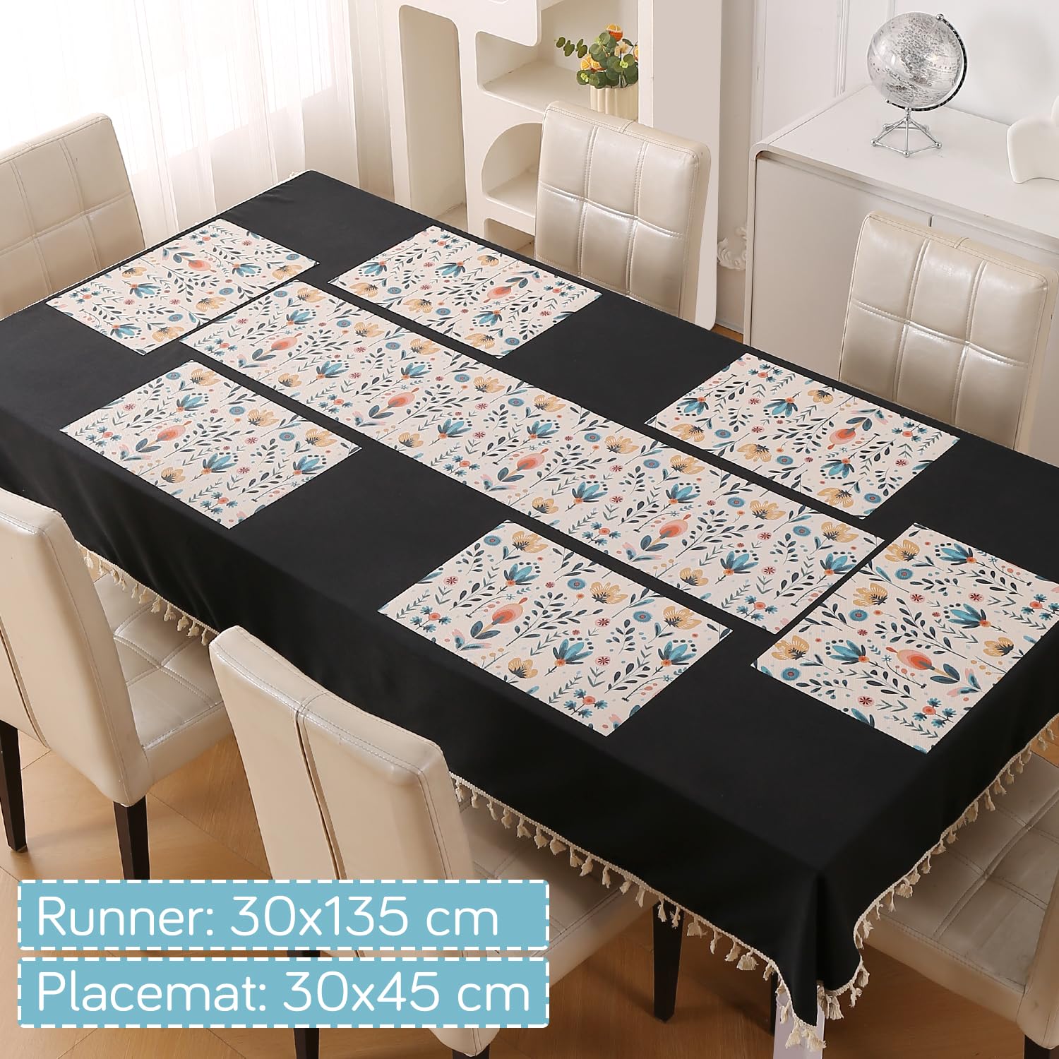 DIMENSION - This dinner table mat measures 30x45 cm and table runner measures 30x135 cm in size.