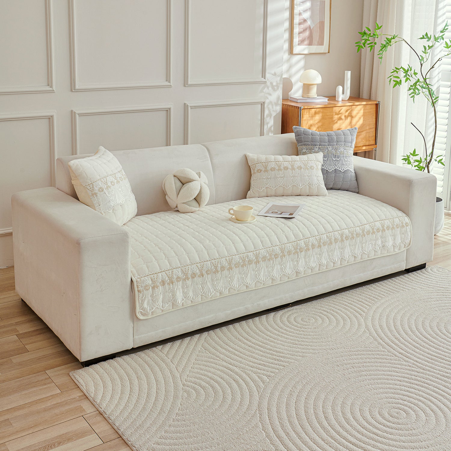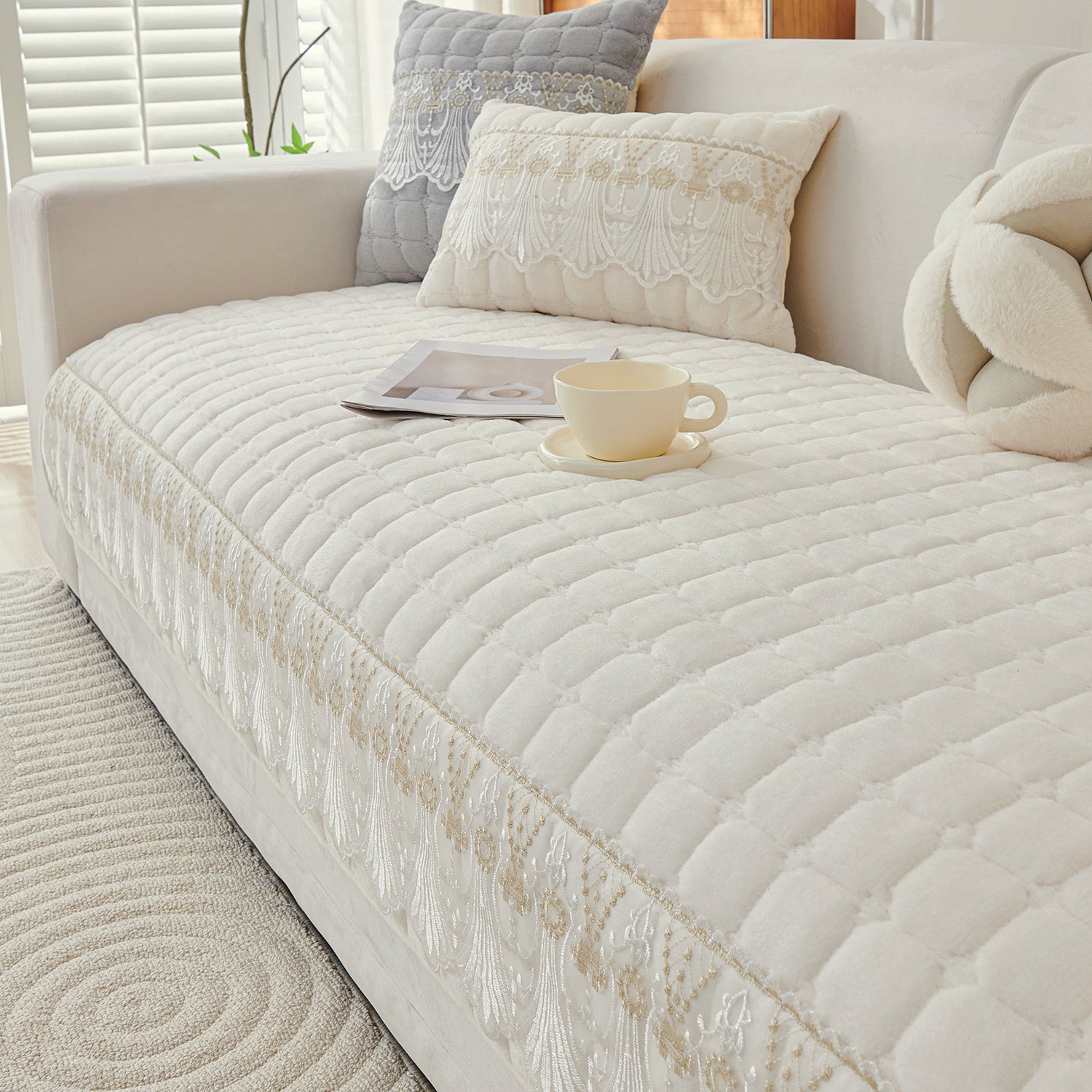BelleLace Series Imperial Milk Velvet Sofa Cover Mat with Lace Design - Pearl White