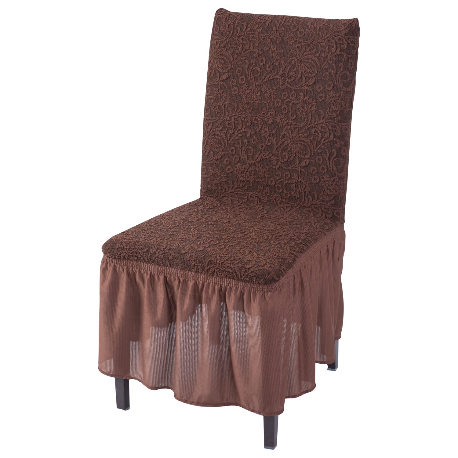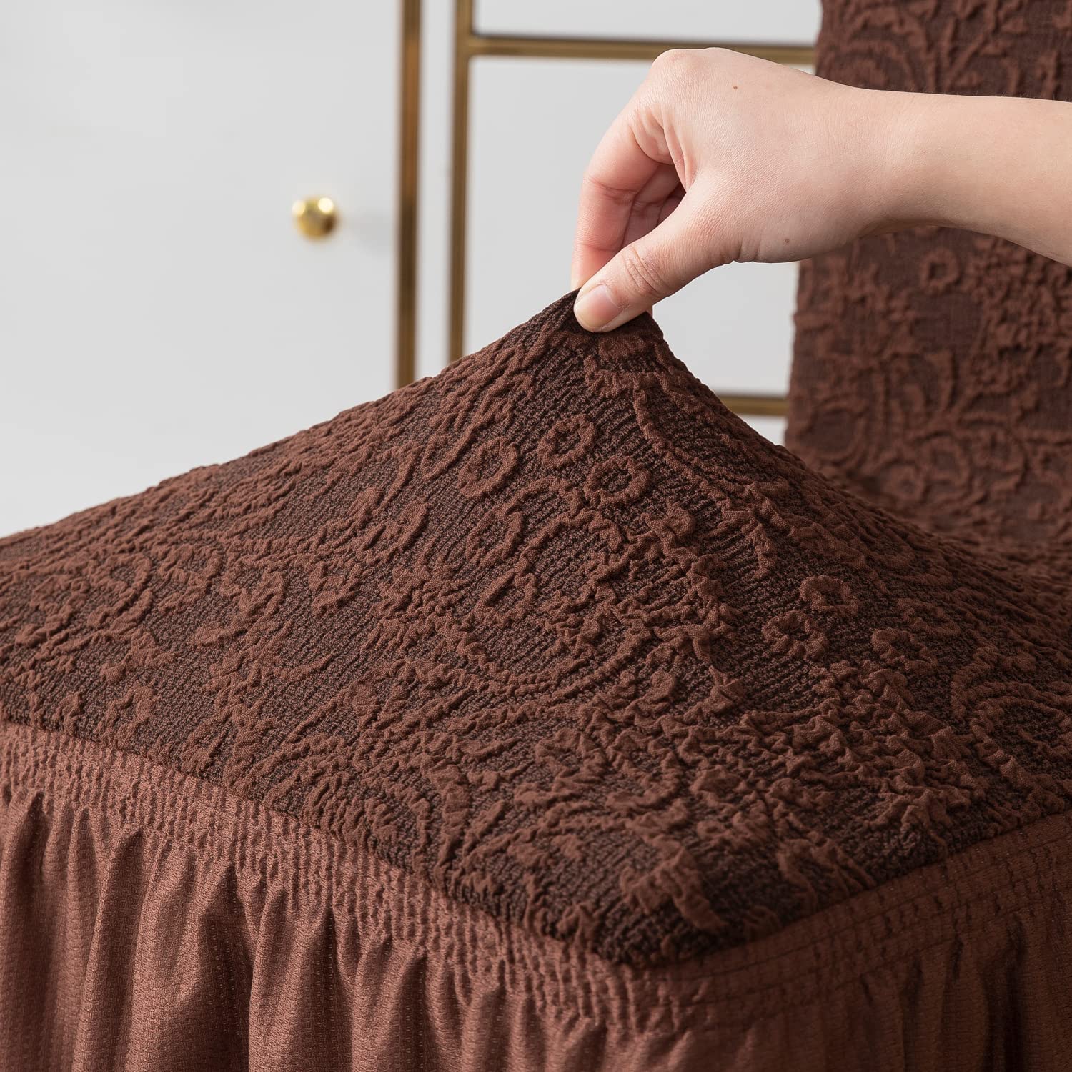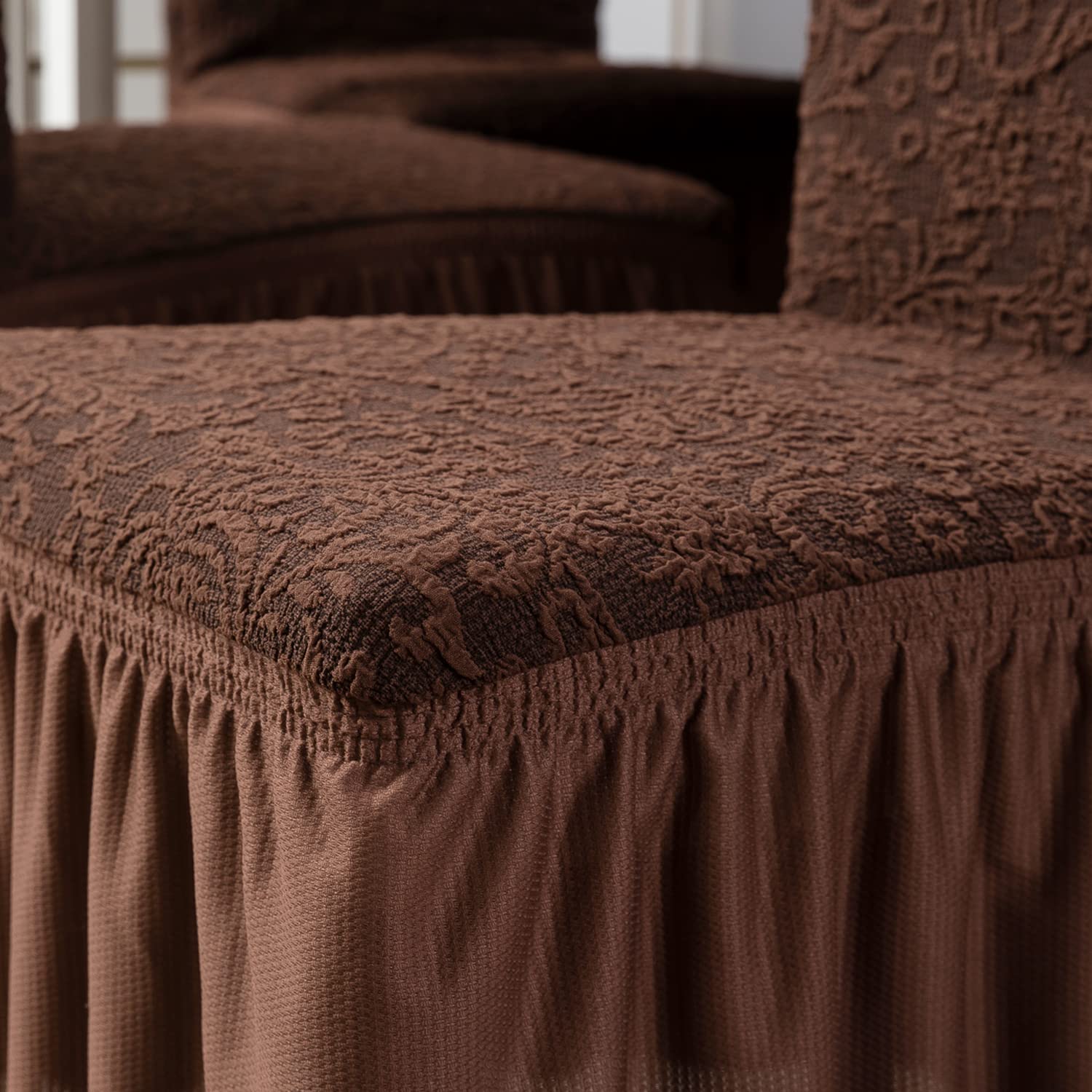 Elastic Stretchable Designer Woven Jacquard Dining Chair Cover with Frill, Pecan Brown