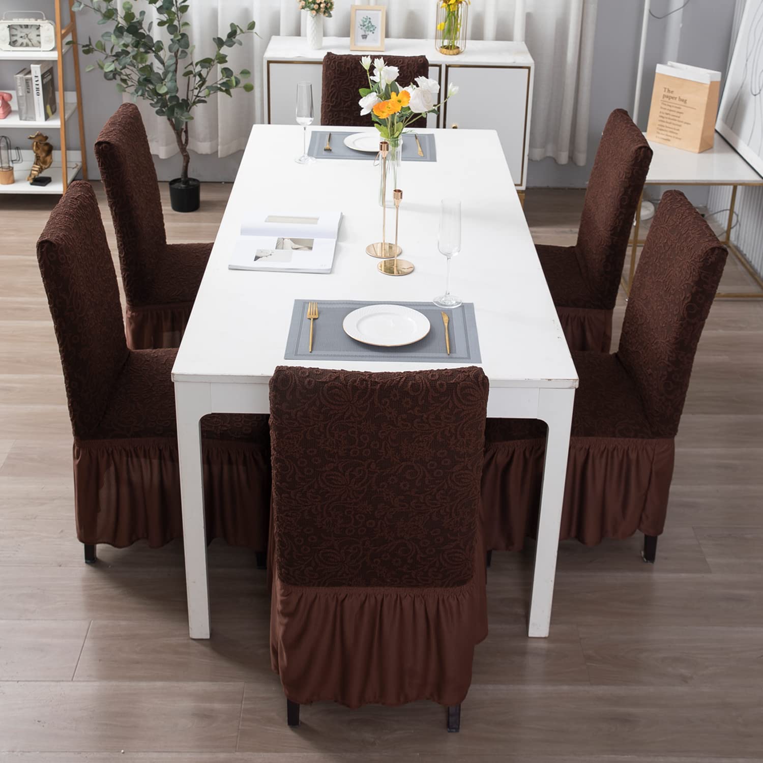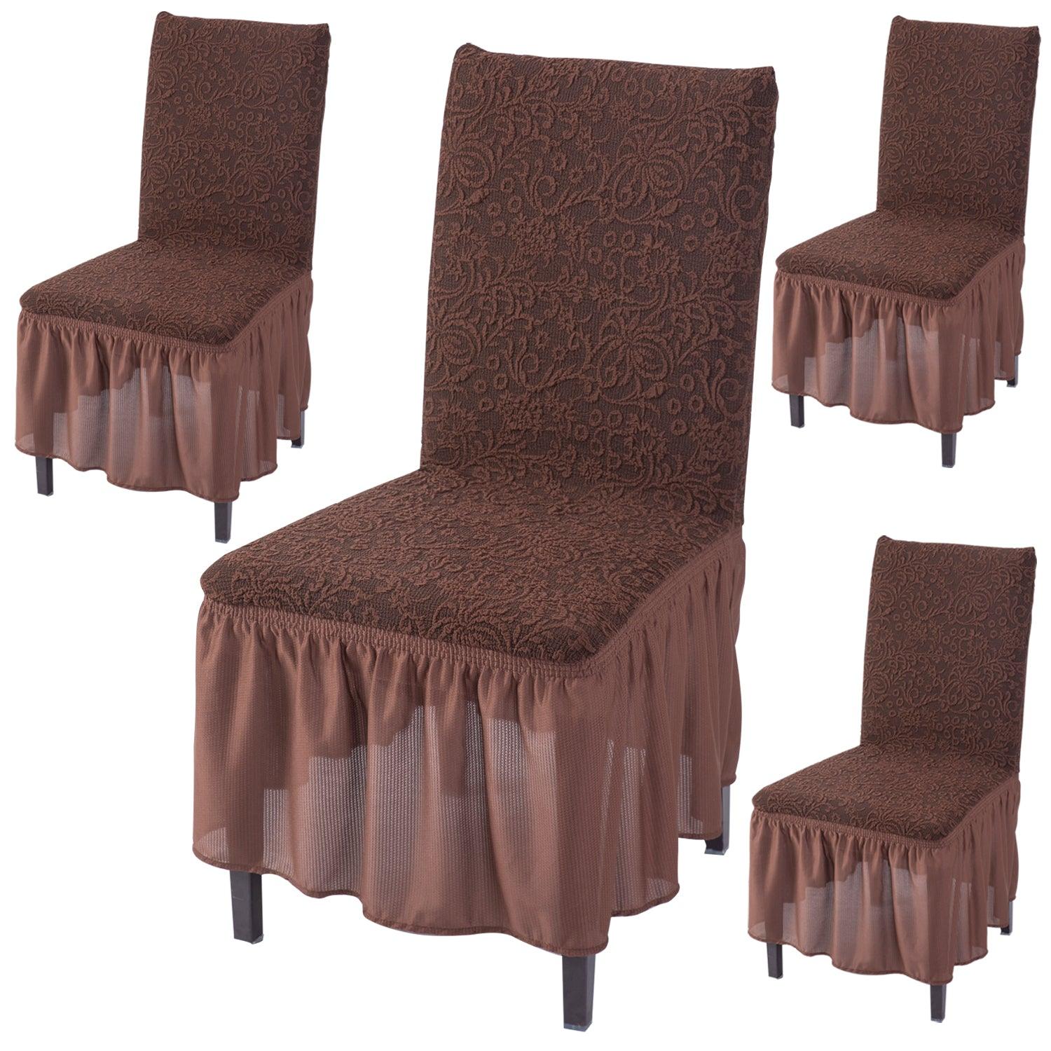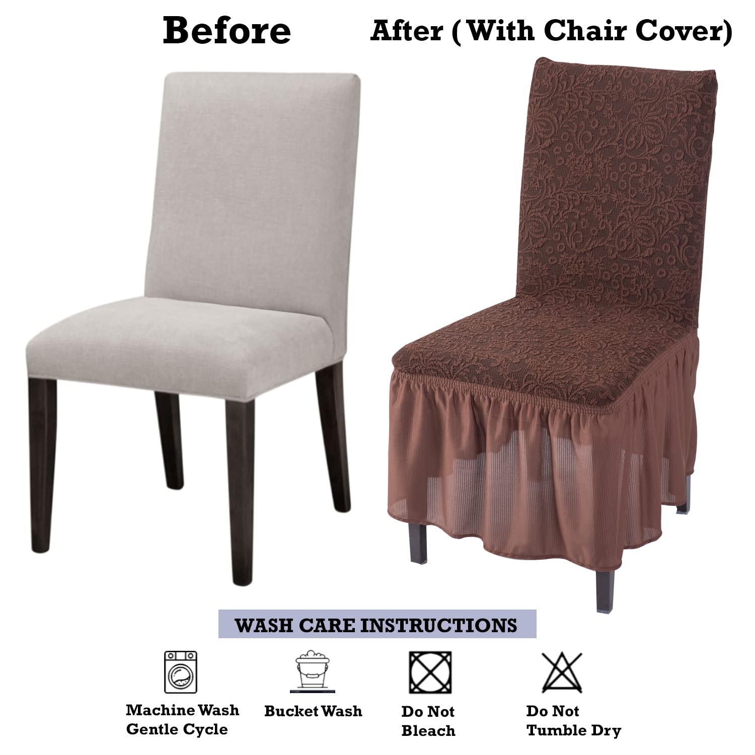 Elastic Stretchable Designer Woven Jacquard Dining Chair Cover with Frill, Pecan Brown
