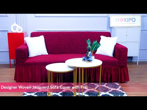 - Designer jacquard fully covered sofa cover with frill. Made with 95% polyester and 5% spandex