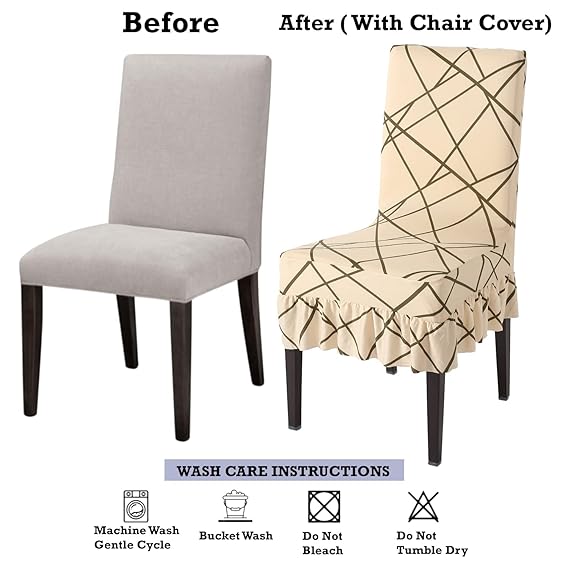 Elastic Stretchable Dining Chair Cover with Frill, Beige Abstract Line