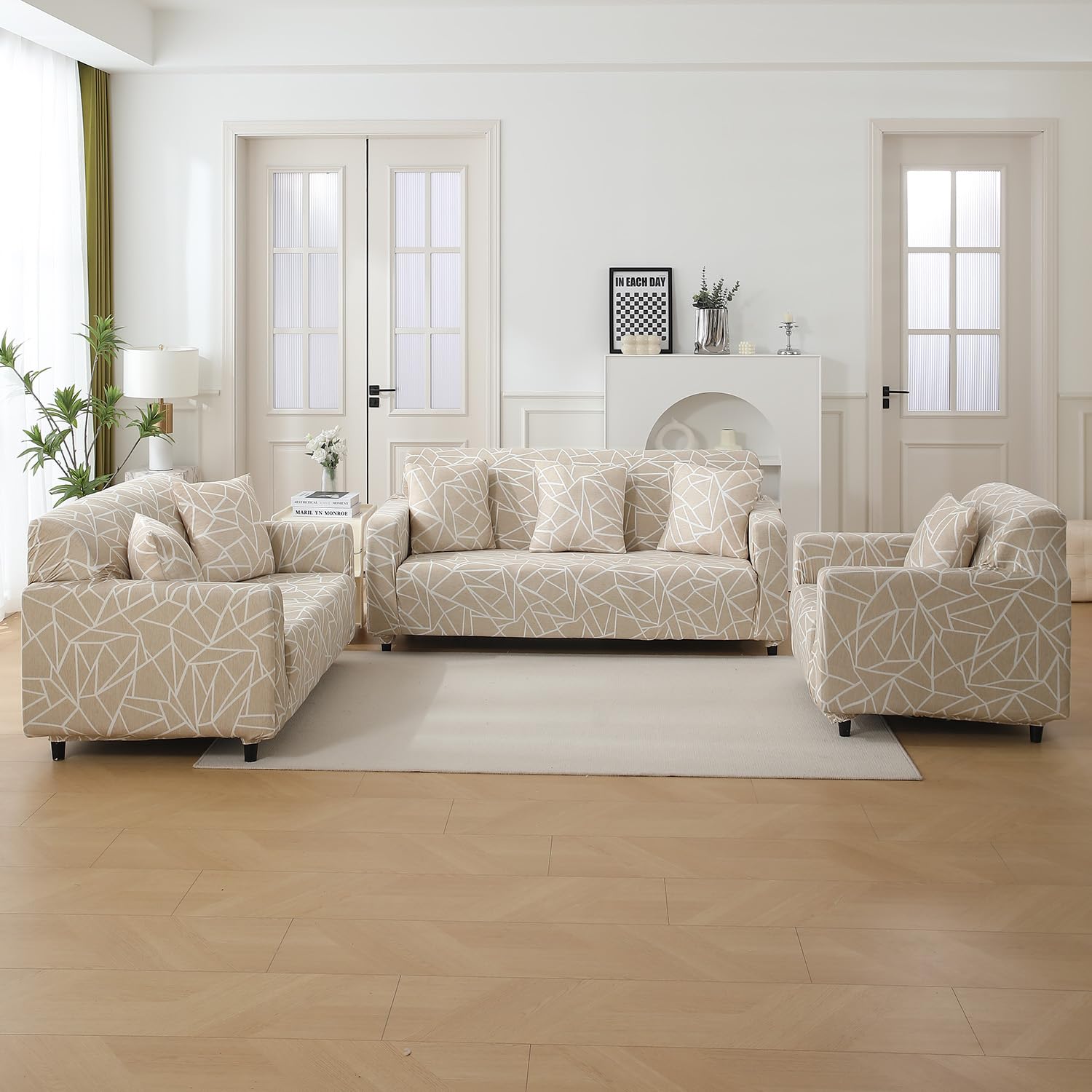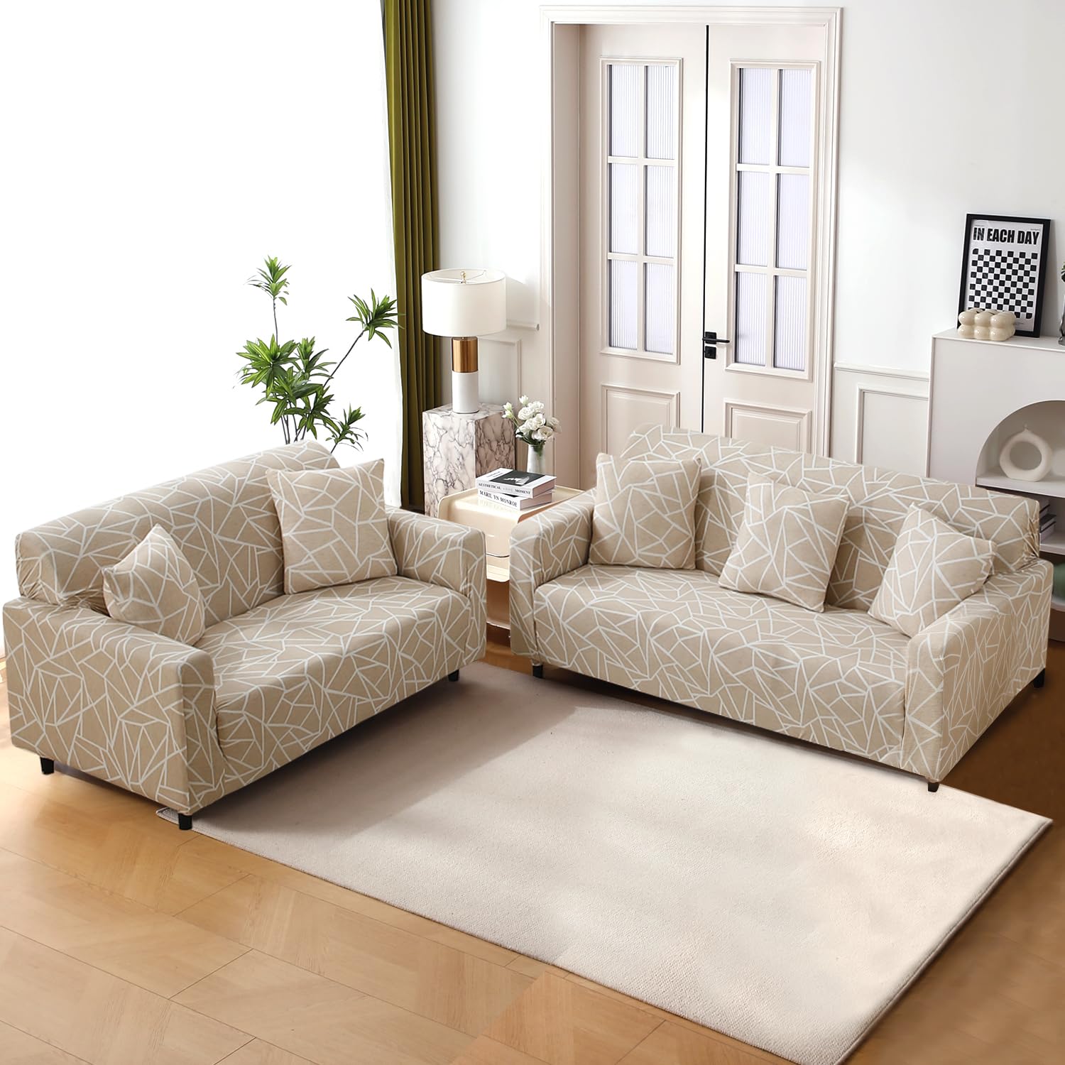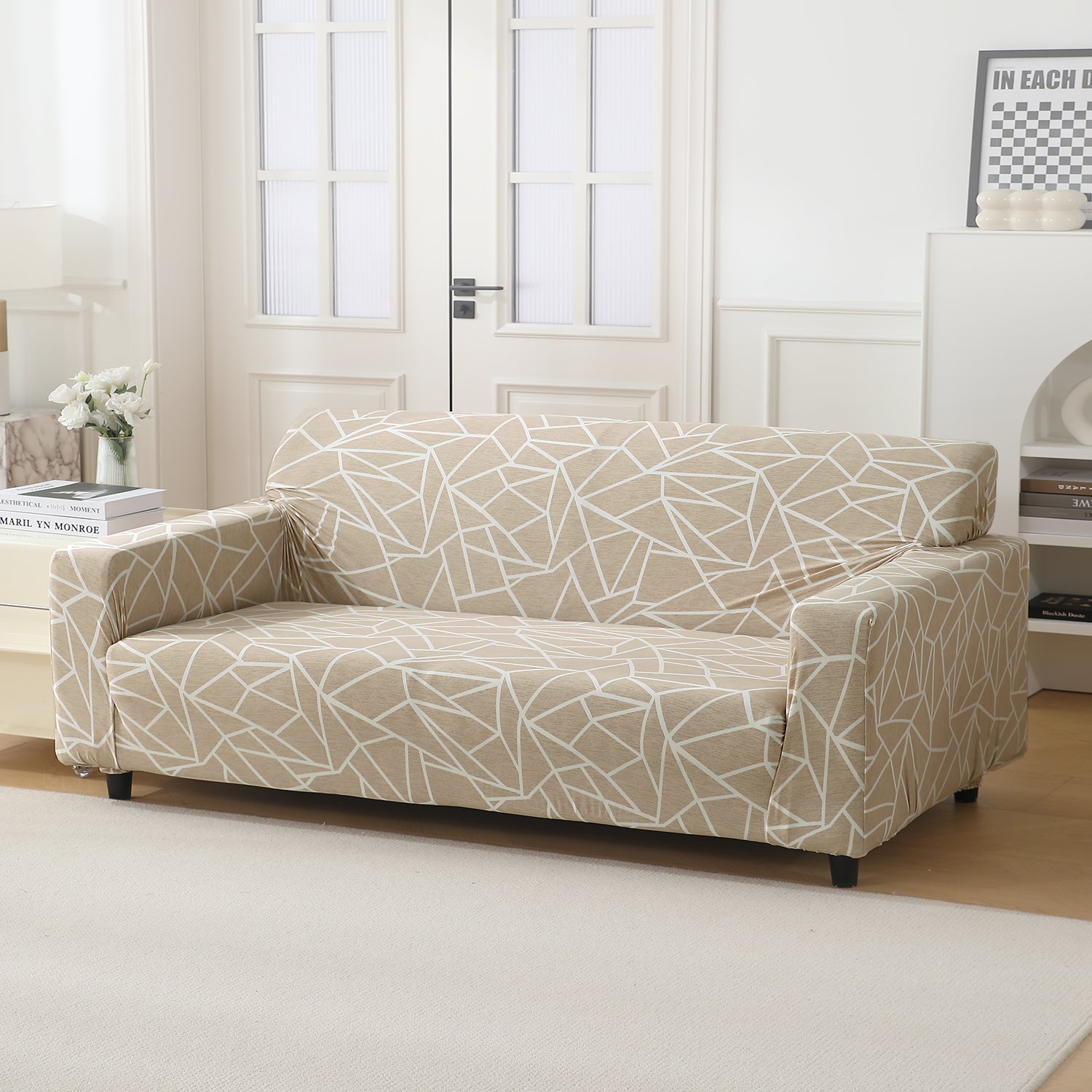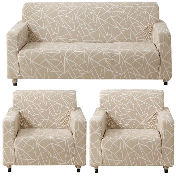 Elastic Stretchable Printed 140gsm Fully Covered Sofa Cover, Beige Abstract Geometry