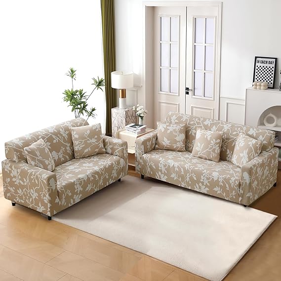 Elastic Stretchable Printed 140gsm Fully Covered Sofa Cover, Buff Brown Sillehoute Floral