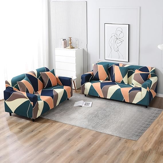 Elastic Stretchable Printed Sofa Cover , Green Peach Abstract