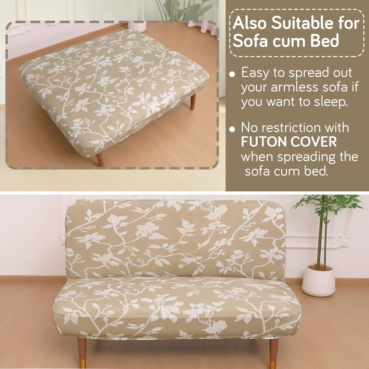 Elira Series Stretchable Elastic Armless Sofa Cover – 140 GSM, Futon Slipcover, Easy Fit, Buff Brown Sillehoute Floral