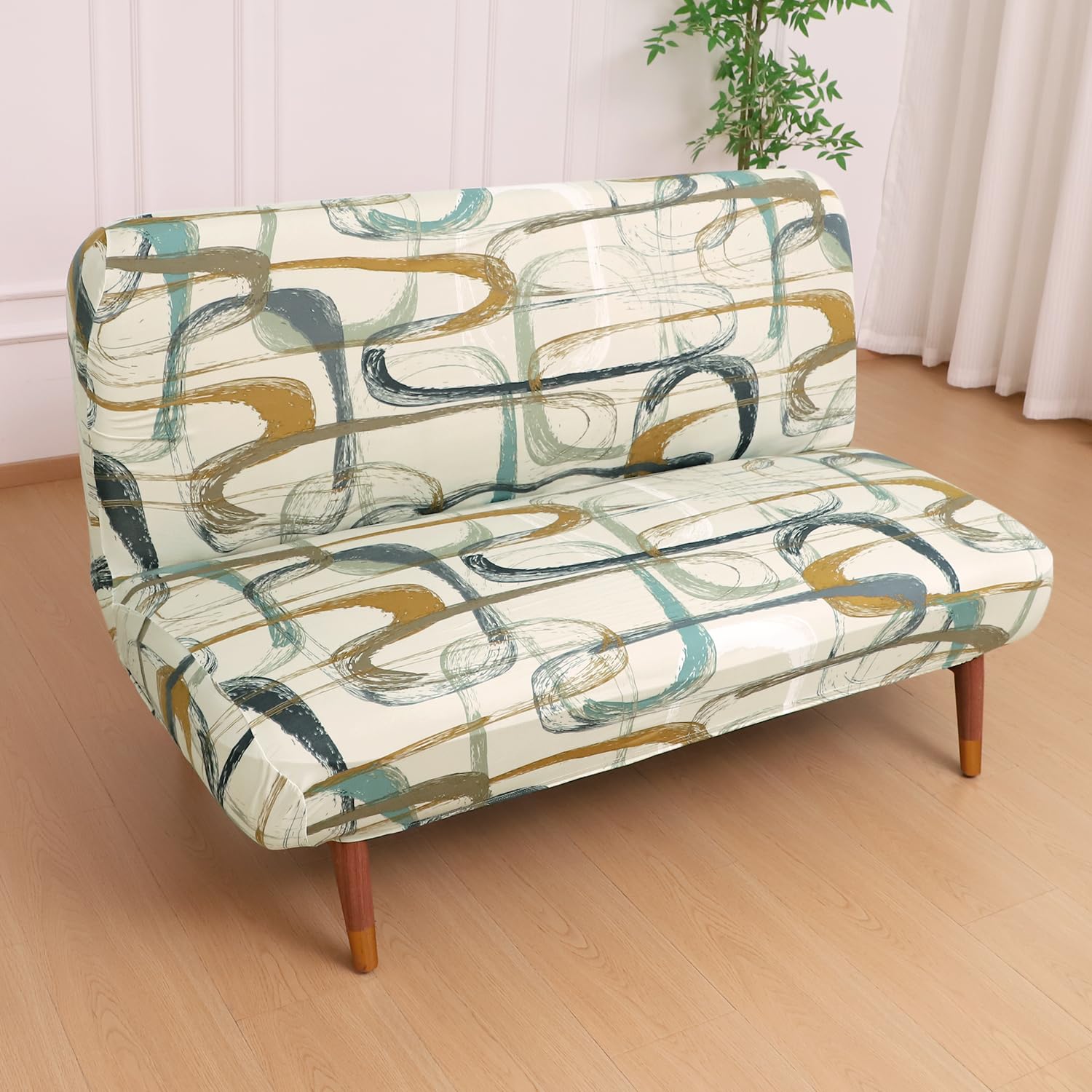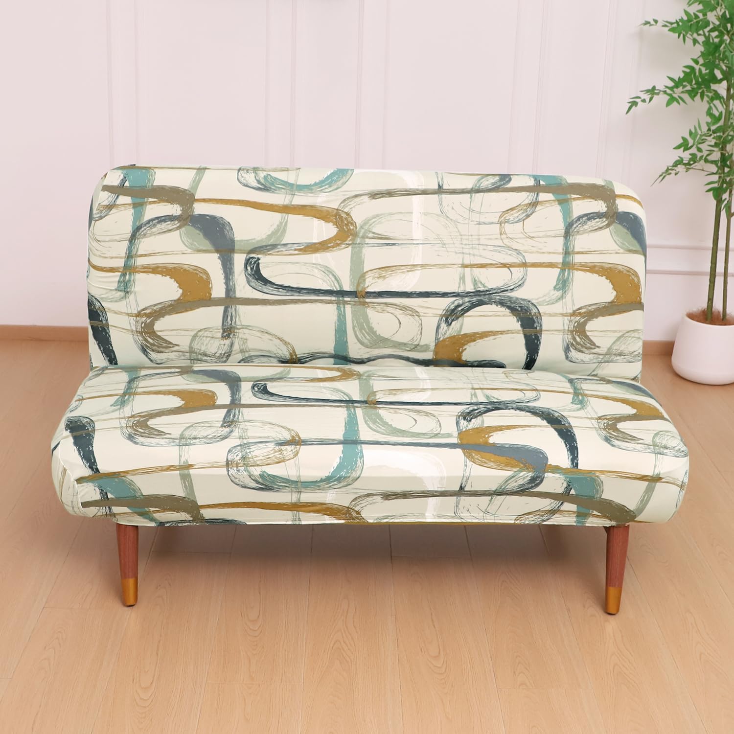 Elira Series Stretchable Elastic Armless Sofa Cover – 140 GSM, Futon Slipcover, Easy Fit, Parchement Beige Abstract Art