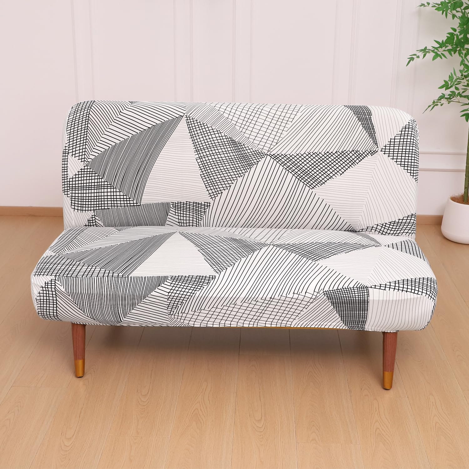 Elira Series Stretchable Elastic Armless Sofa Cover – 140 GSM, Futon Slipcover, Easy Fit, Snow White Black Geometry