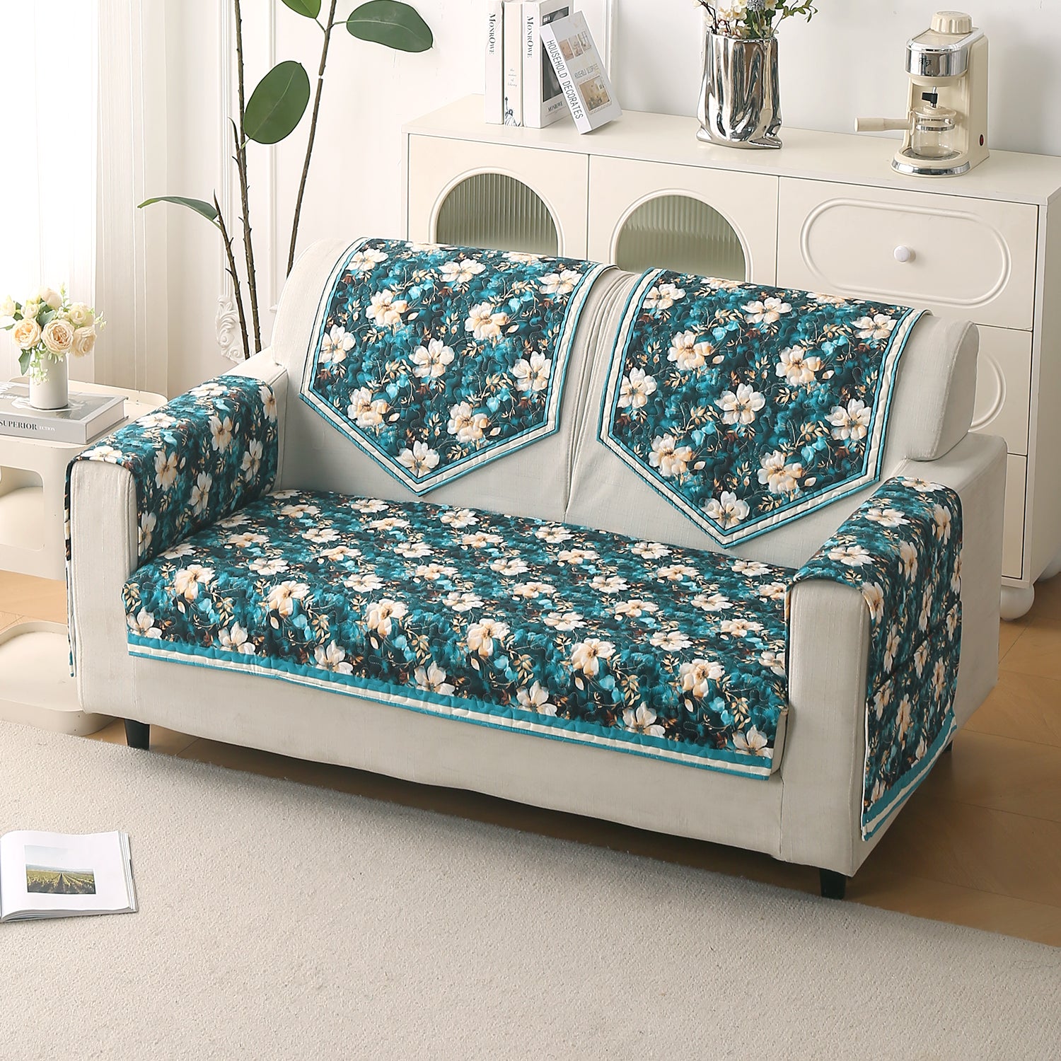 Florentina Series Printed Holland Velvet Sofa Mat - Pansies Teal
