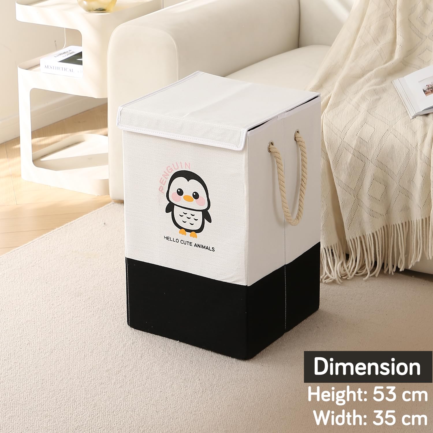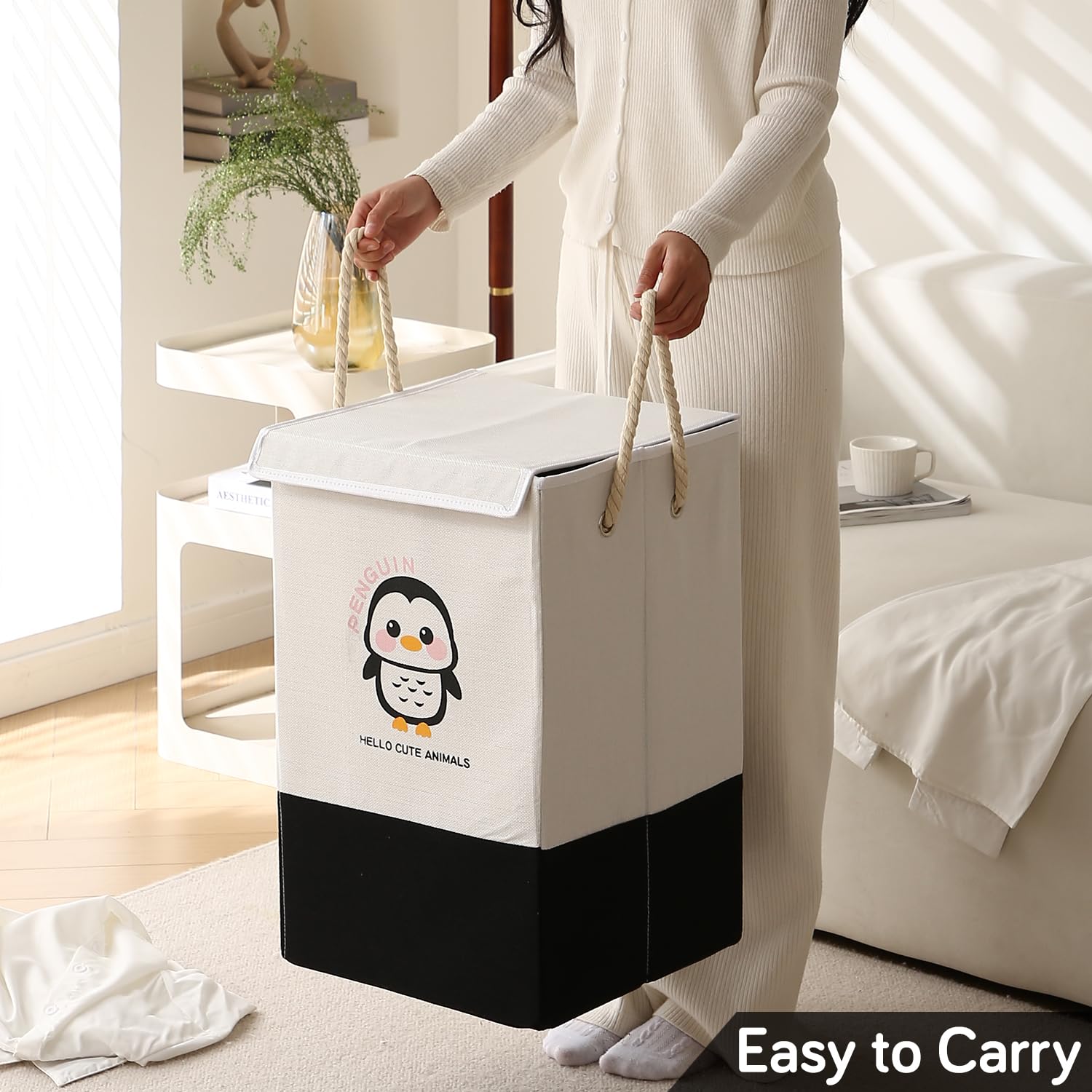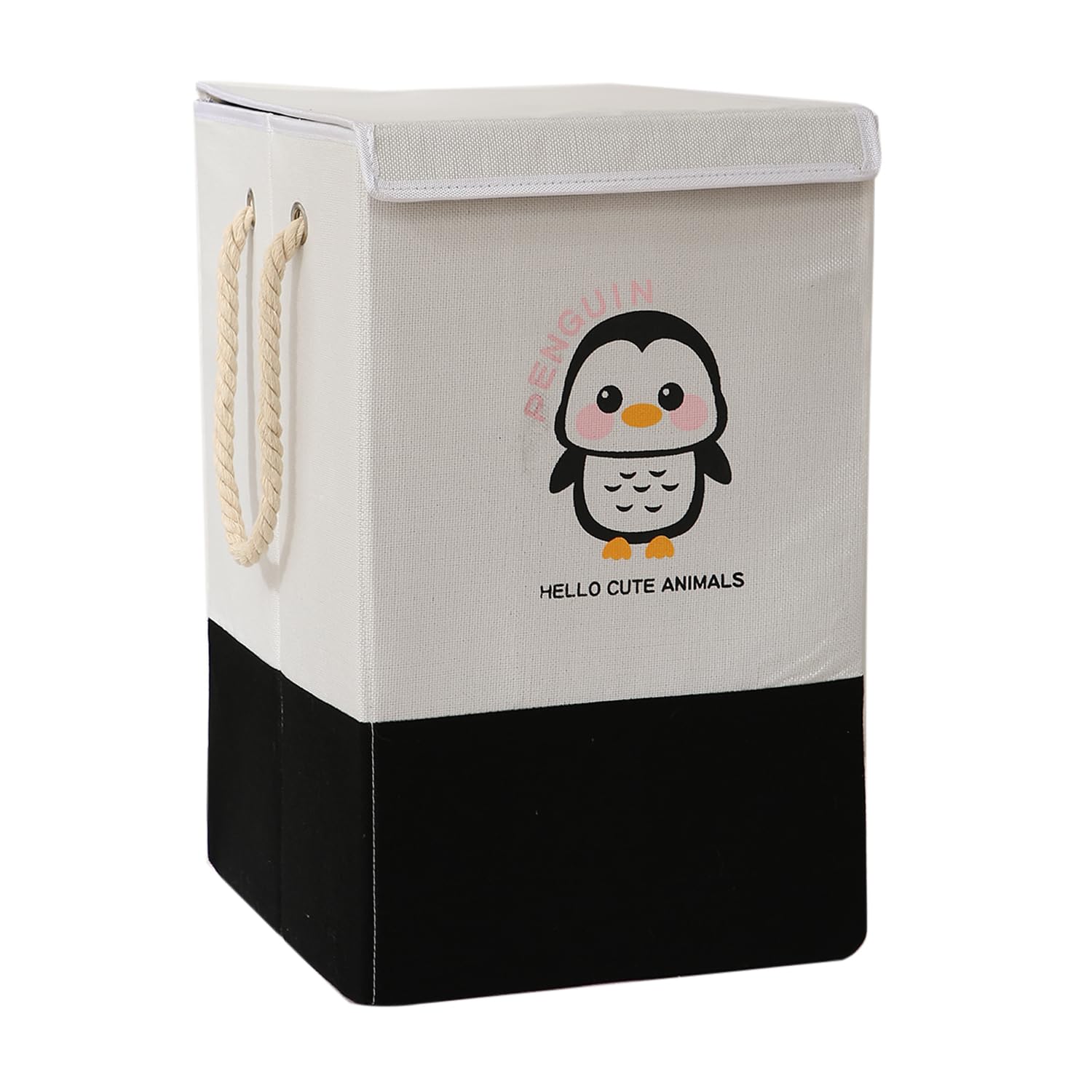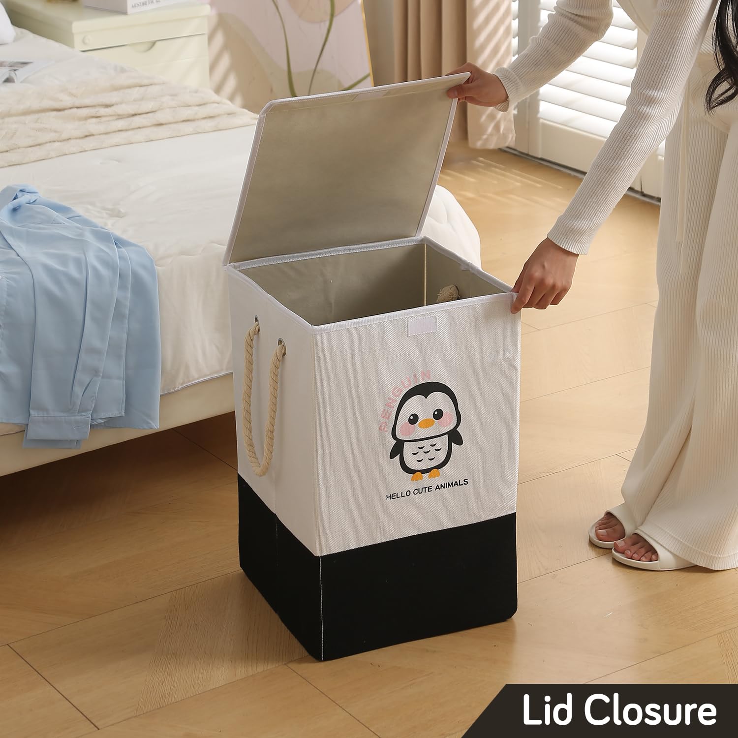 Foldable Laundry Basket for Clothes with Lid, Black - Penguin