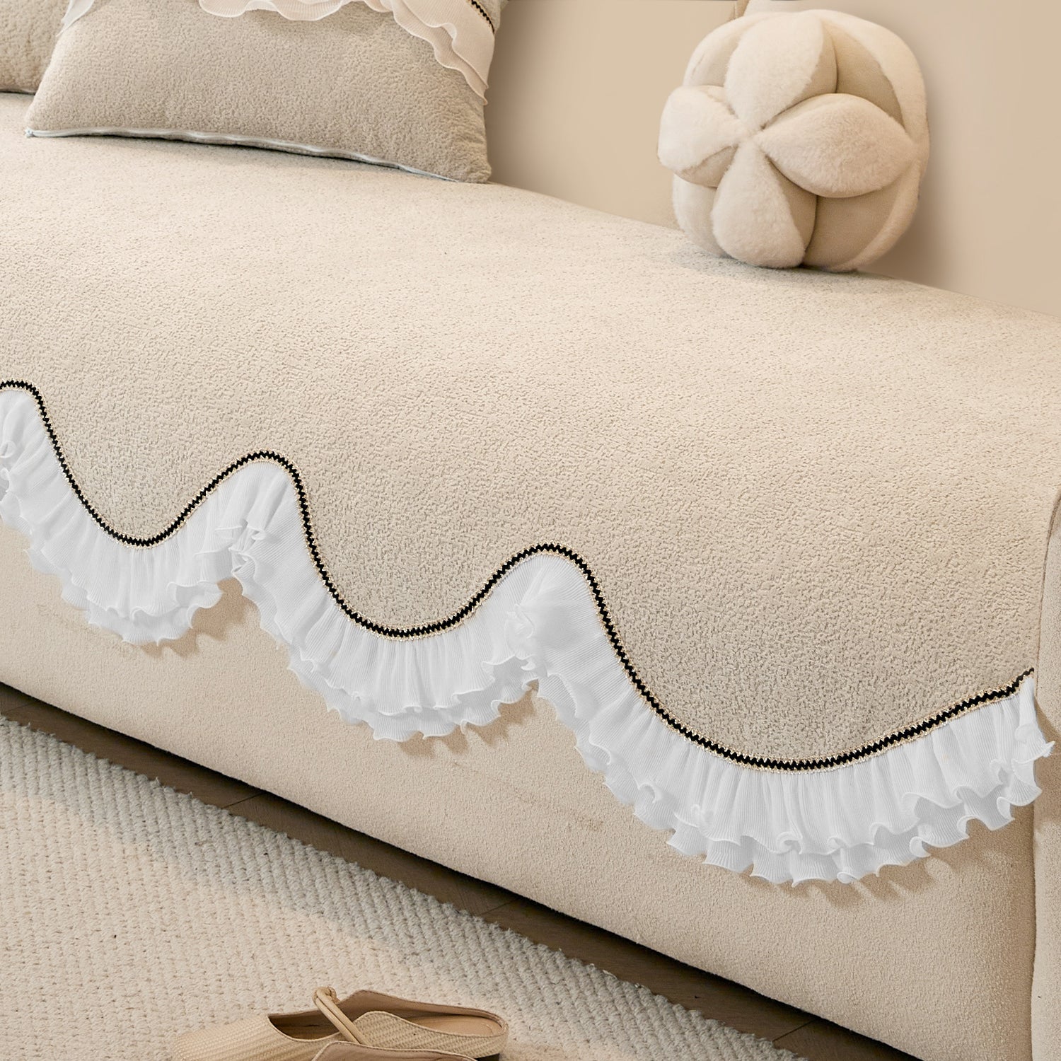 French Classic Frill Wavy Sofa Cover Mat with Curve & Lace - Champagne Beige