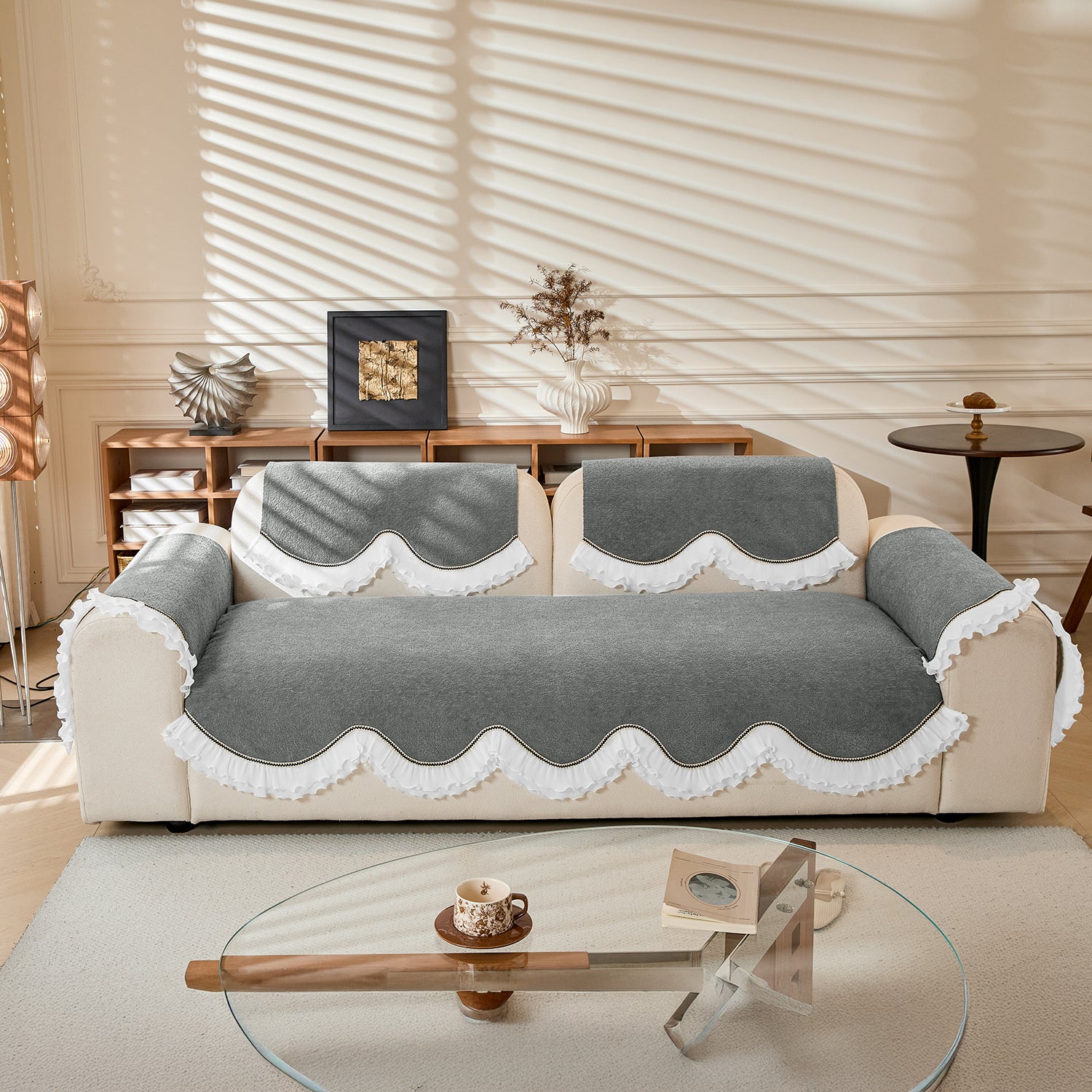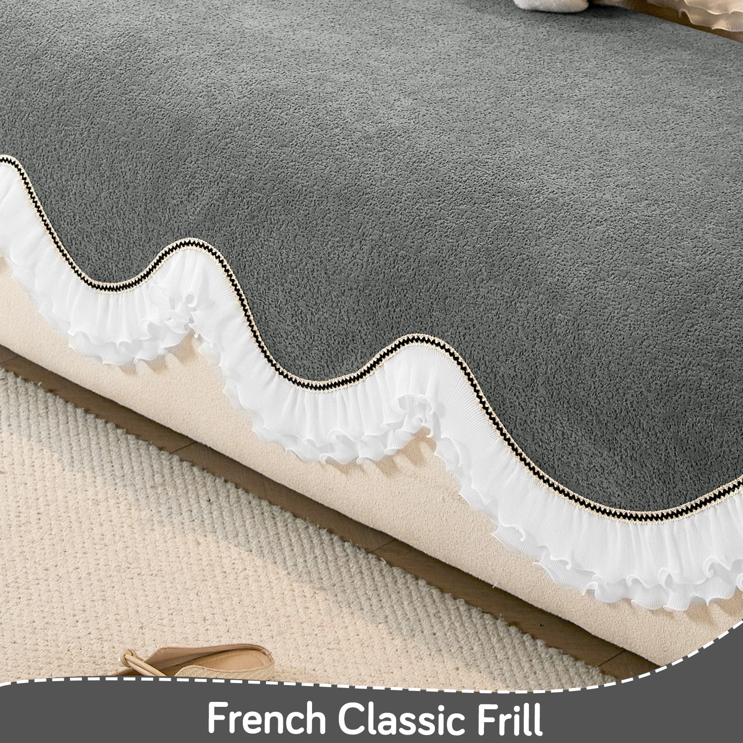 French Classic Frill Wavy Sofa Cover Mat with Curve & Lace - Moonstone Grey