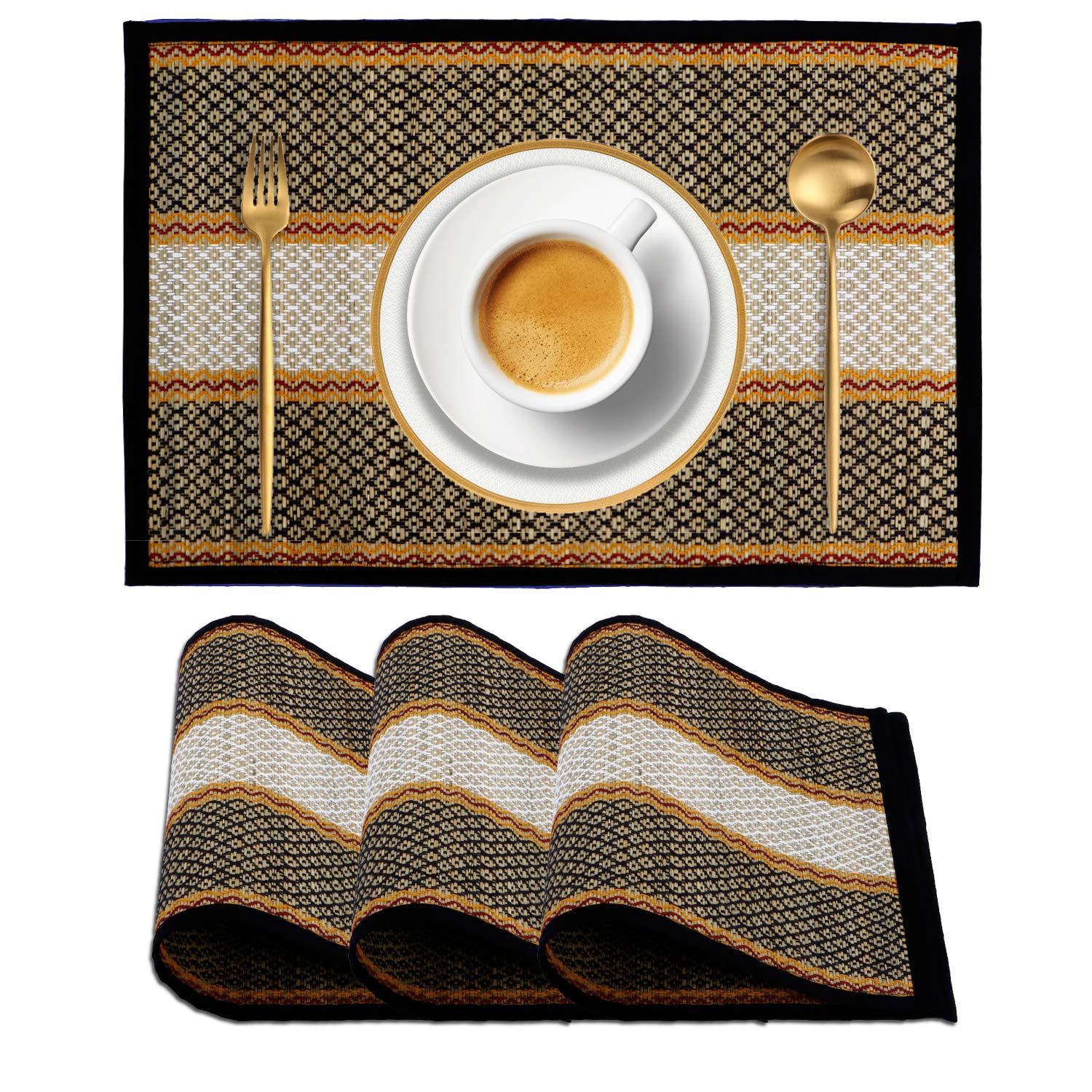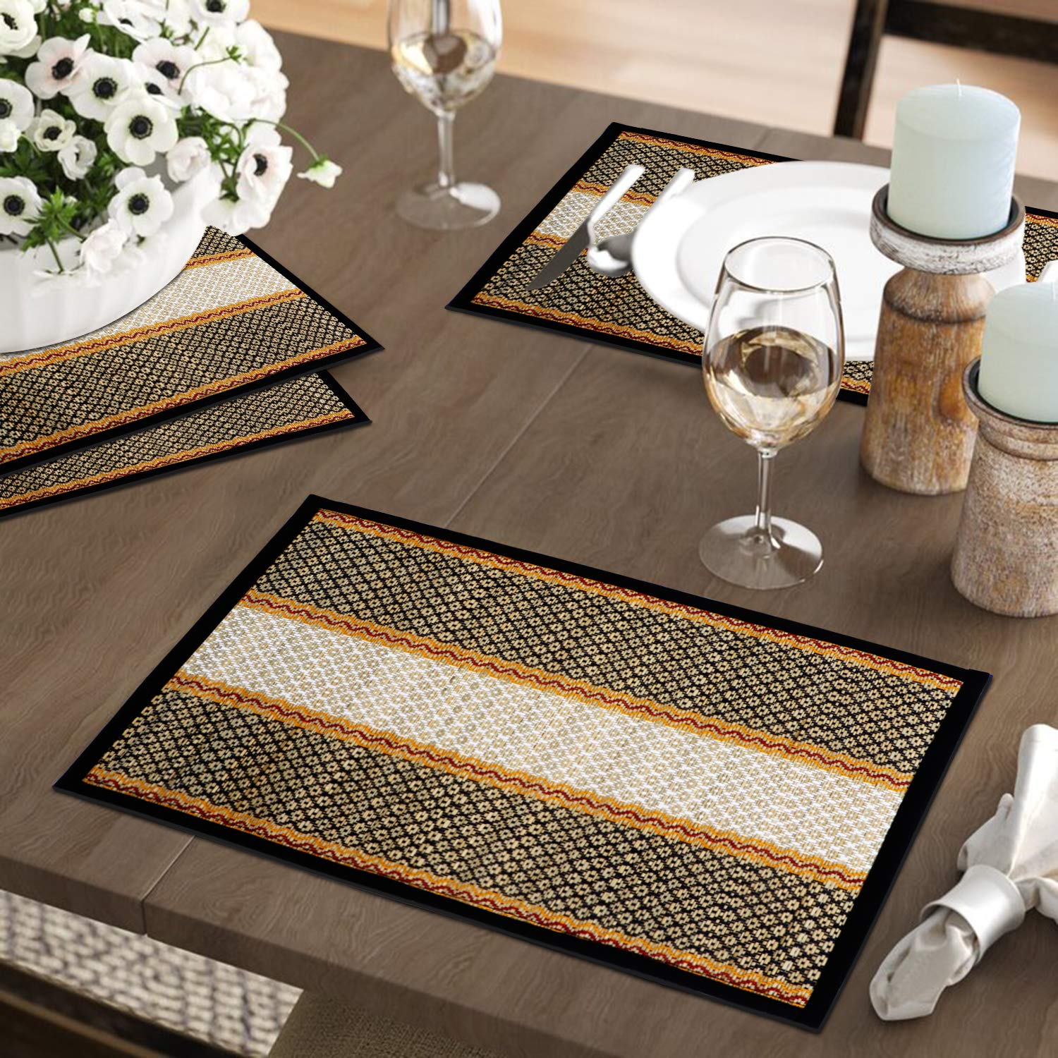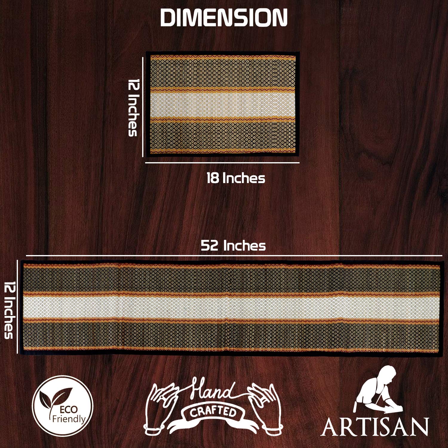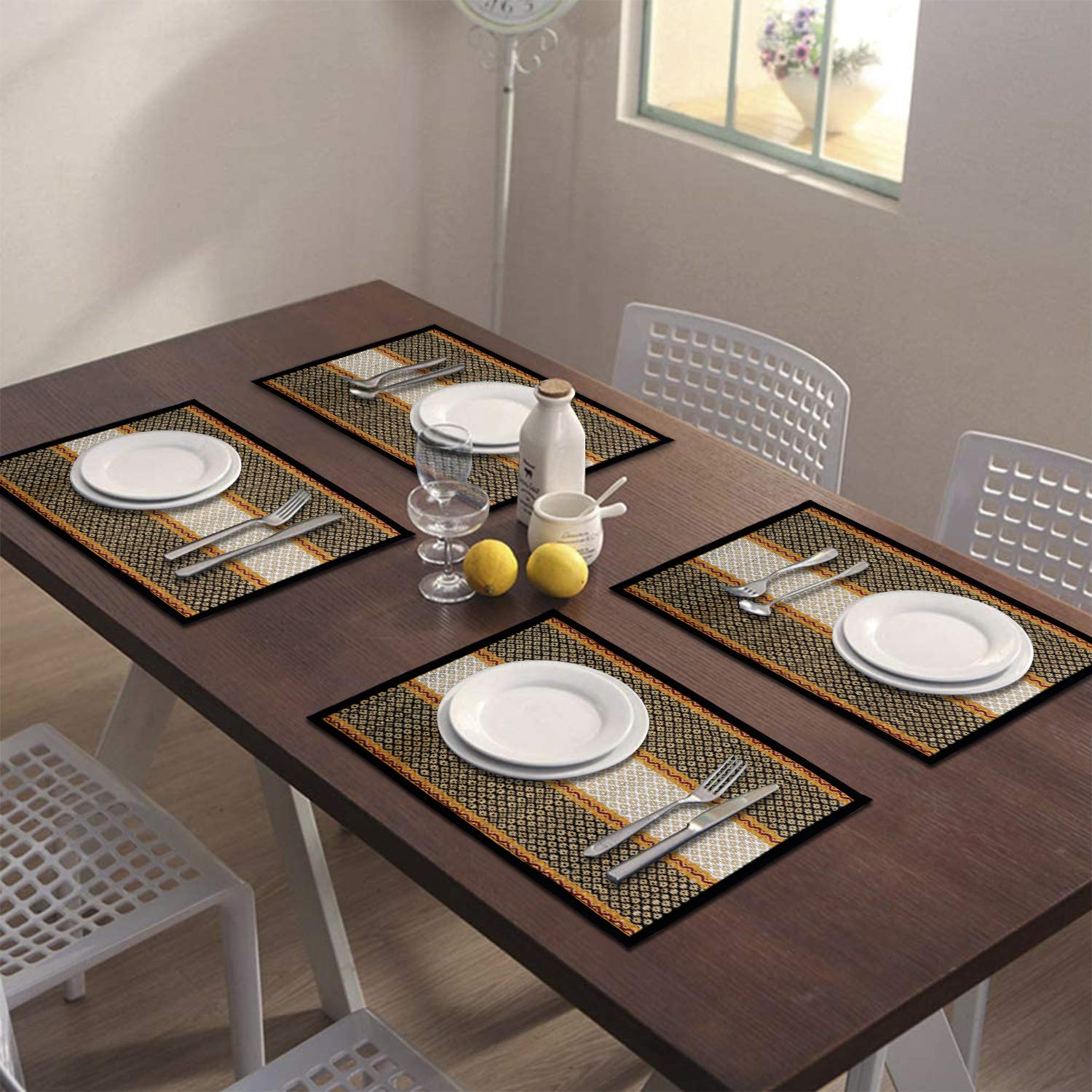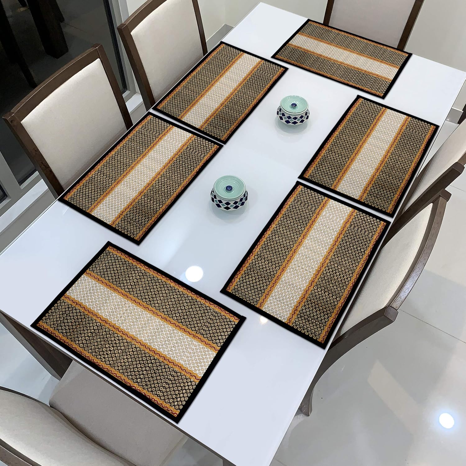 - These dining table mats are made from locally grown soft reed grass (Madurkathi) from West Bengal and woven on a bamboo loom. Cloth piping ensures zero splits on edges