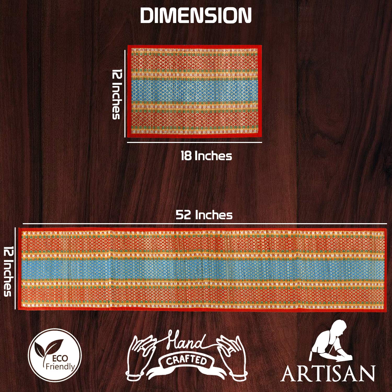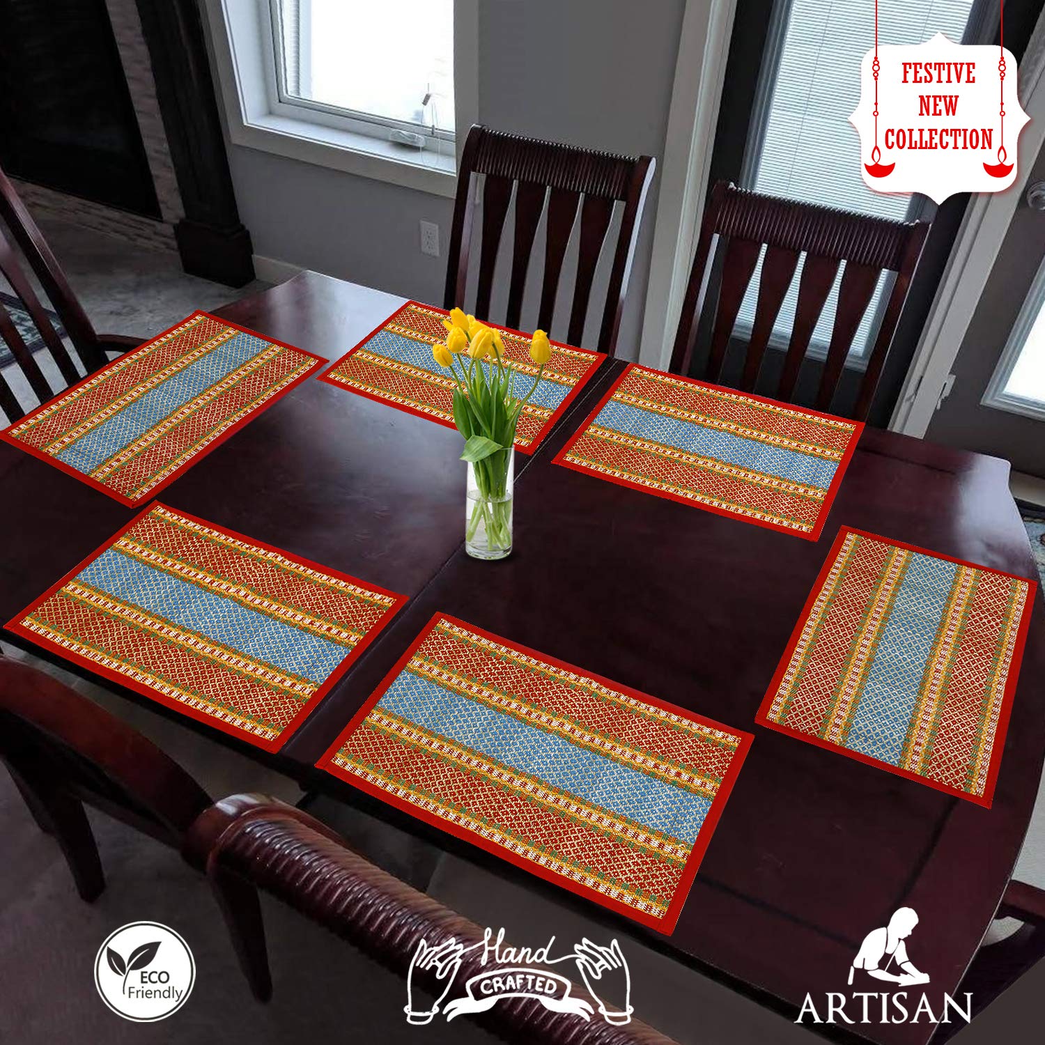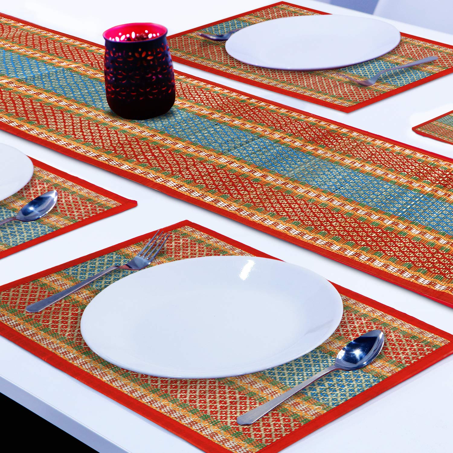 - These dining table mats are made from locally grown soft reed grass (Madurkathi) from West Bengal and woven on a bamboo loom. Cloth piping ensures zero splits on edges
