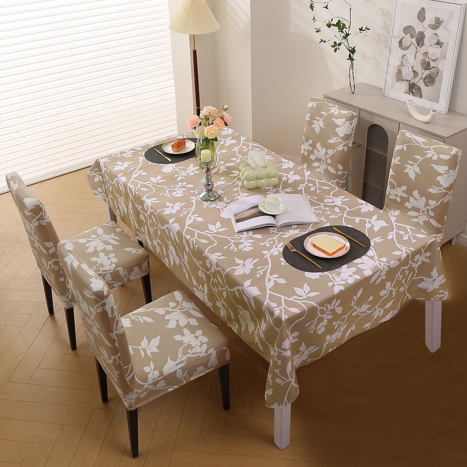Elastic Dining Chair Covers with Matching Tablecloth, Buff Brown Sillehoute Floral