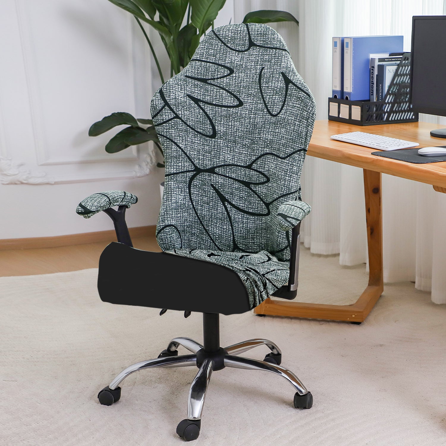 Printed Gaming Chair Seat Cover Elastic Computer Rotating Chair, Intense Grey Abstract Floral