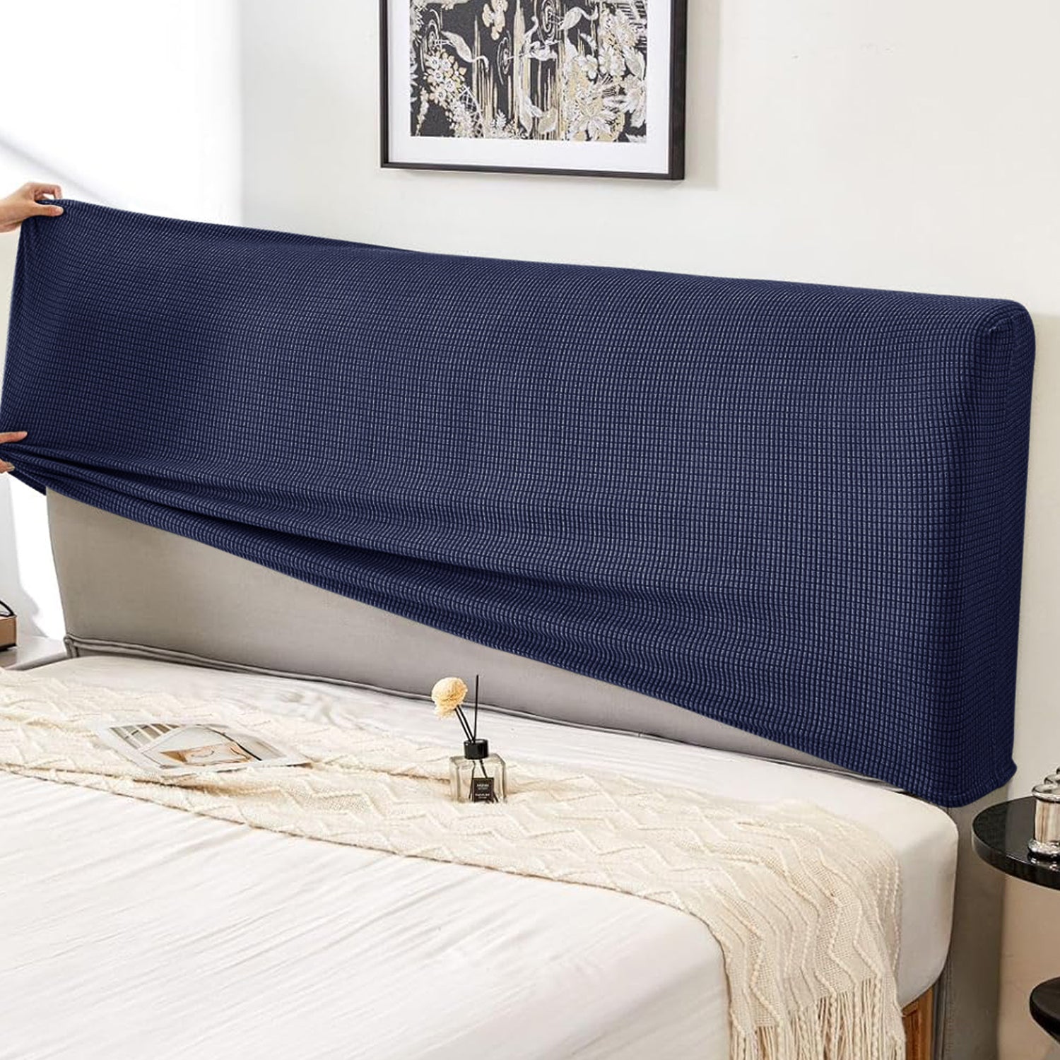 HOKIPO Jacquard Stretchable Bed Headboard Cover, Navy Blue