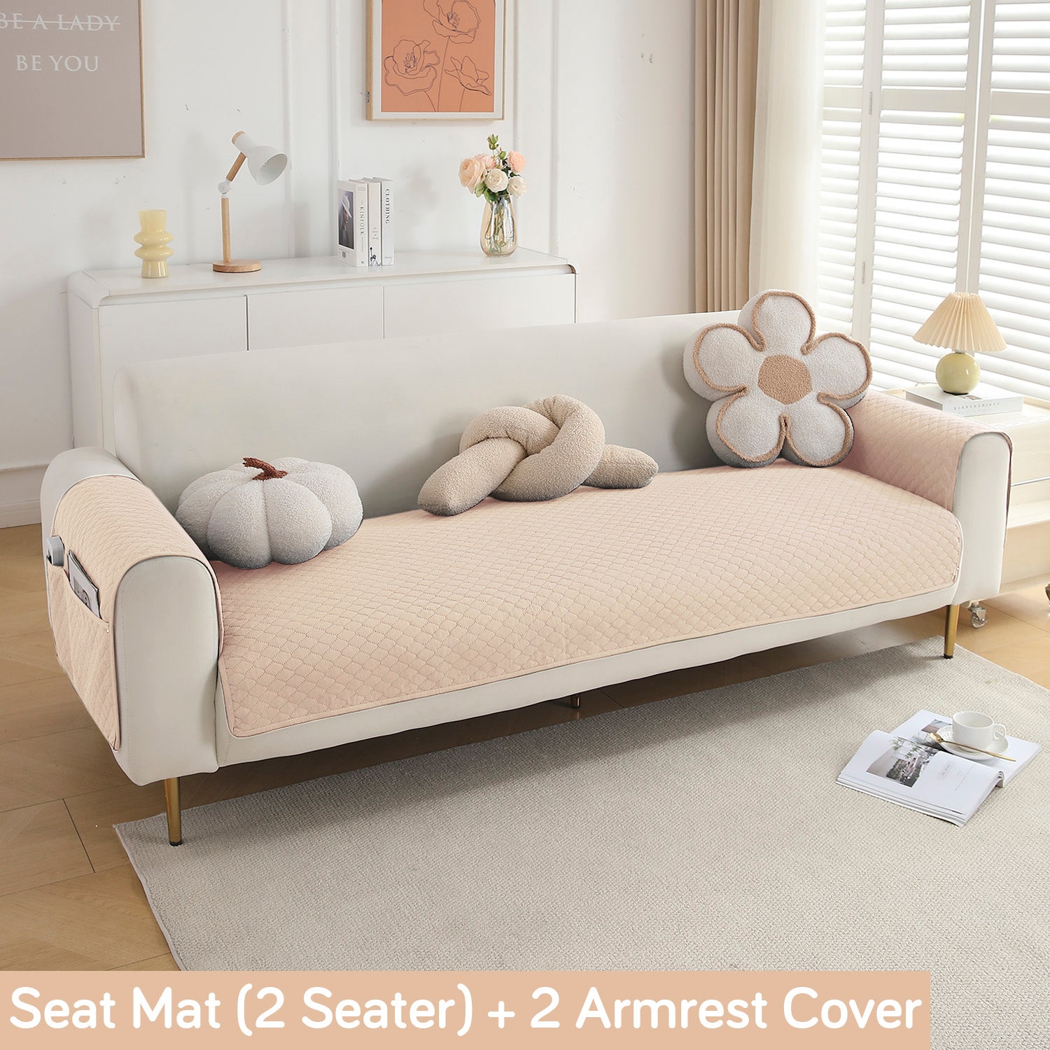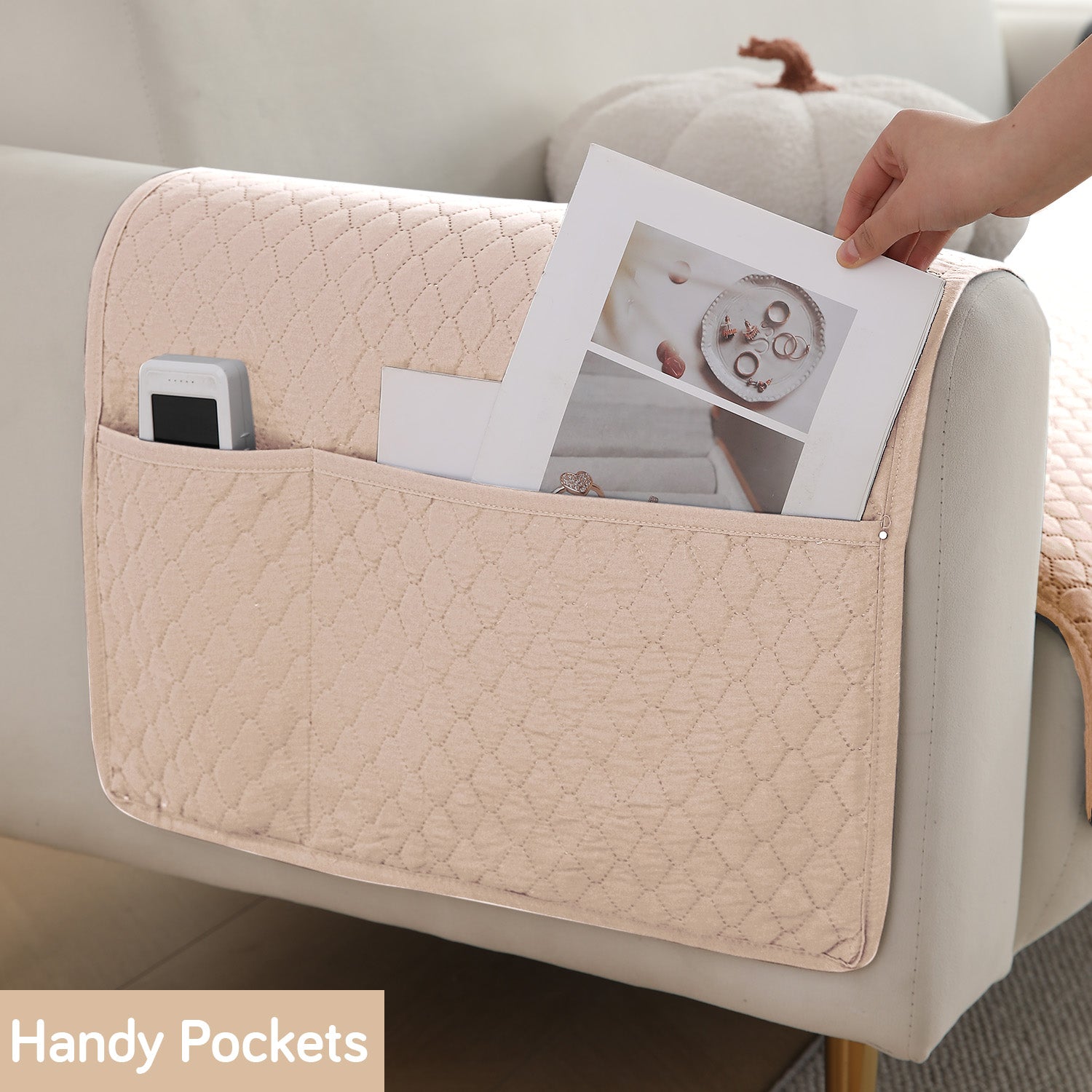 Quilted Sofa Cover Mat with 2 Armrest Covers Pockets, Beige