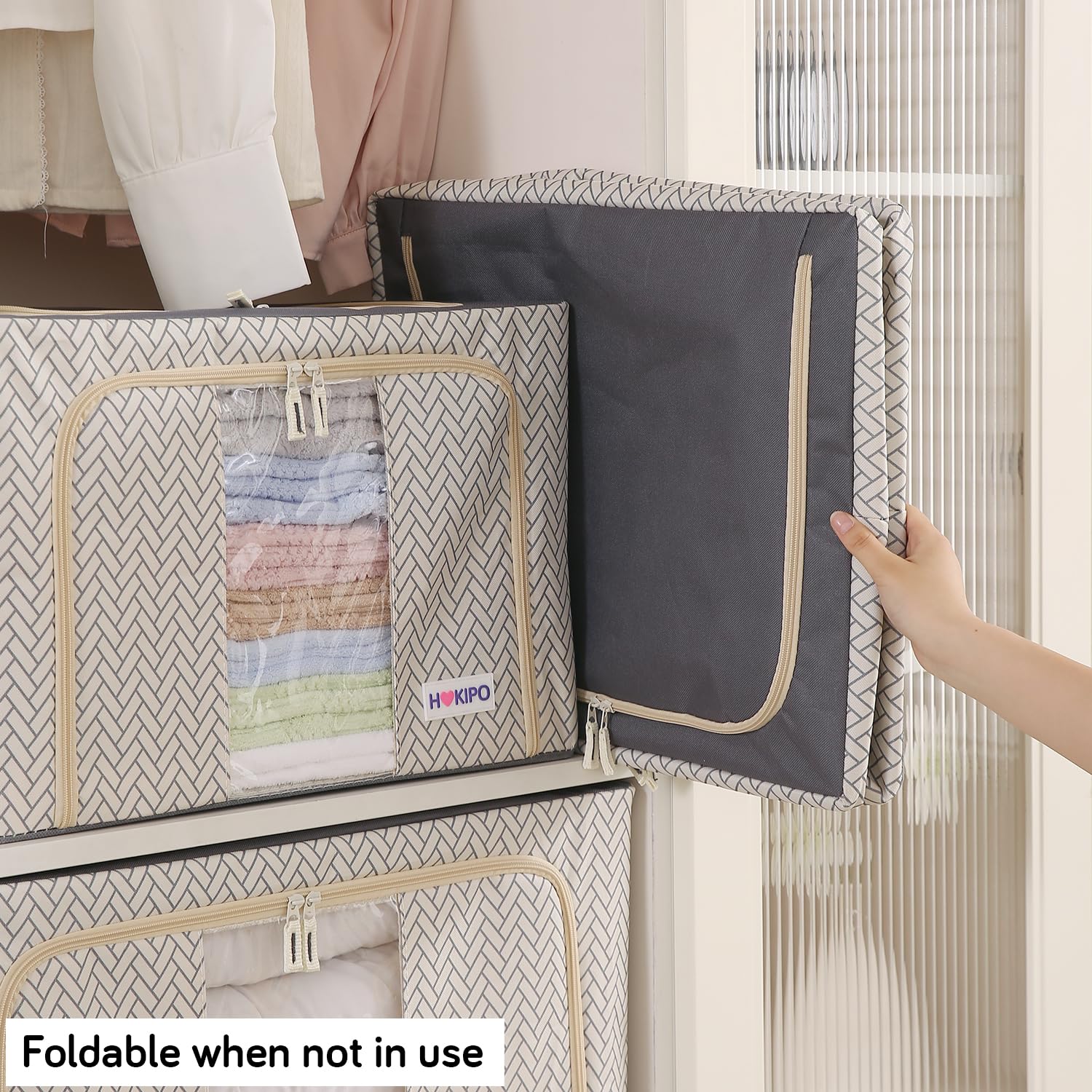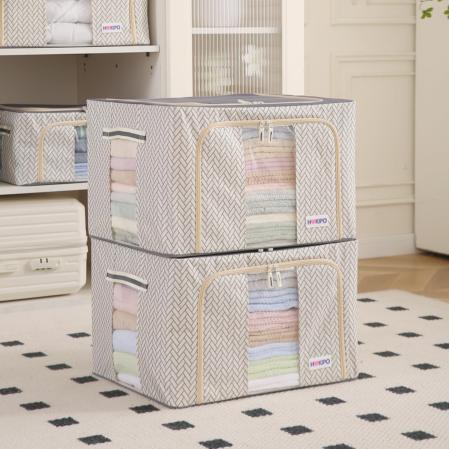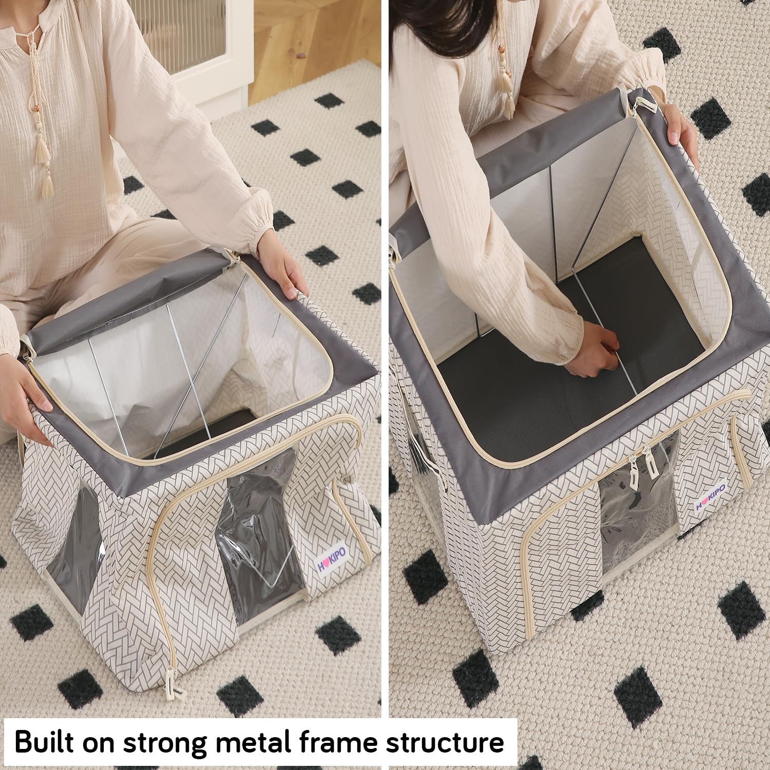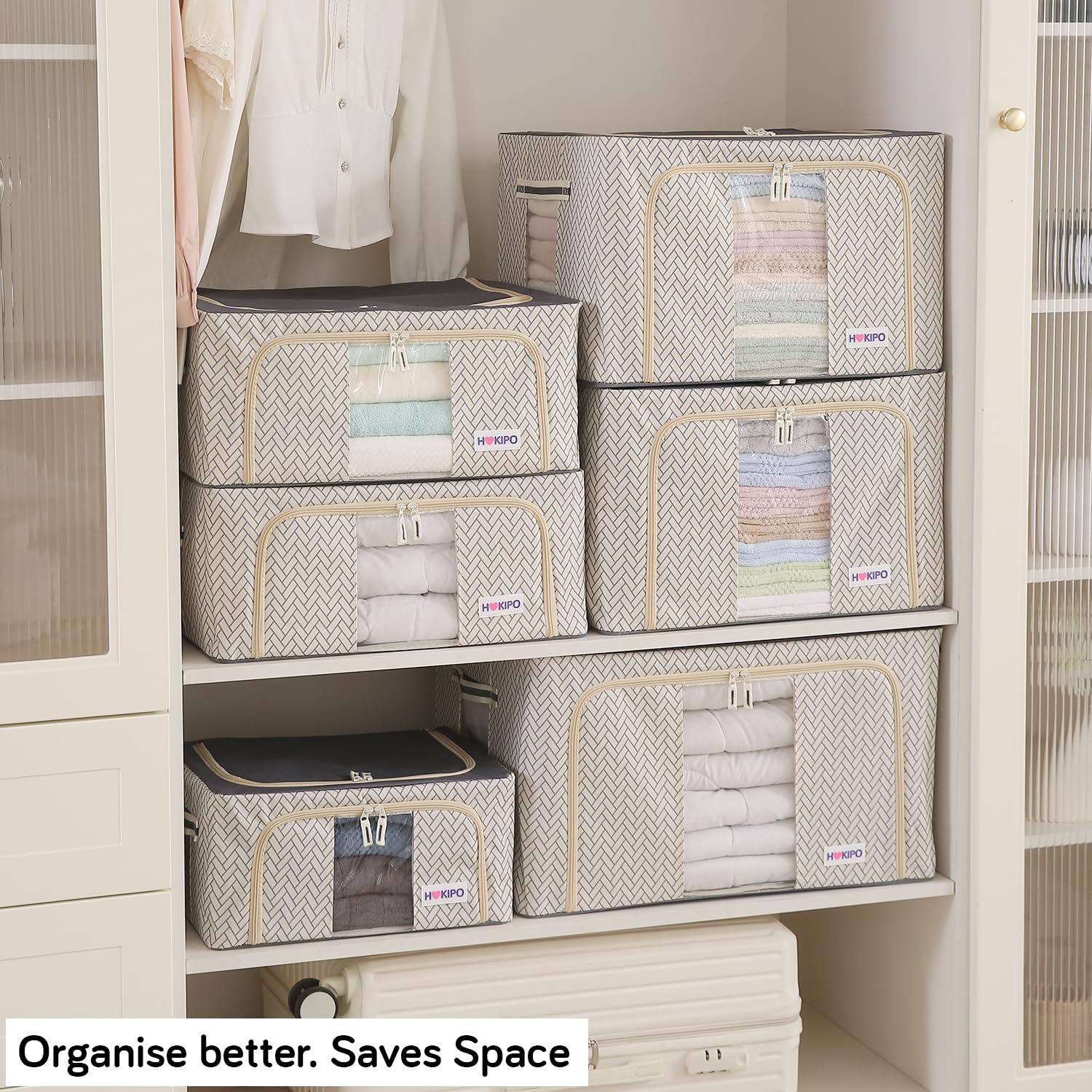 Wardrobe Organizer Storage Box | Foldable Cloth Storage Boxes with Metal Frame & Window | 600D Oxford Fabric, Cream Mist