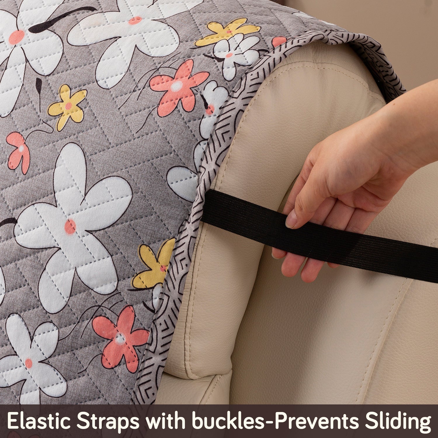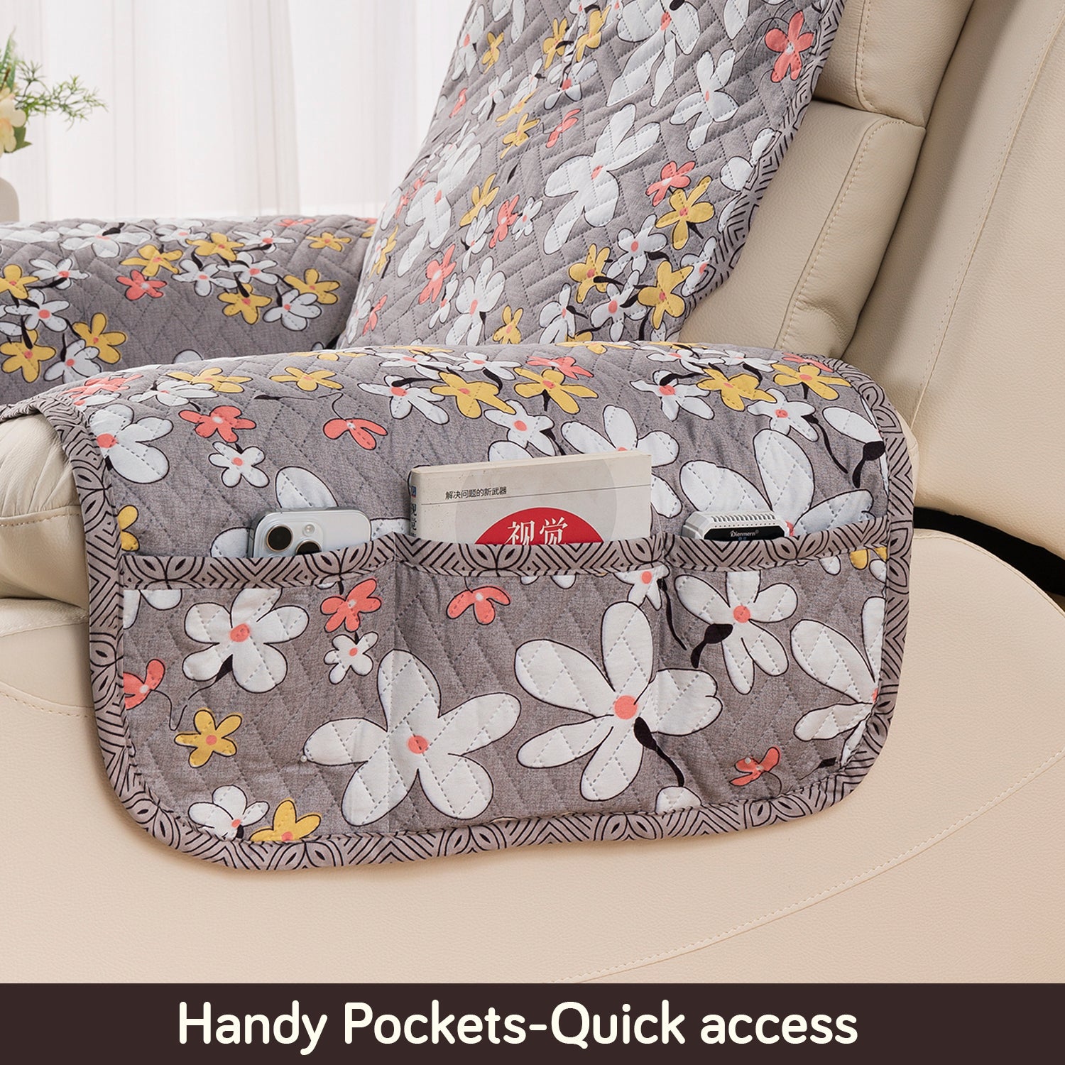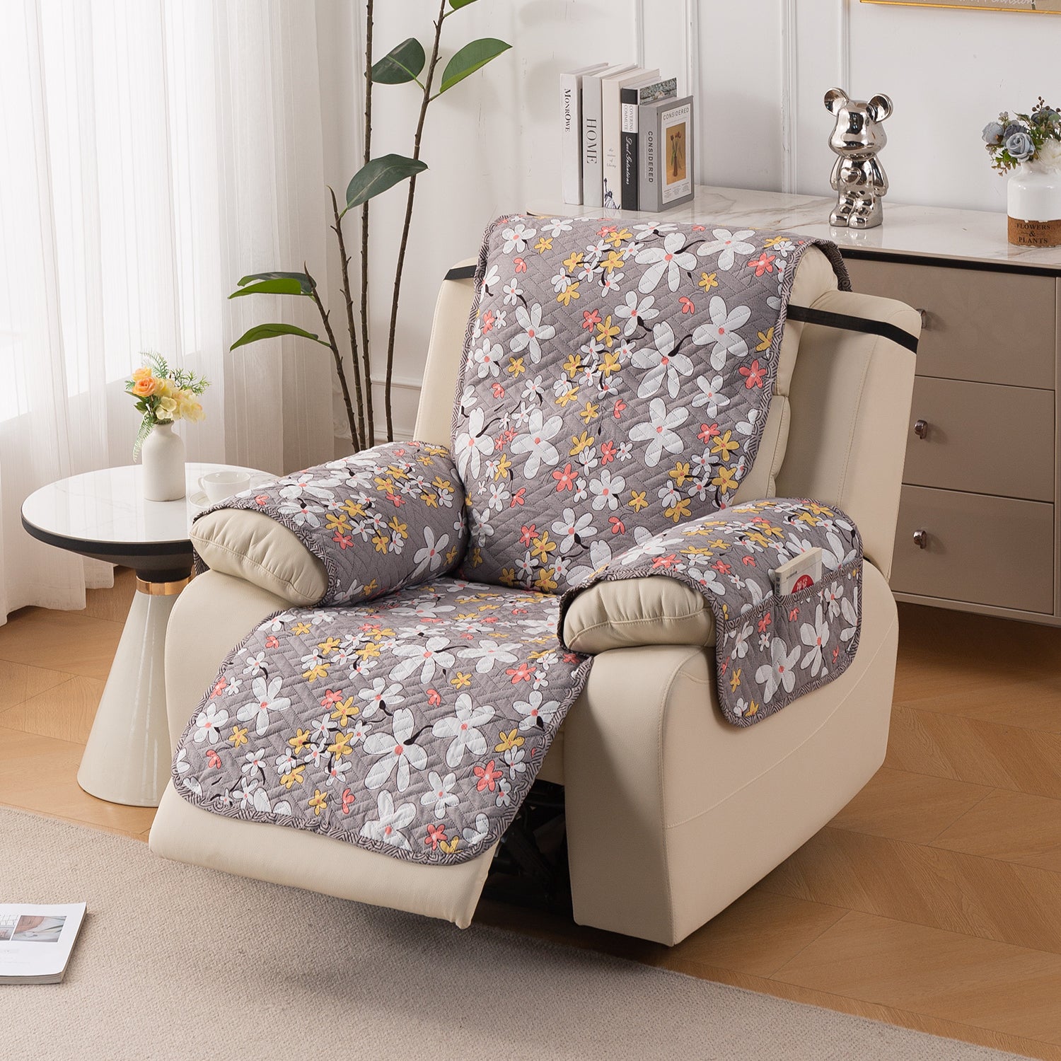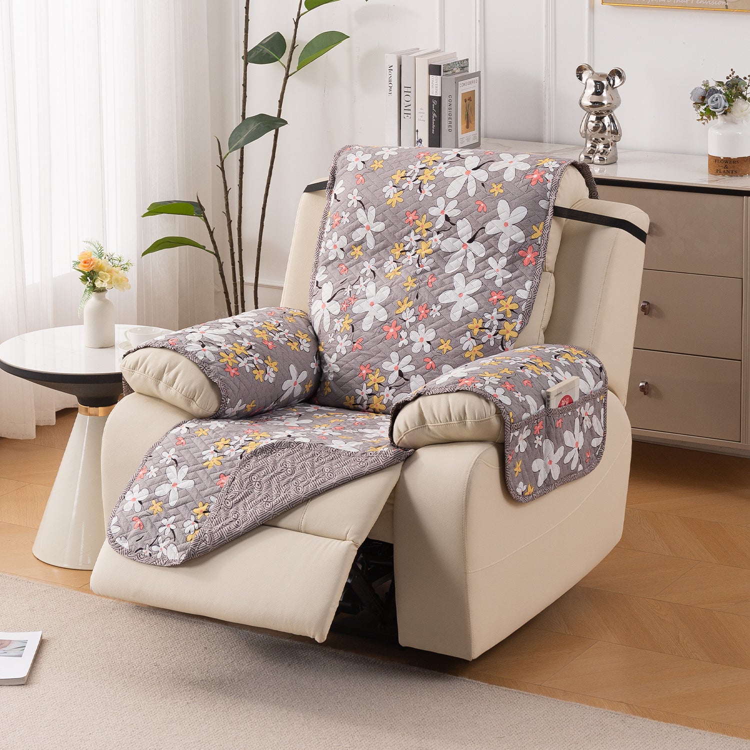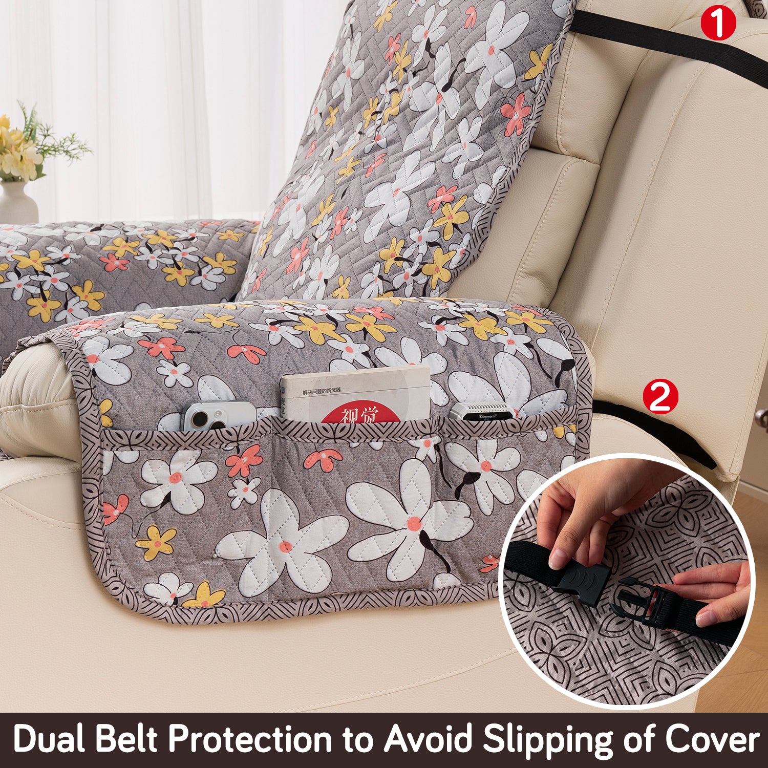 Quilted Cover for Recliner Sofa with SecureFit Belt & Side Pocket, Pastel Brown Sandwort Flower