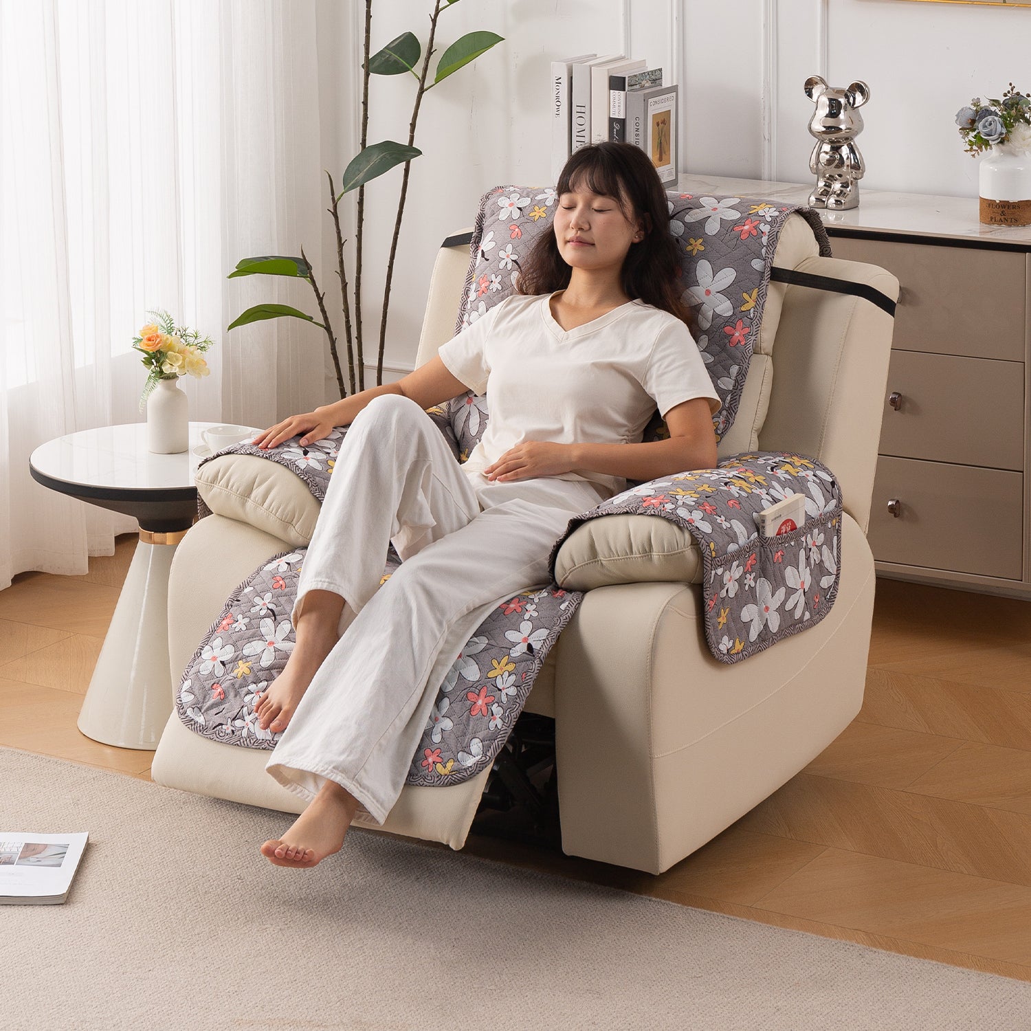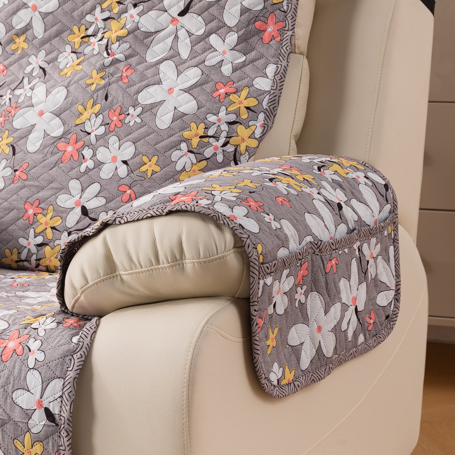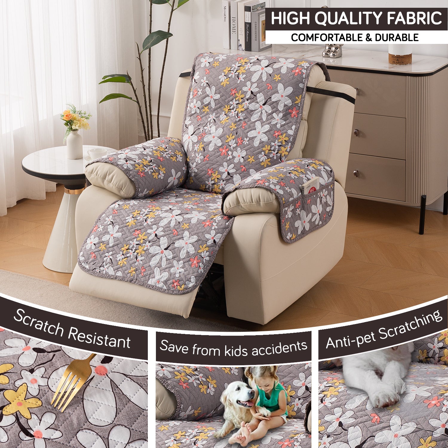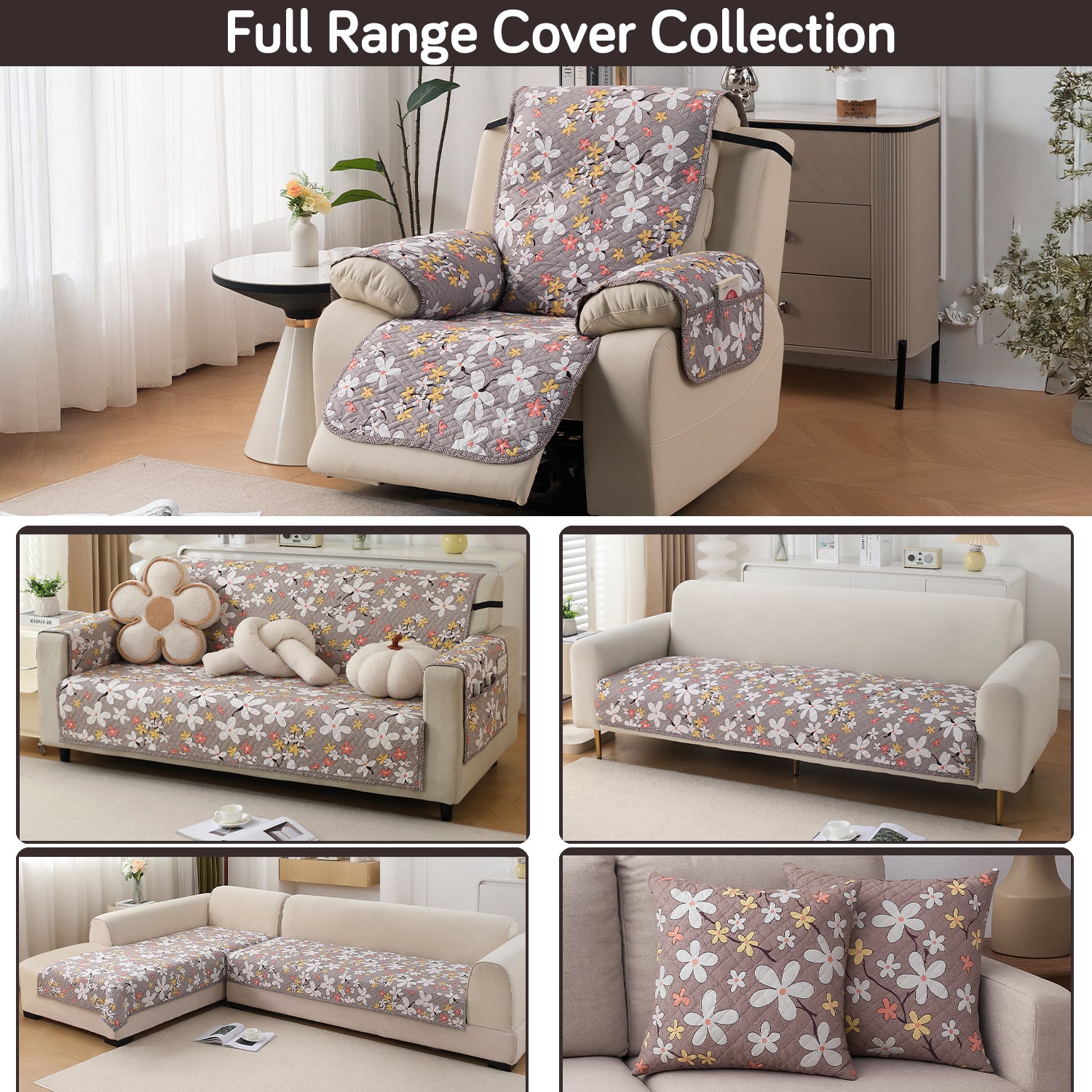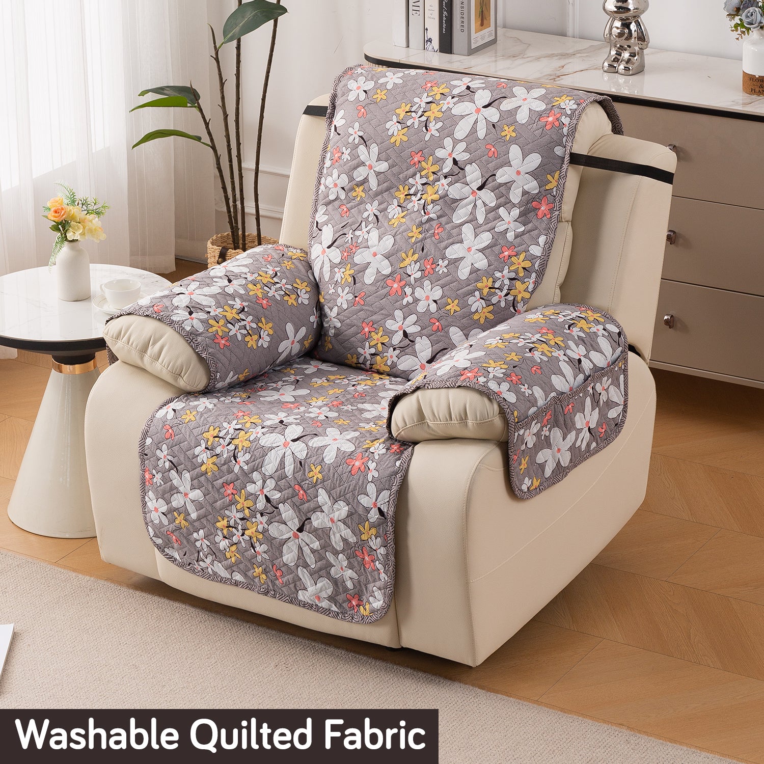 Quilted Cover for Recliner Sofa with SecureFit Belt & Side Pocket, Pastel Brown Sandwort Flower