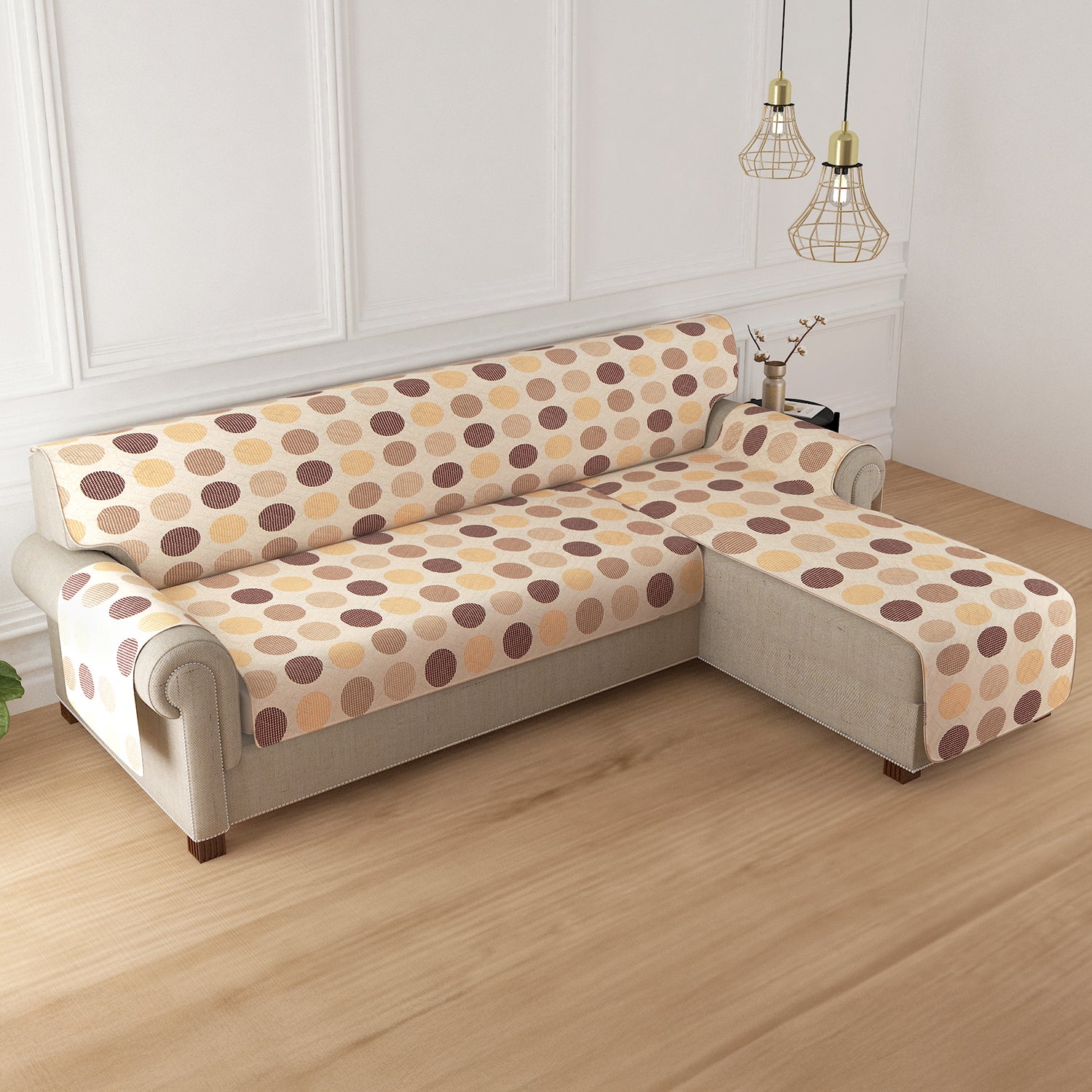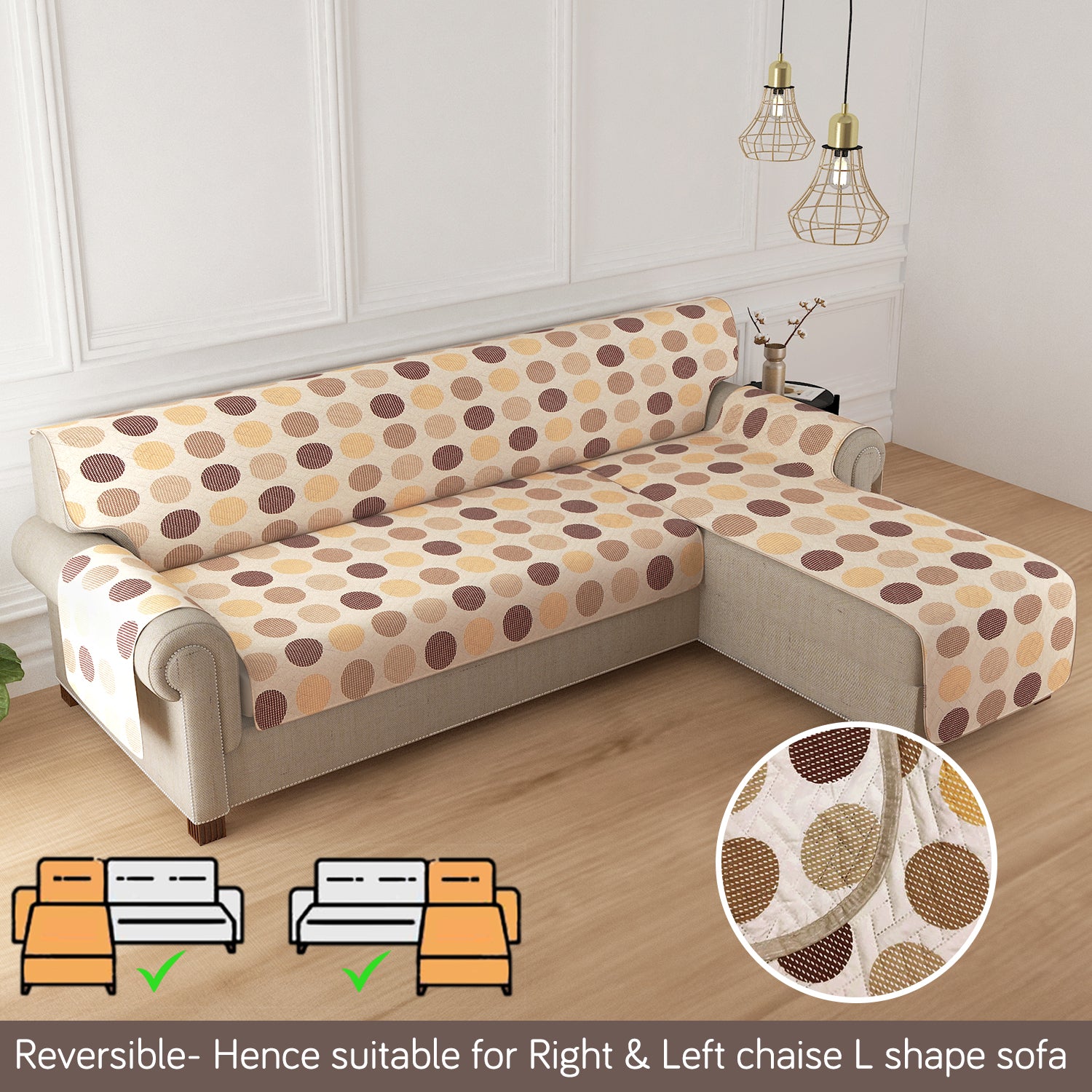 HomeHues Series Quilted Sofa Cover with Secure Fit Belt for L Shape sofa, Brown Polka Dot