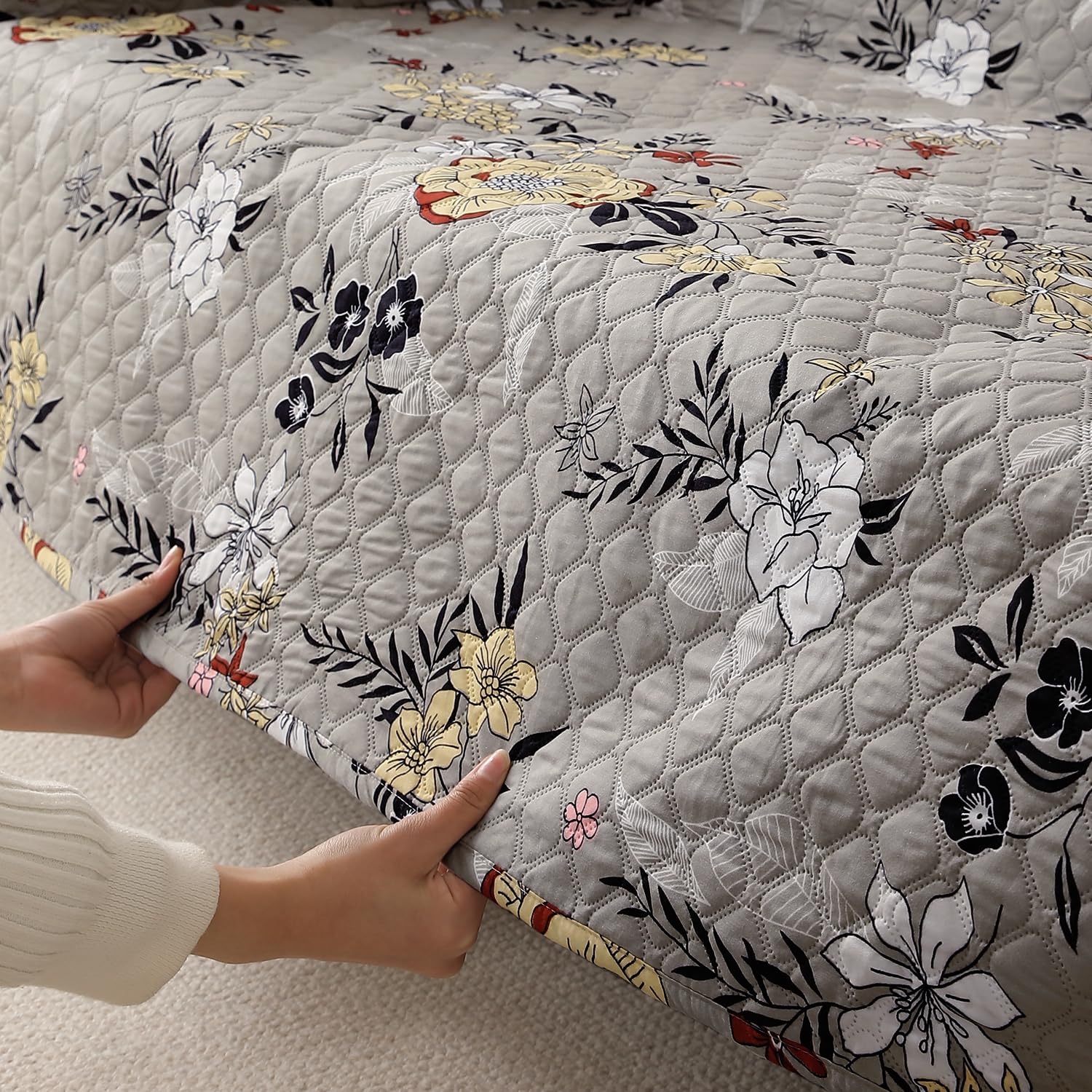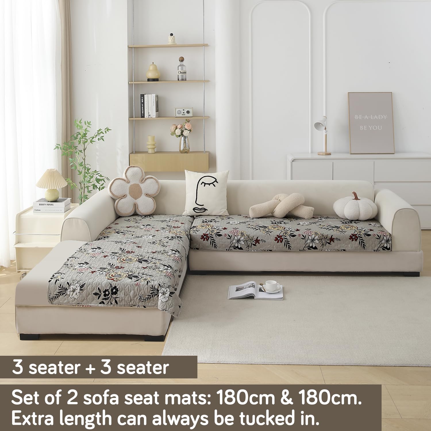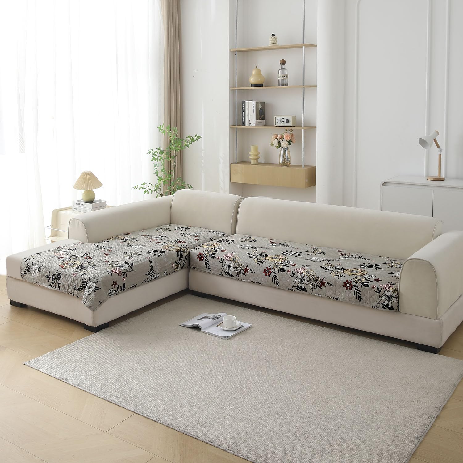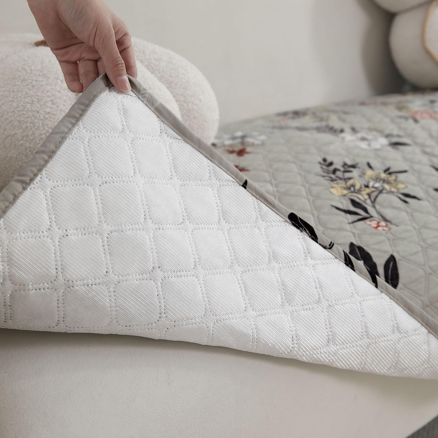 L Shape Sofa Cover Mat for 2+2/3+2/3+3 Seater, Quilted Printed Floral Ash Grey