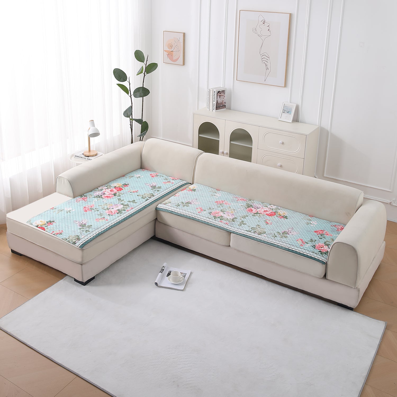 LiefNest Printed Holland Velvet L Shape Sofa Seat Mat with Foam Filling - Fresh Floral Pastel Blue