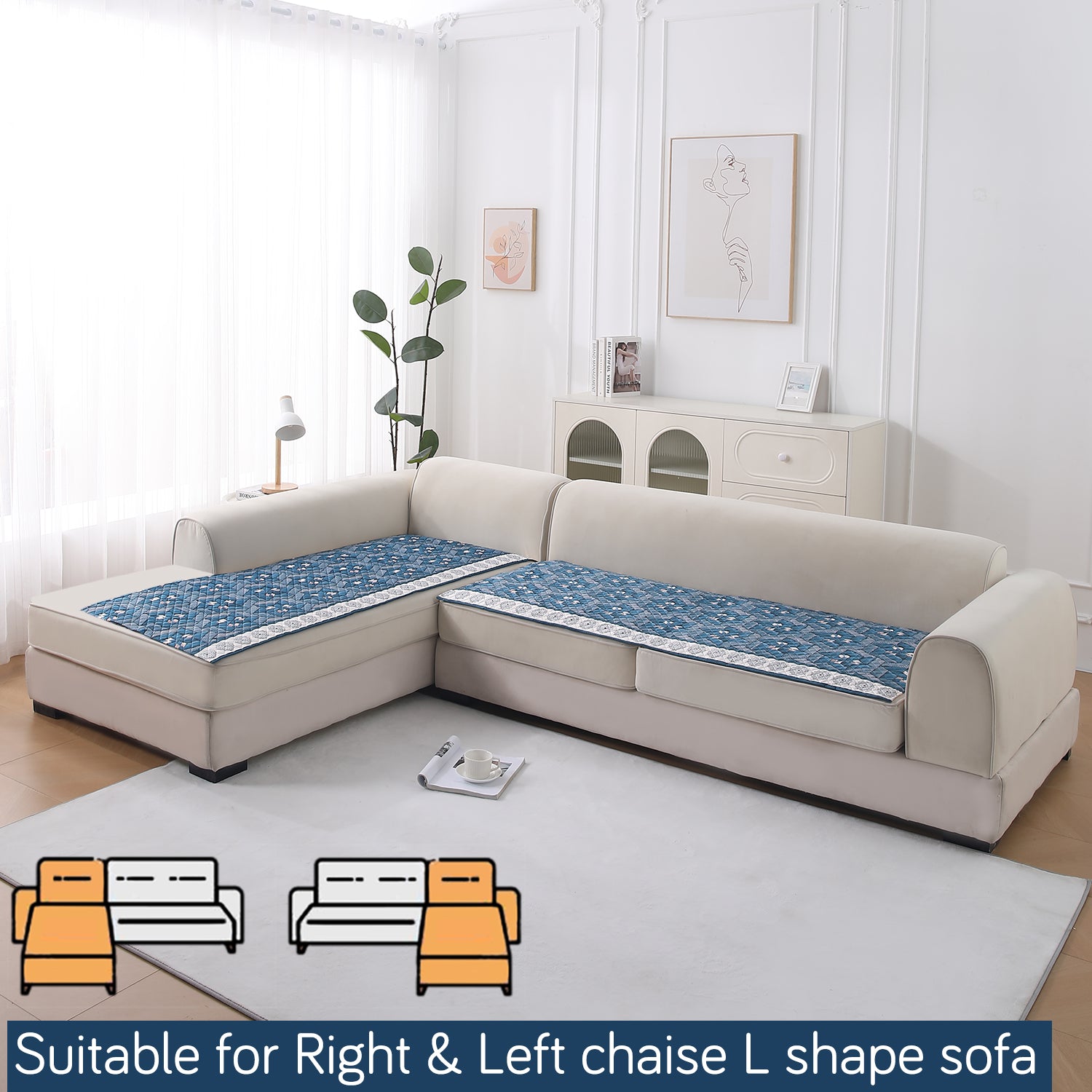 Perfect Fit: Quilted L-shape sofa mat for 2+2 seater (120 cm + 150 cm), 3+2 seater (180 cm + 150 cm), 3+3 seater (180 cm + 150 cm) ; extra length tucks in neatly.