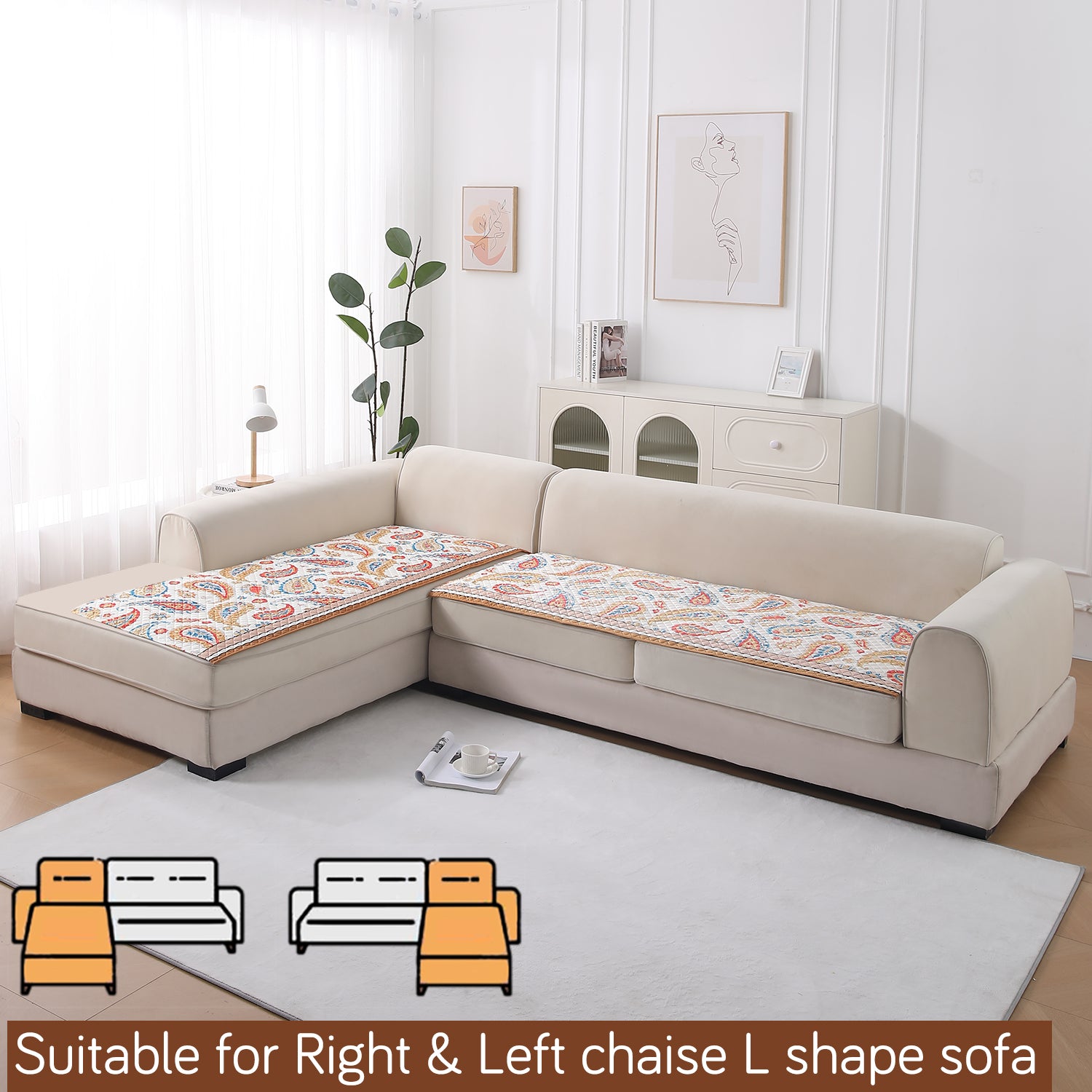 Perfect Fit: Quilted L-shape sofa mat for 2+2 seater (120 cm + 150 cm), 3+2 seater (180 cm + 150 cm), 3+3 seater (180 cm + 150 cm) ; extra length tucks in neatly.