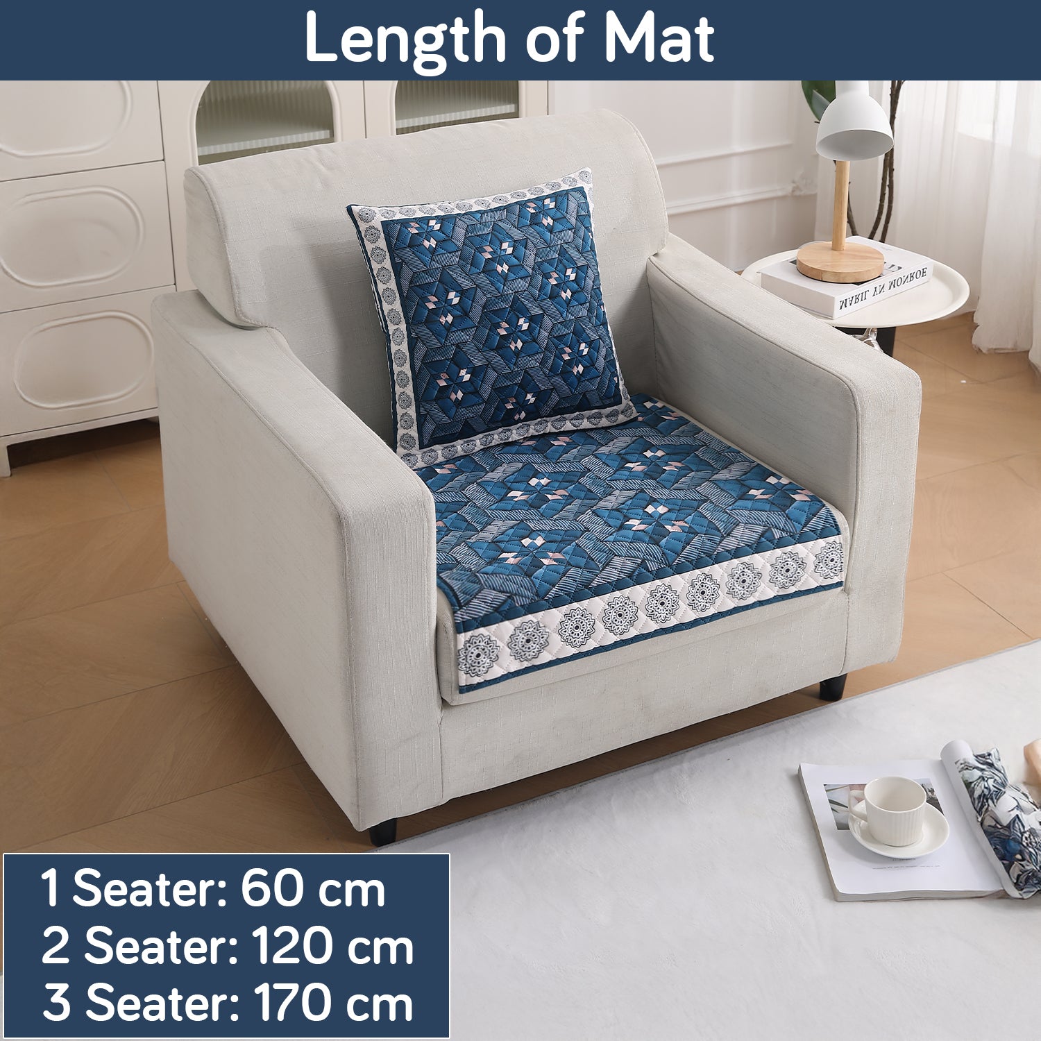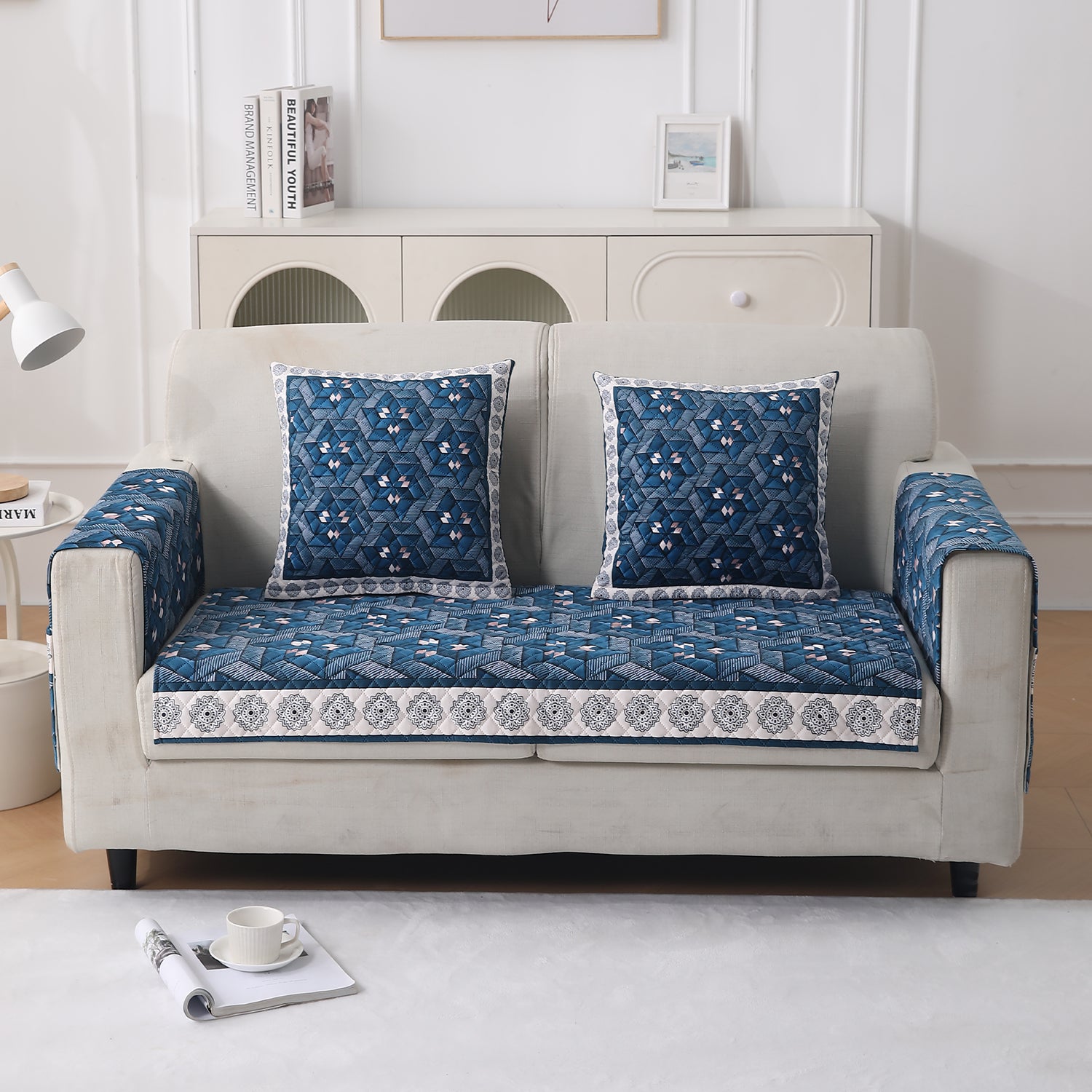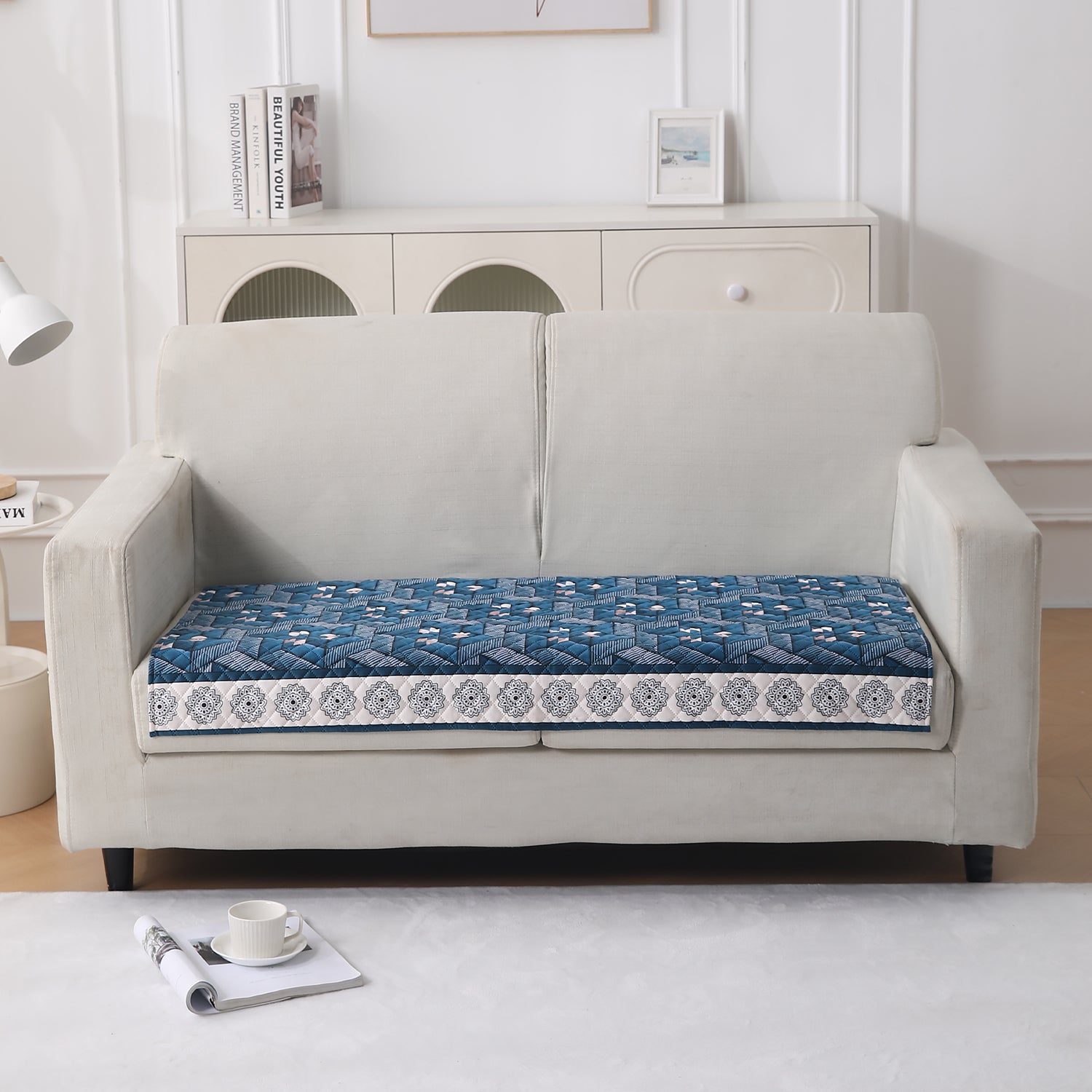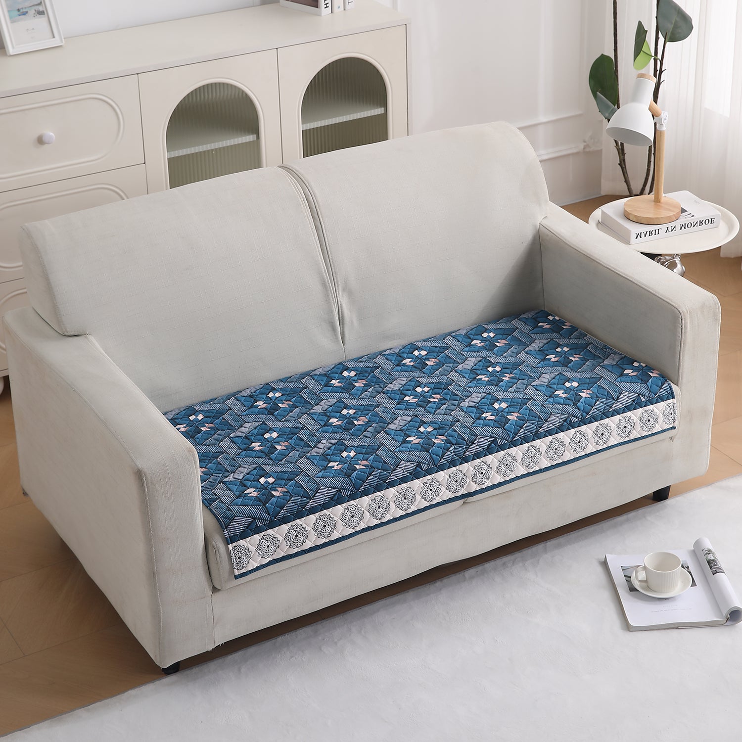 LiefNest Printed Holland Velvet Sofa Mat with Foam Filling - Geometric Floral Oriental Blue for 1/2/3 Seater & Armrest