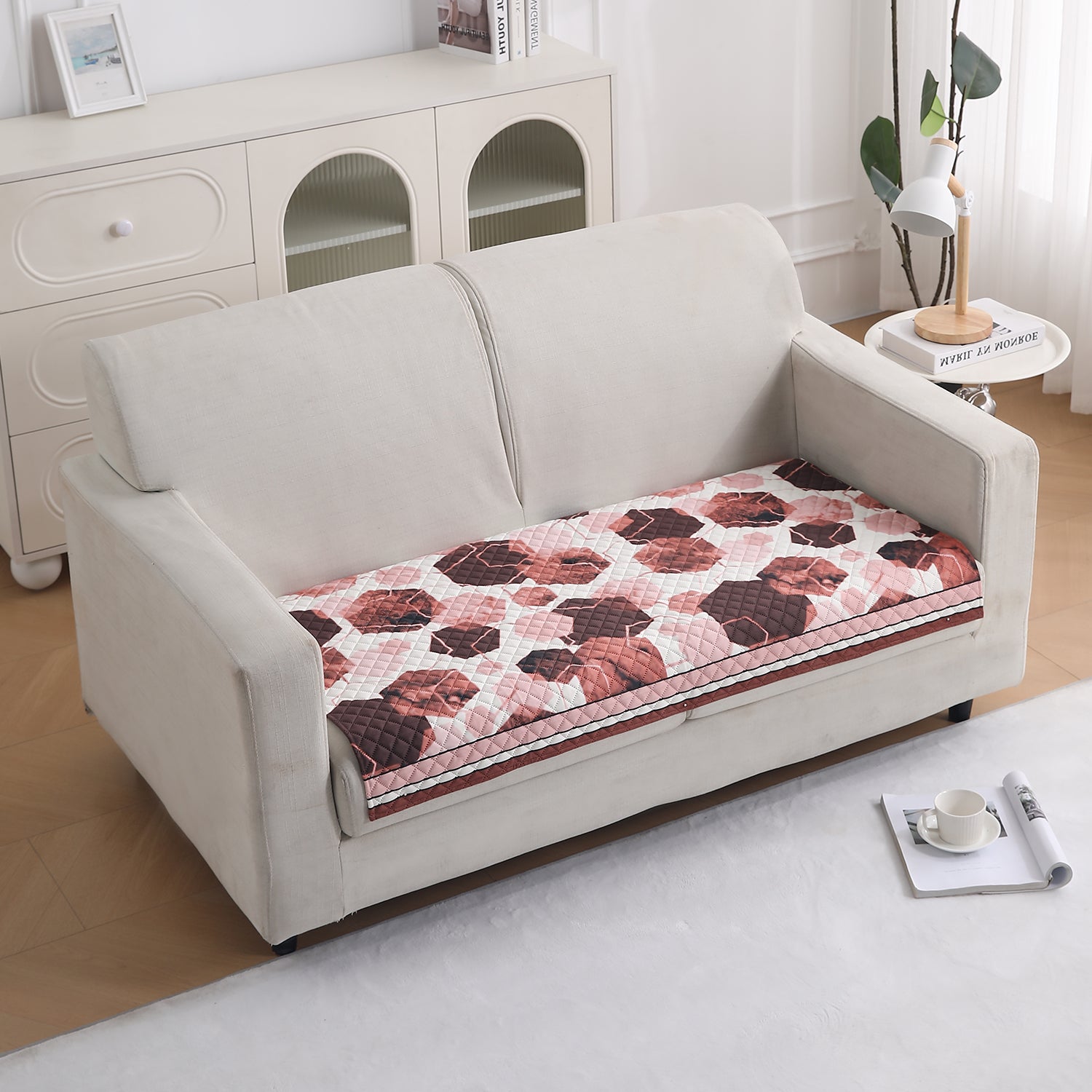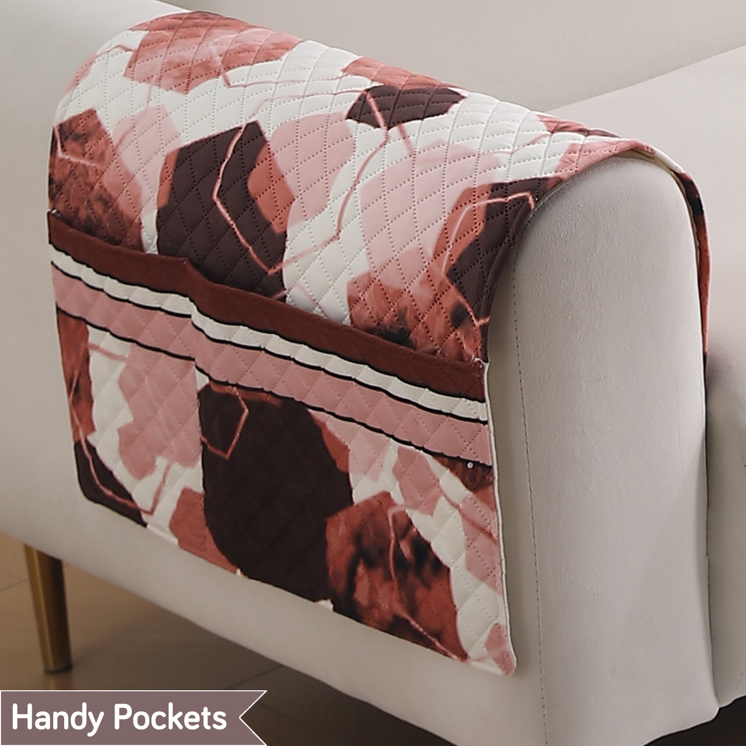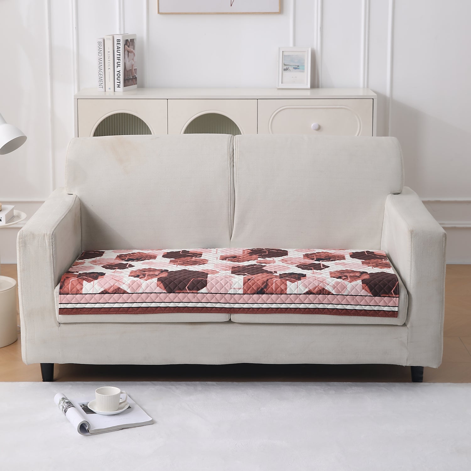 LiefNest Printed Holland Velvet Sofa Mat with Foam Filling - Geometric Hexagon Cider Red for 1/2/3 Seater & Armrest