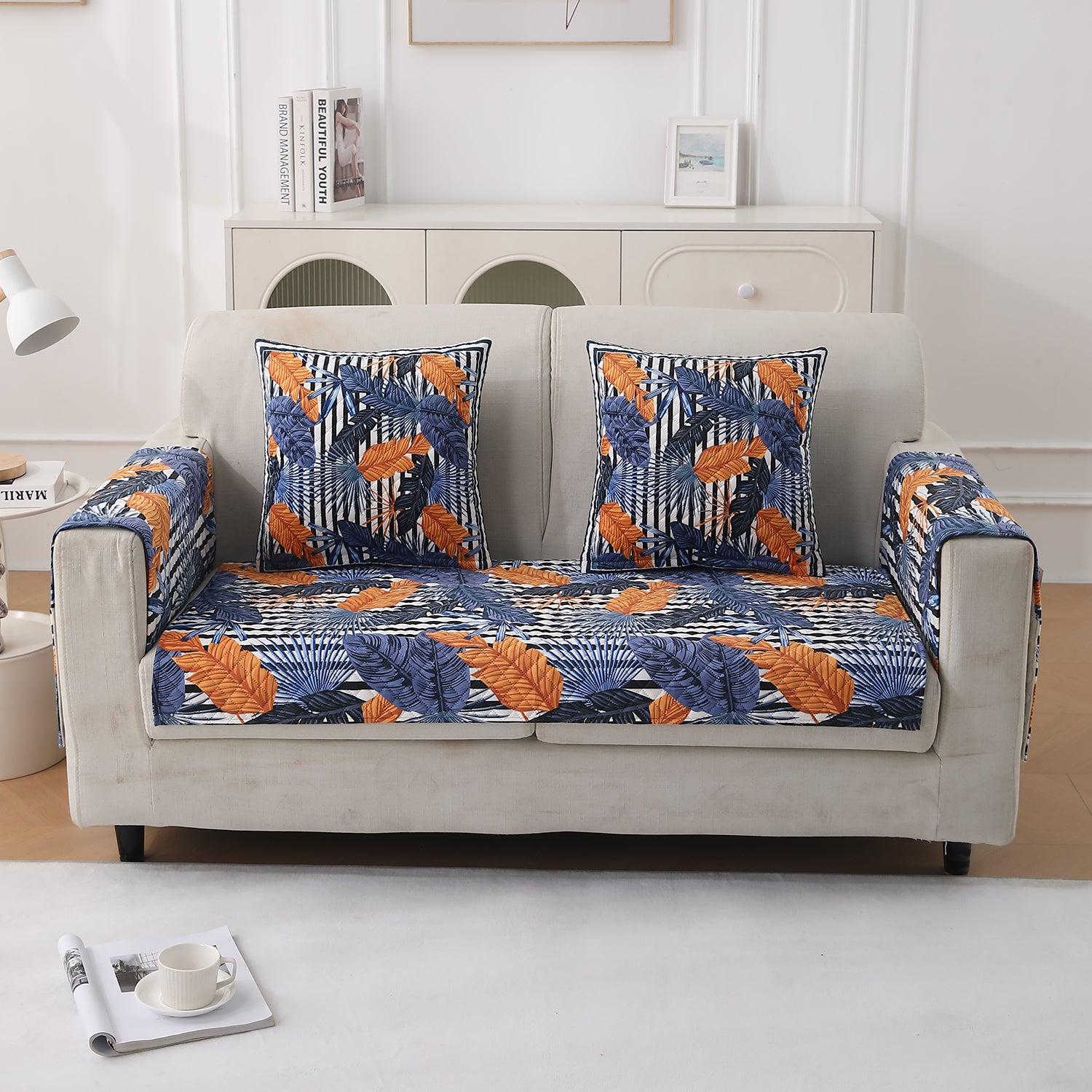LiefNest Printed Holland Velvet Sofa Mat with Foam Filling - Tropical Leaves Dusk Blue for 1/2/3 Seater & Armrest