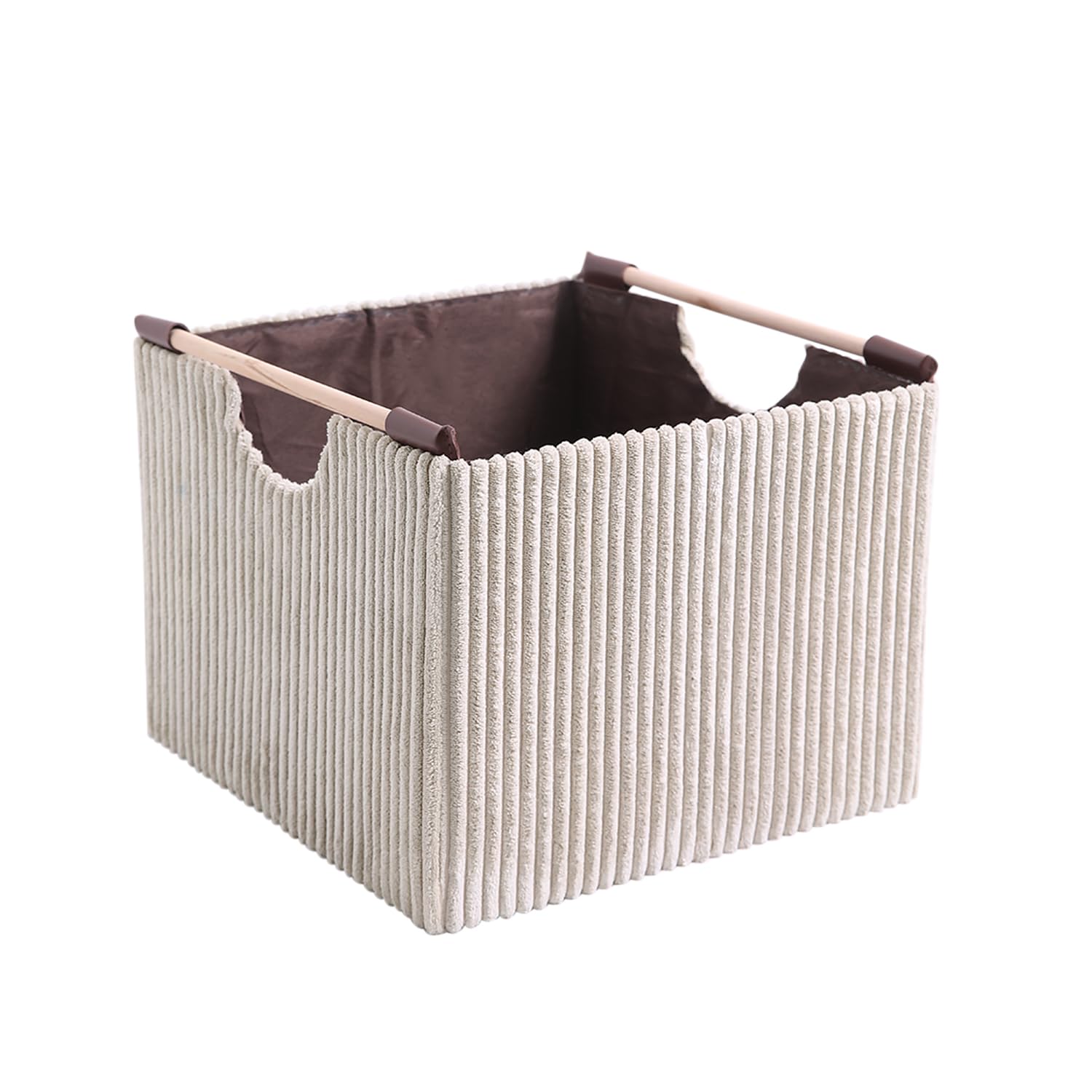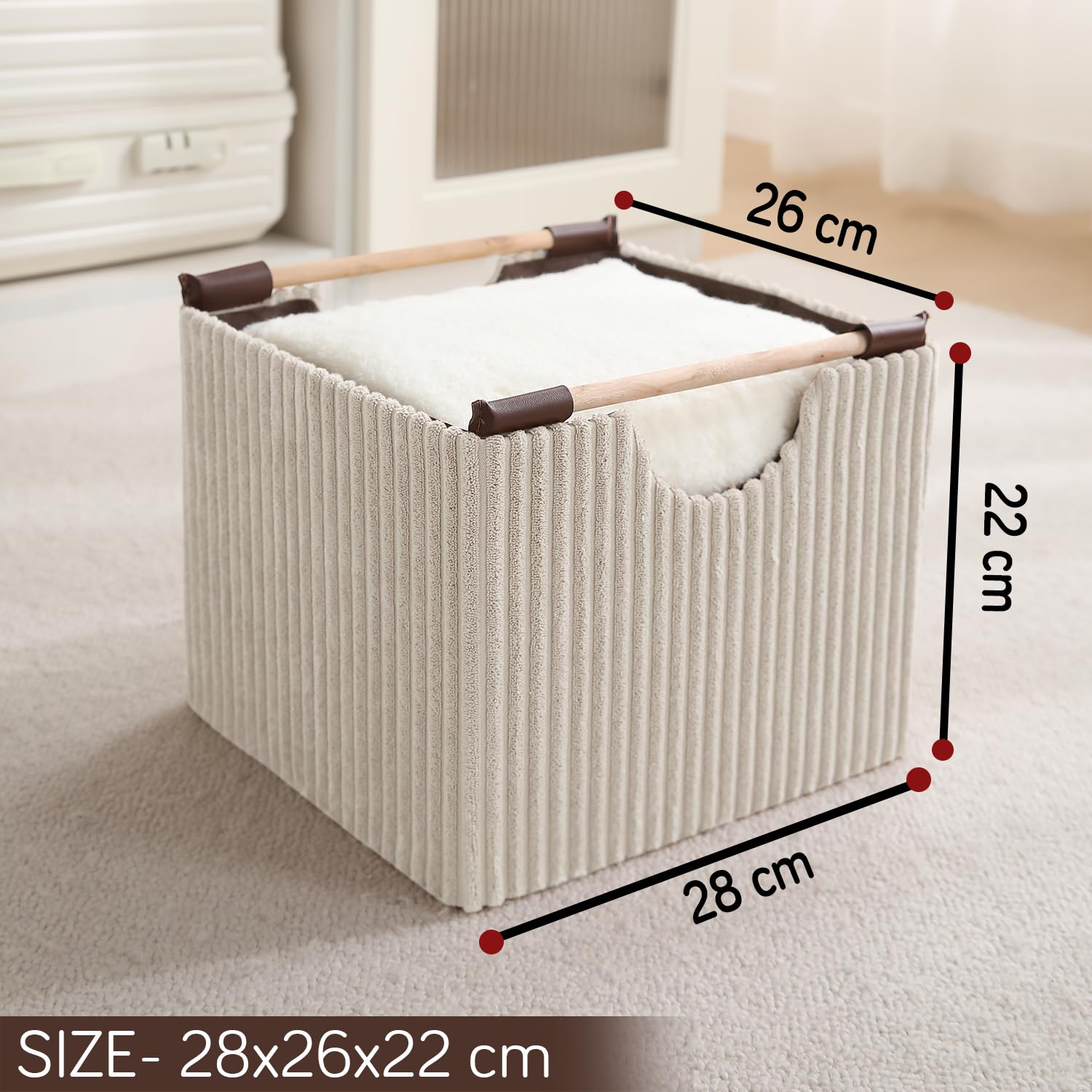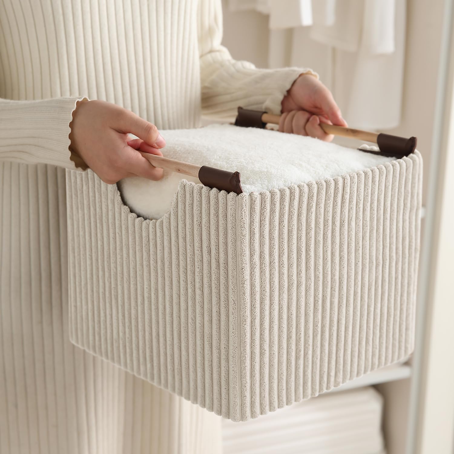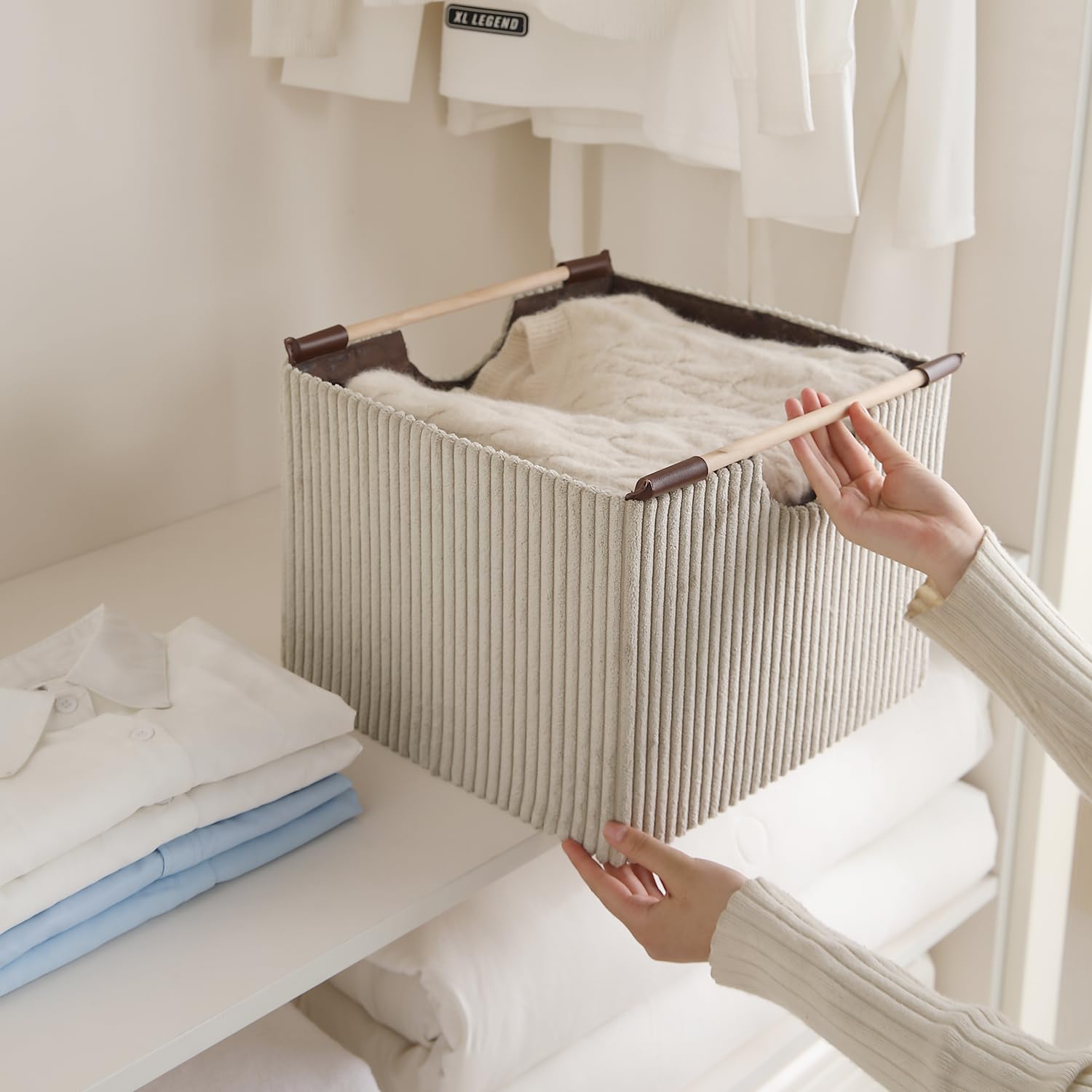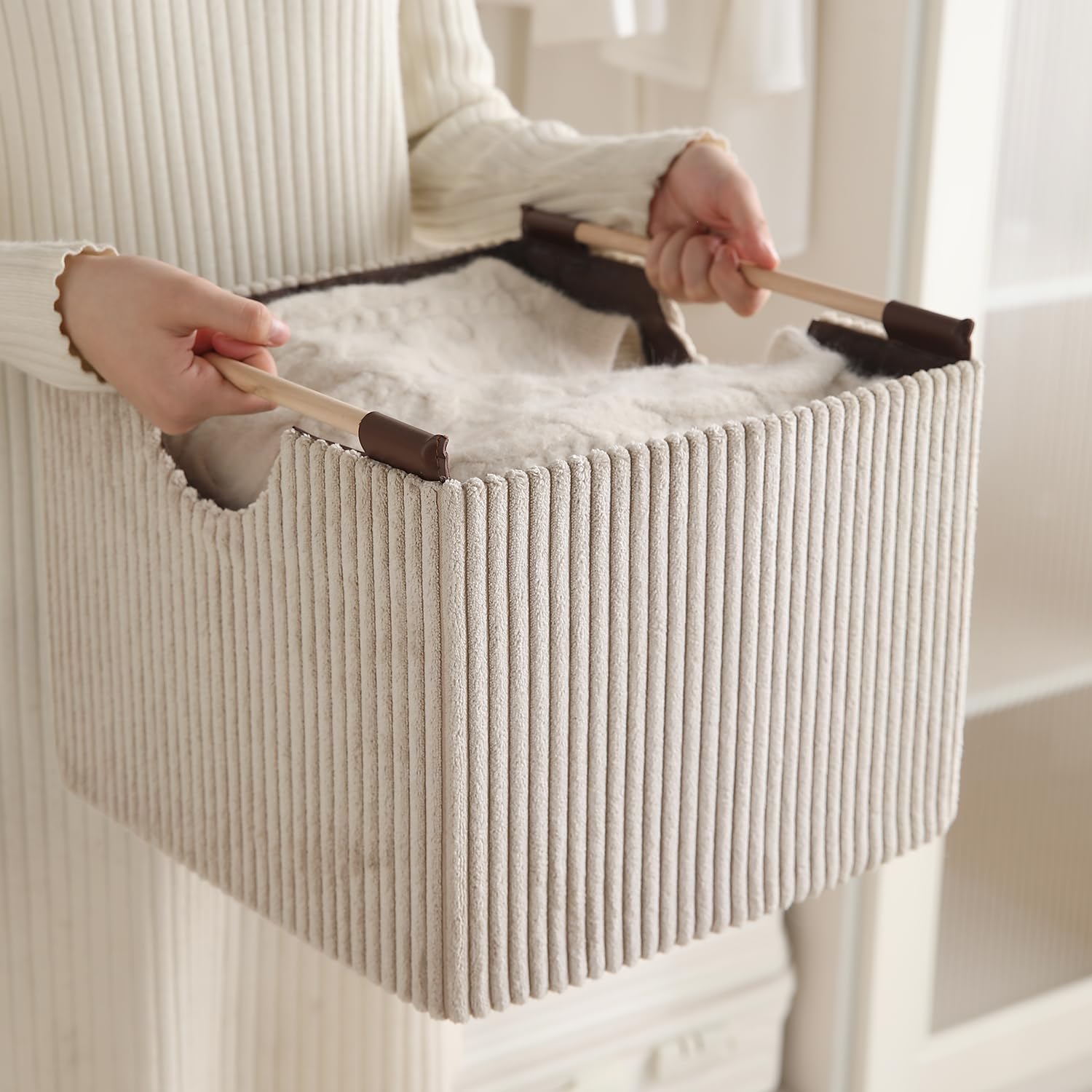 Premium Foldable Storage Bin with Wooden Handles | Corduroy Fabric Organizer Box for Wardrobe, Books, Clothes & Misc Items, Camel