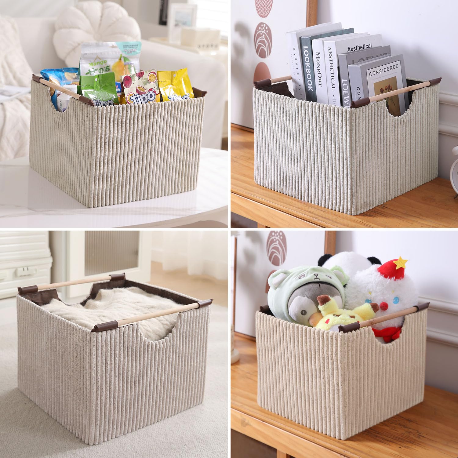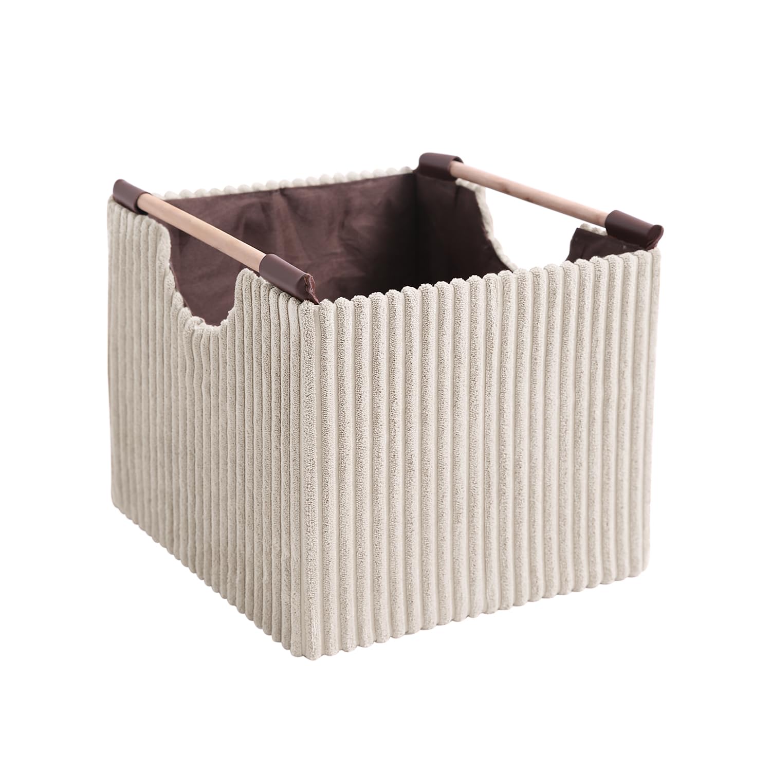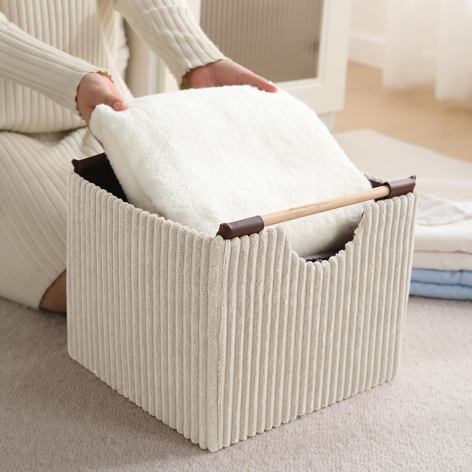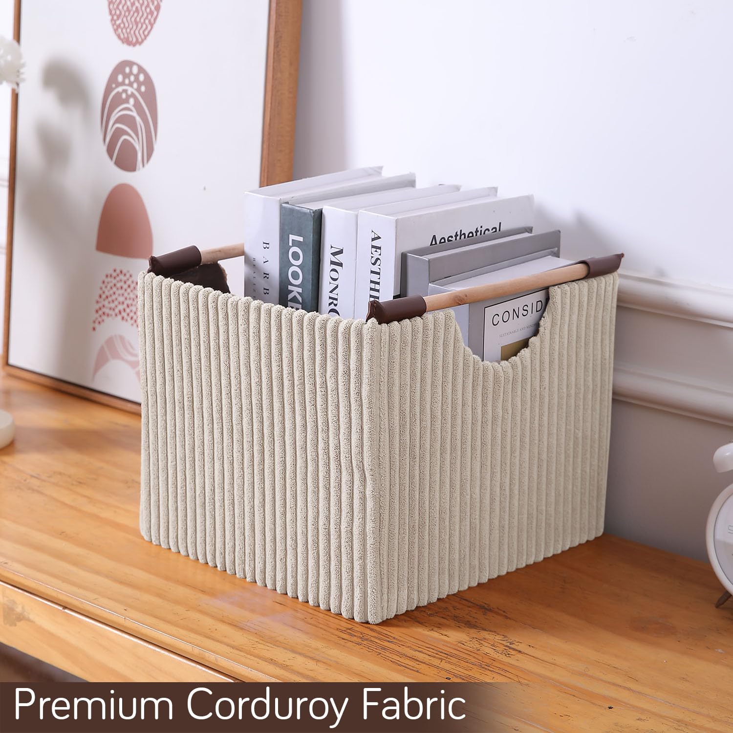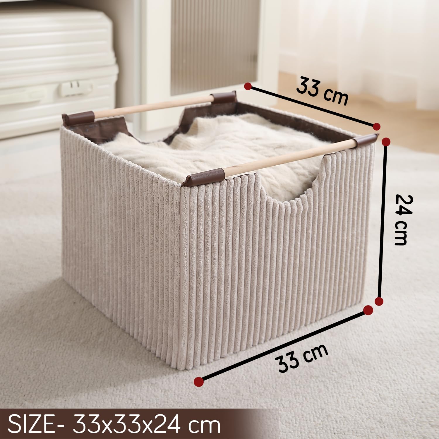 Premium Foldable Storage Bin with Wooden Handles | Corduroy Fabric Organizer Box for Wardrobe, Books, Clothes & Misc Items, Camel