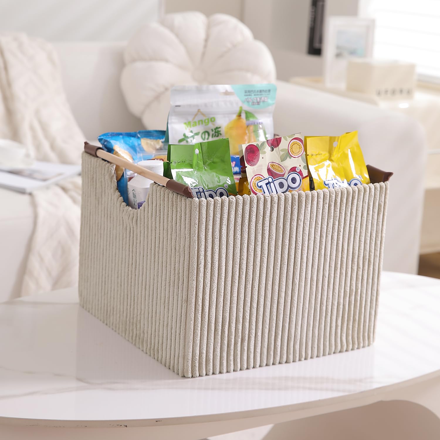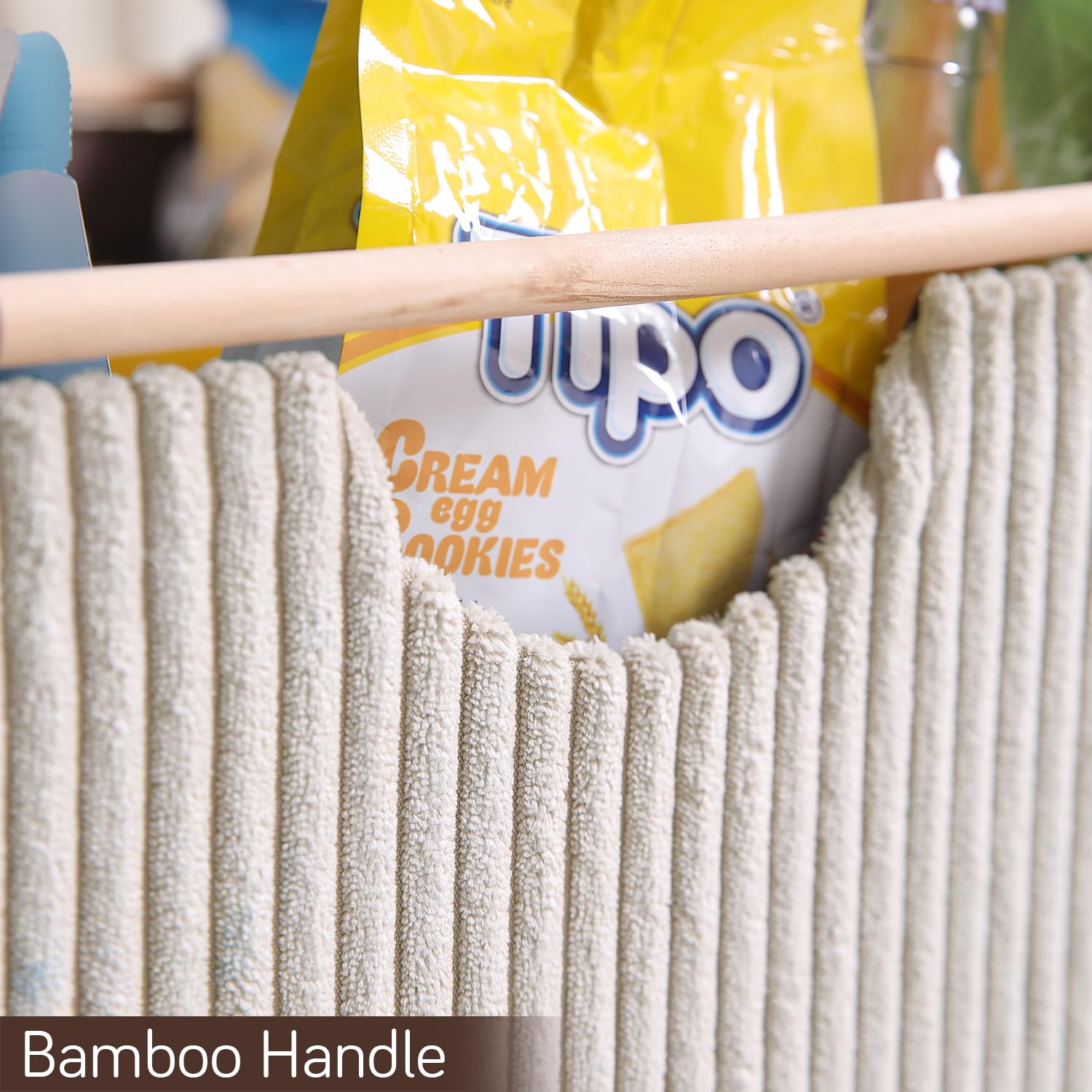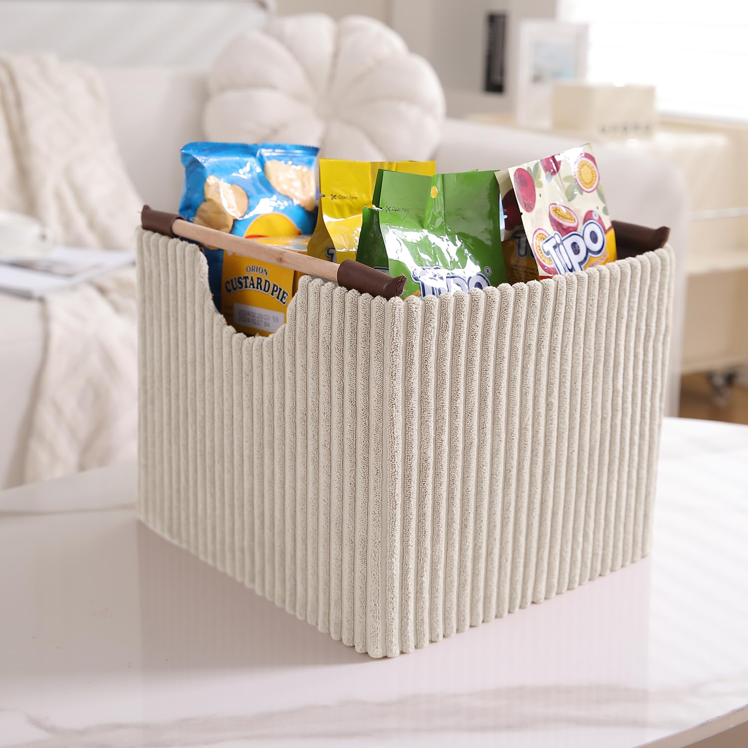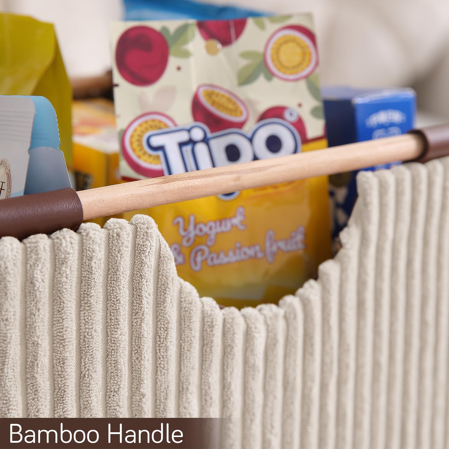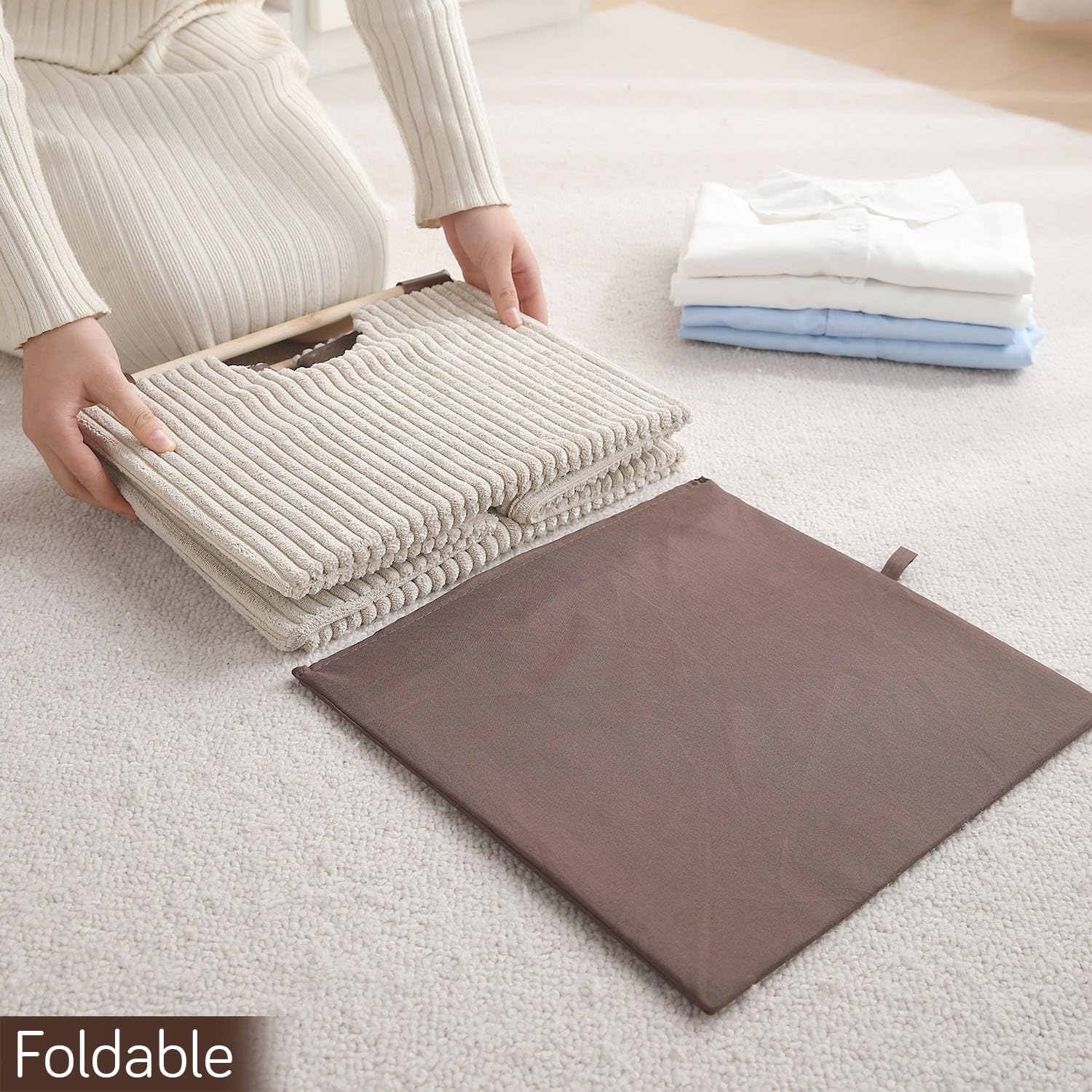 Premium Foldable Storage Bin with Wooden Handles | Corduroy Fabric Organizer Box for Wardrobe, Books, Clothes & Misc Items, Camel