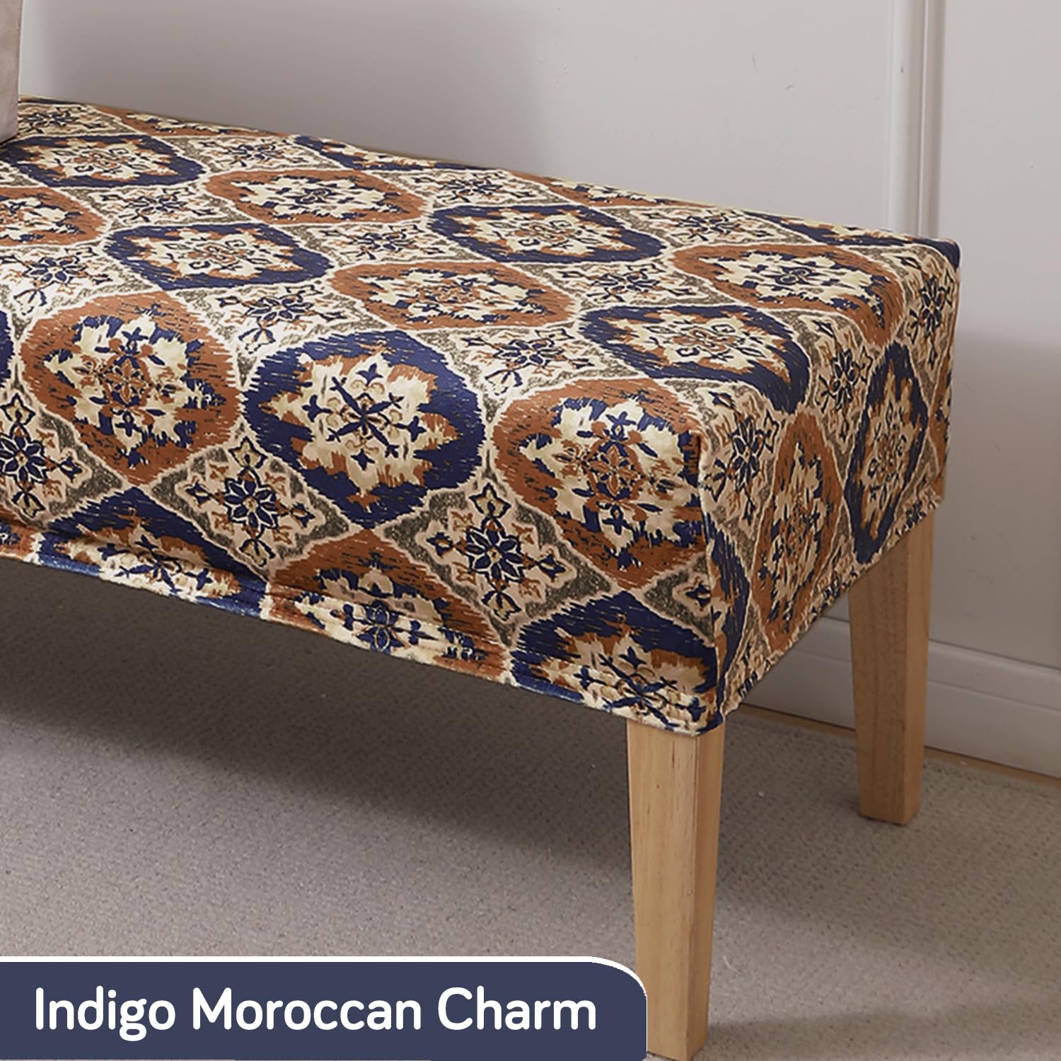 Premium Printed Velvet Dining Bench Cover, Indigo Moroccan Charm