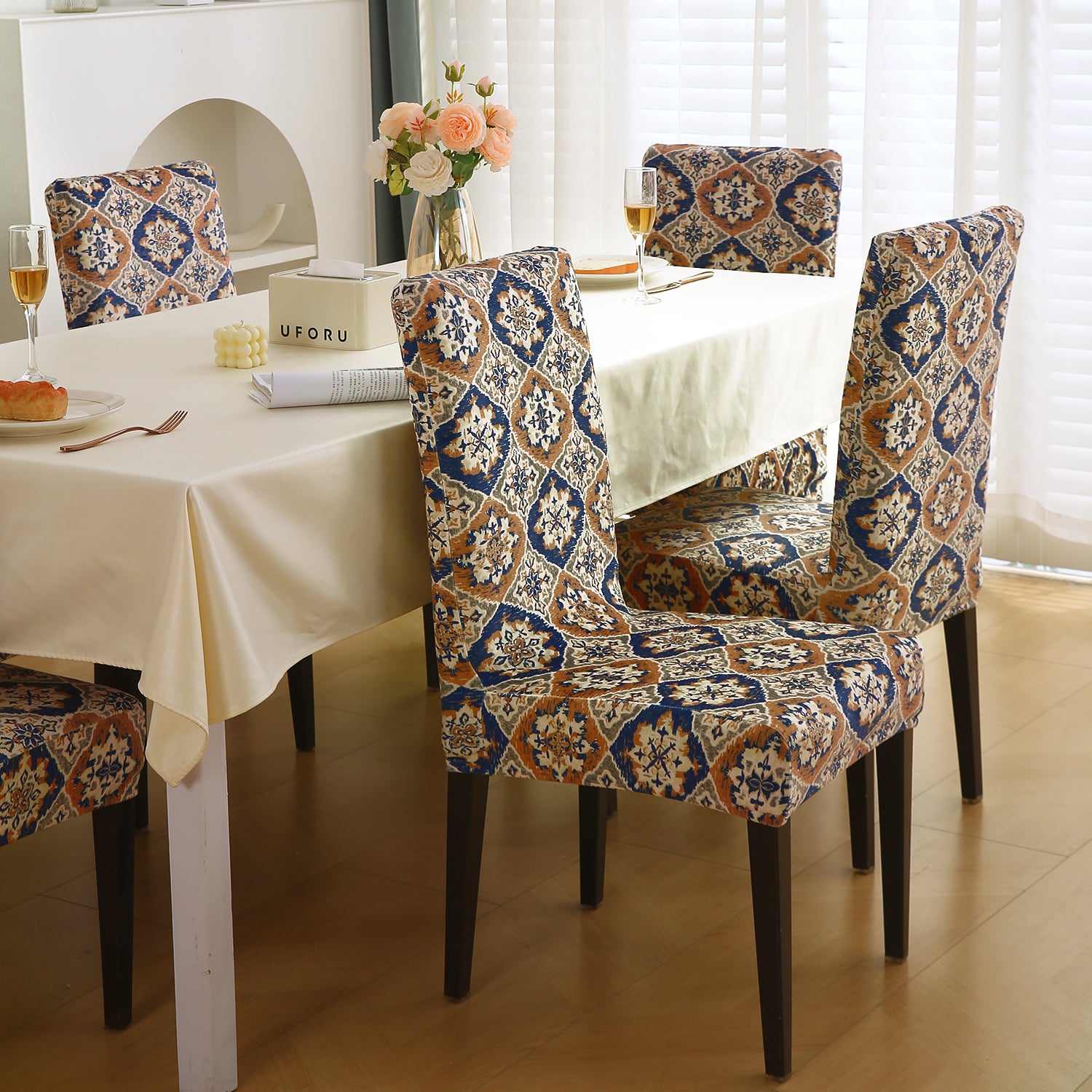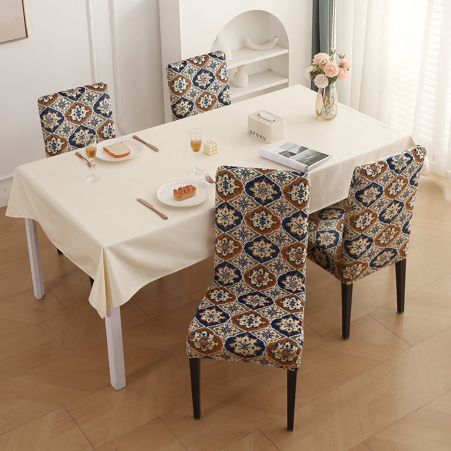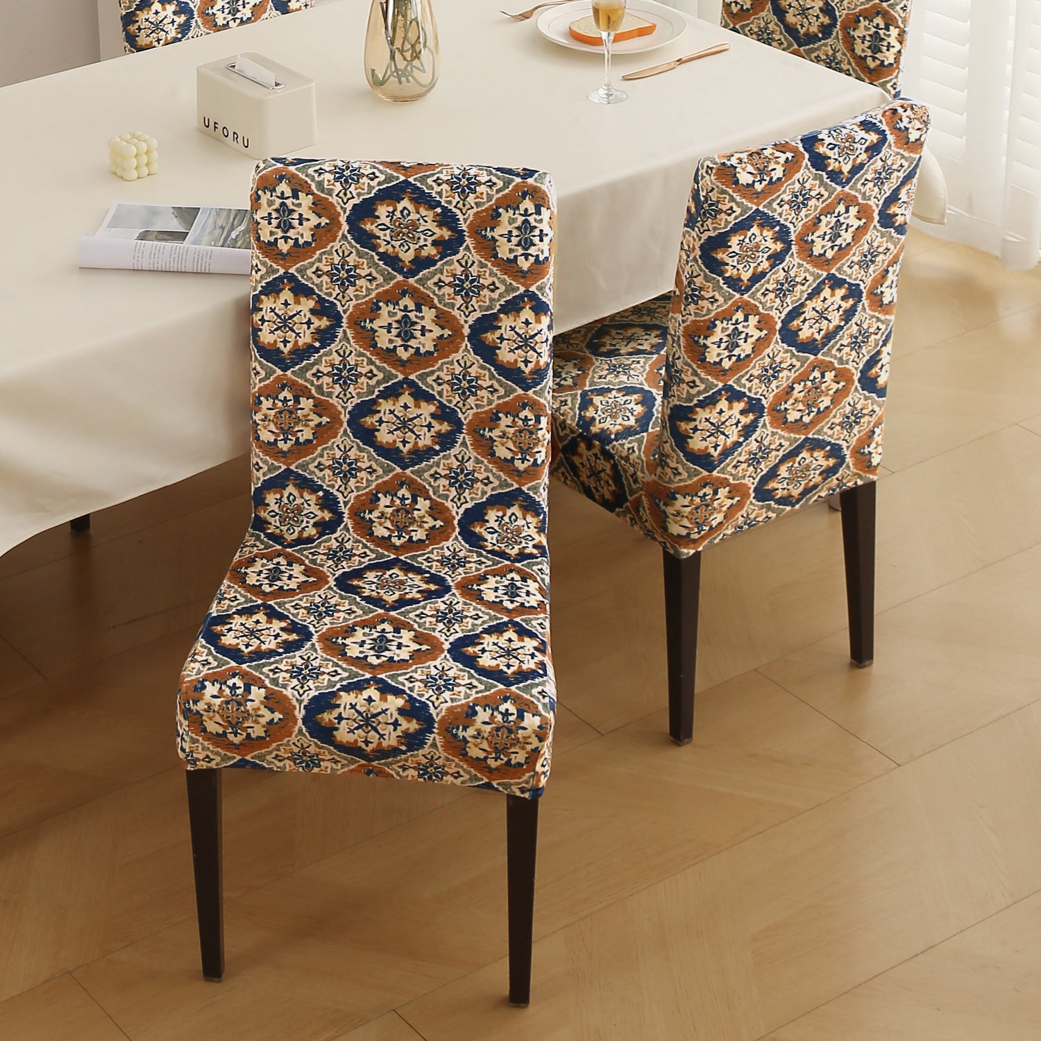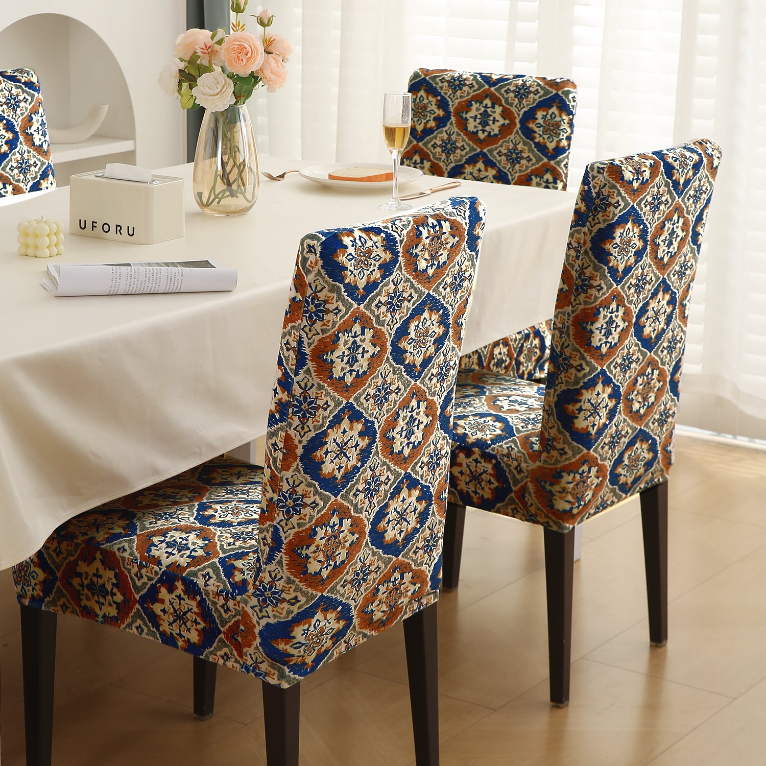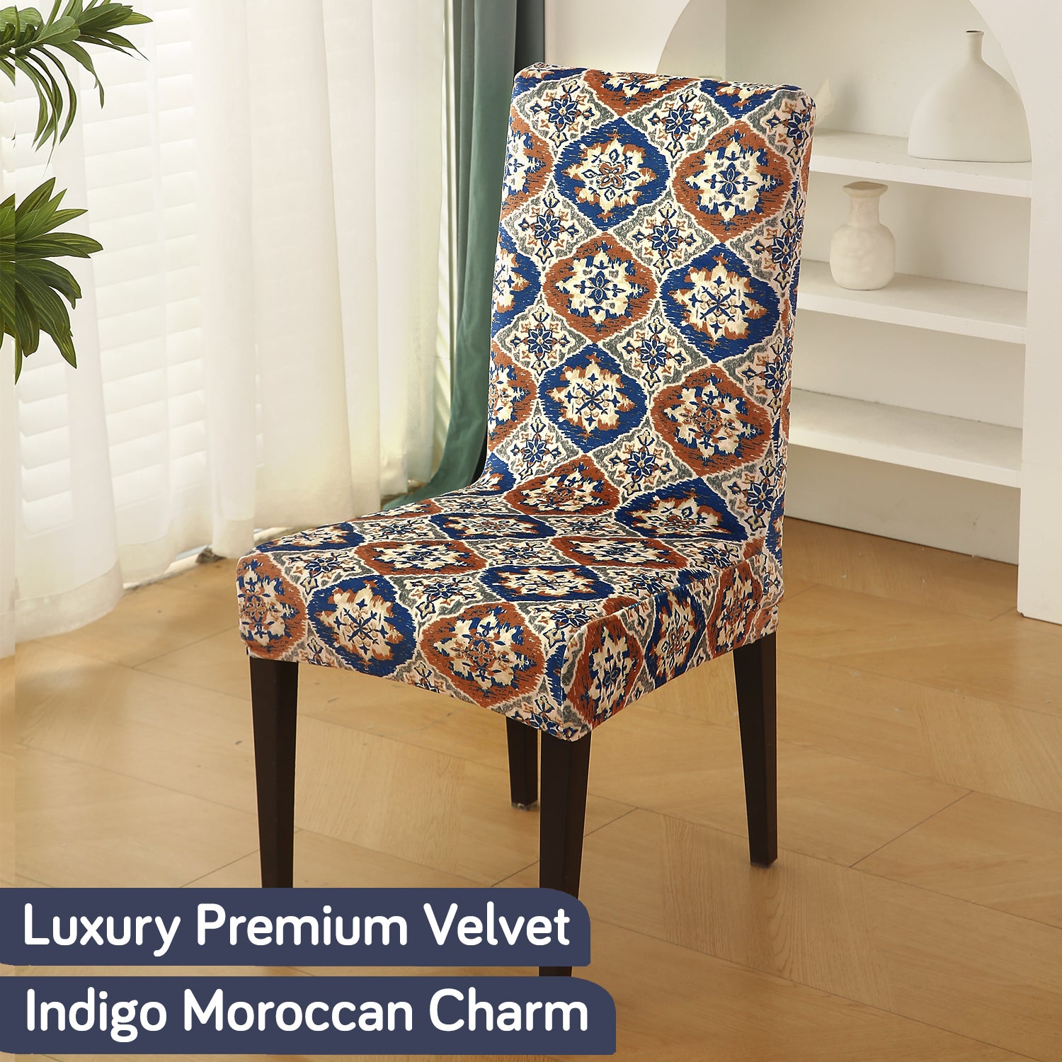 Premium Printed Velvet Dining Chair Cover Set, Indigo Moroccan Charm
