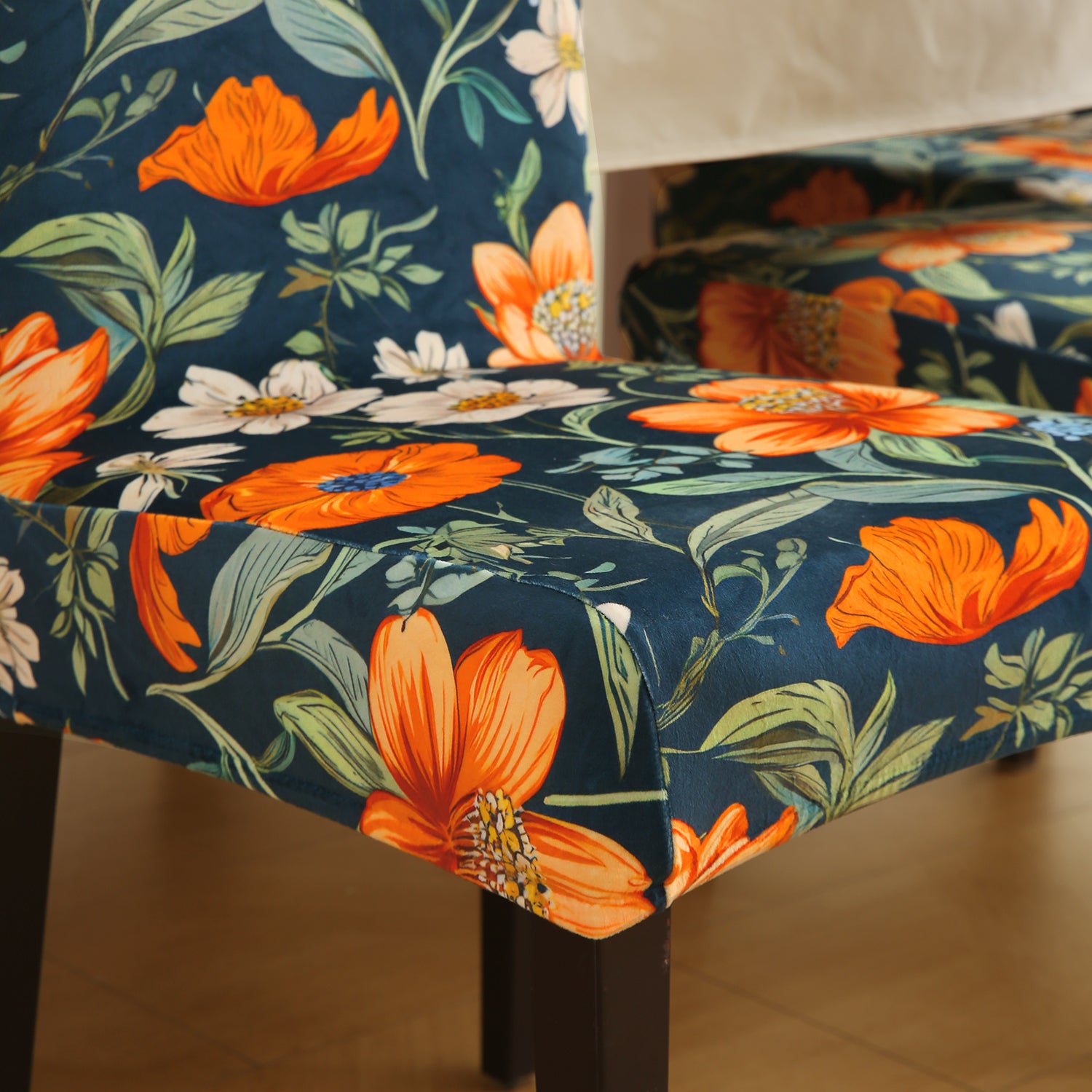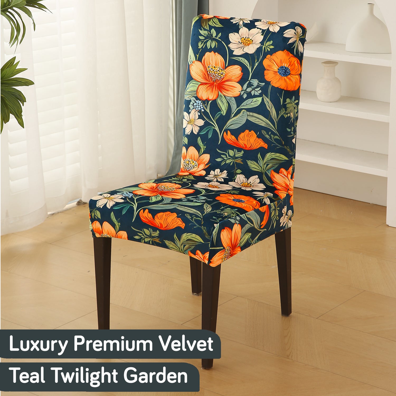 Premium Printed Velvet Dining Chair Cover Set, Teal Twilight Garden