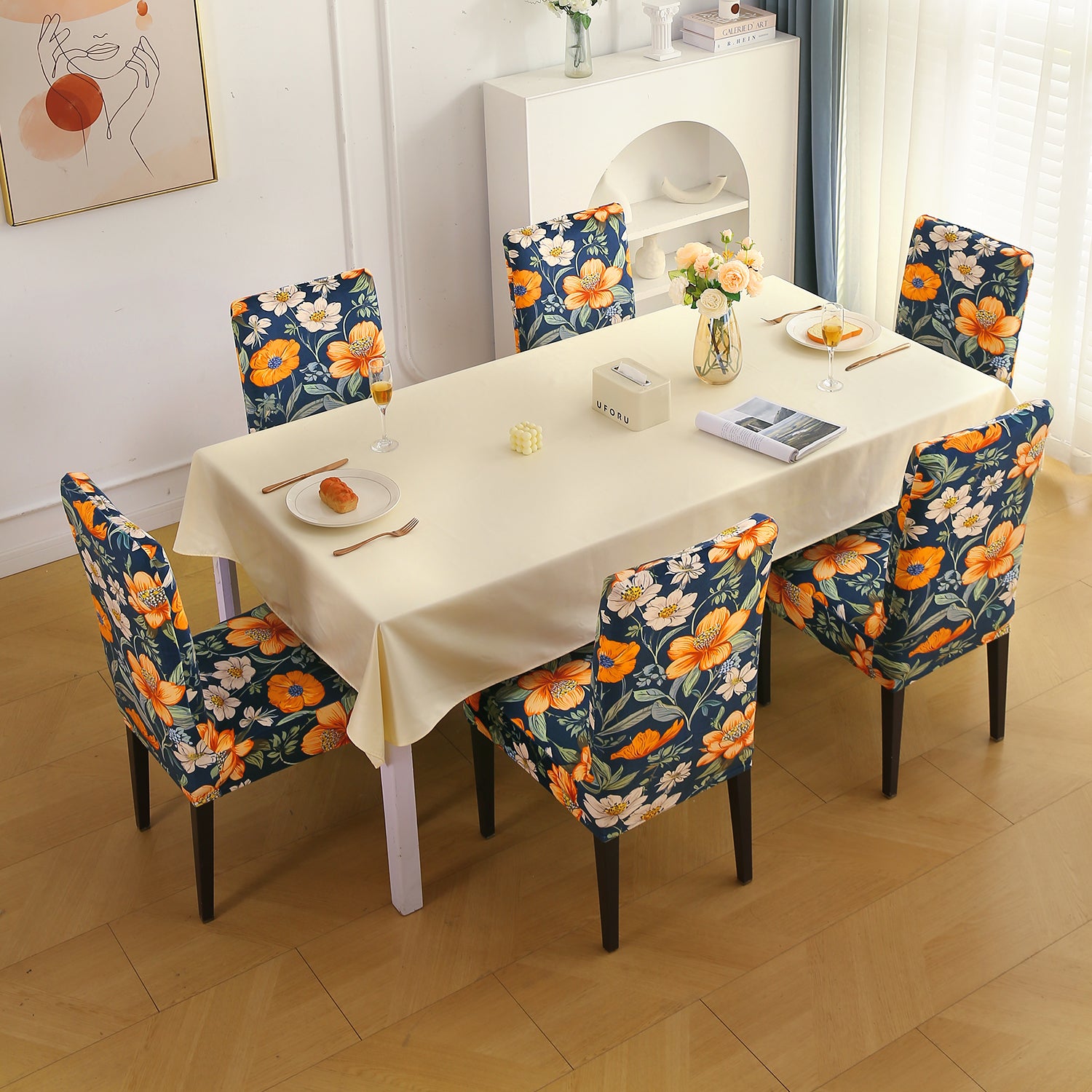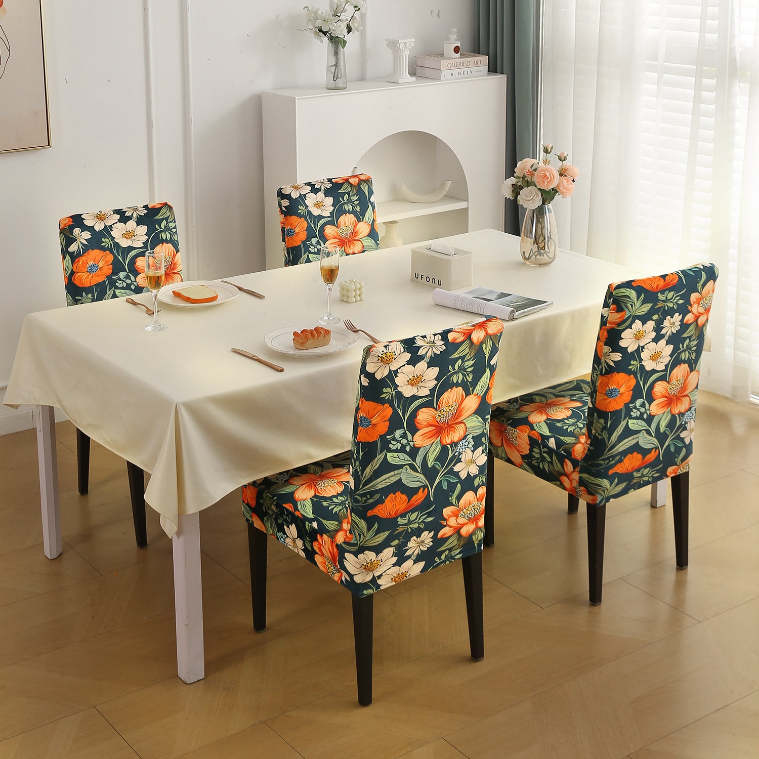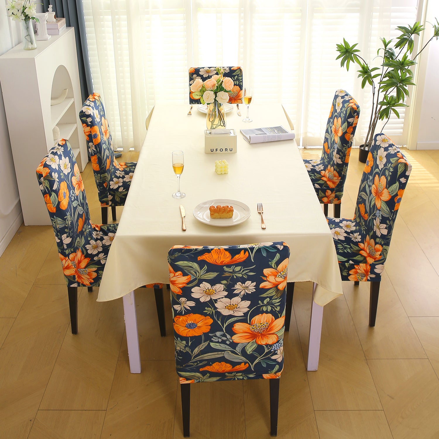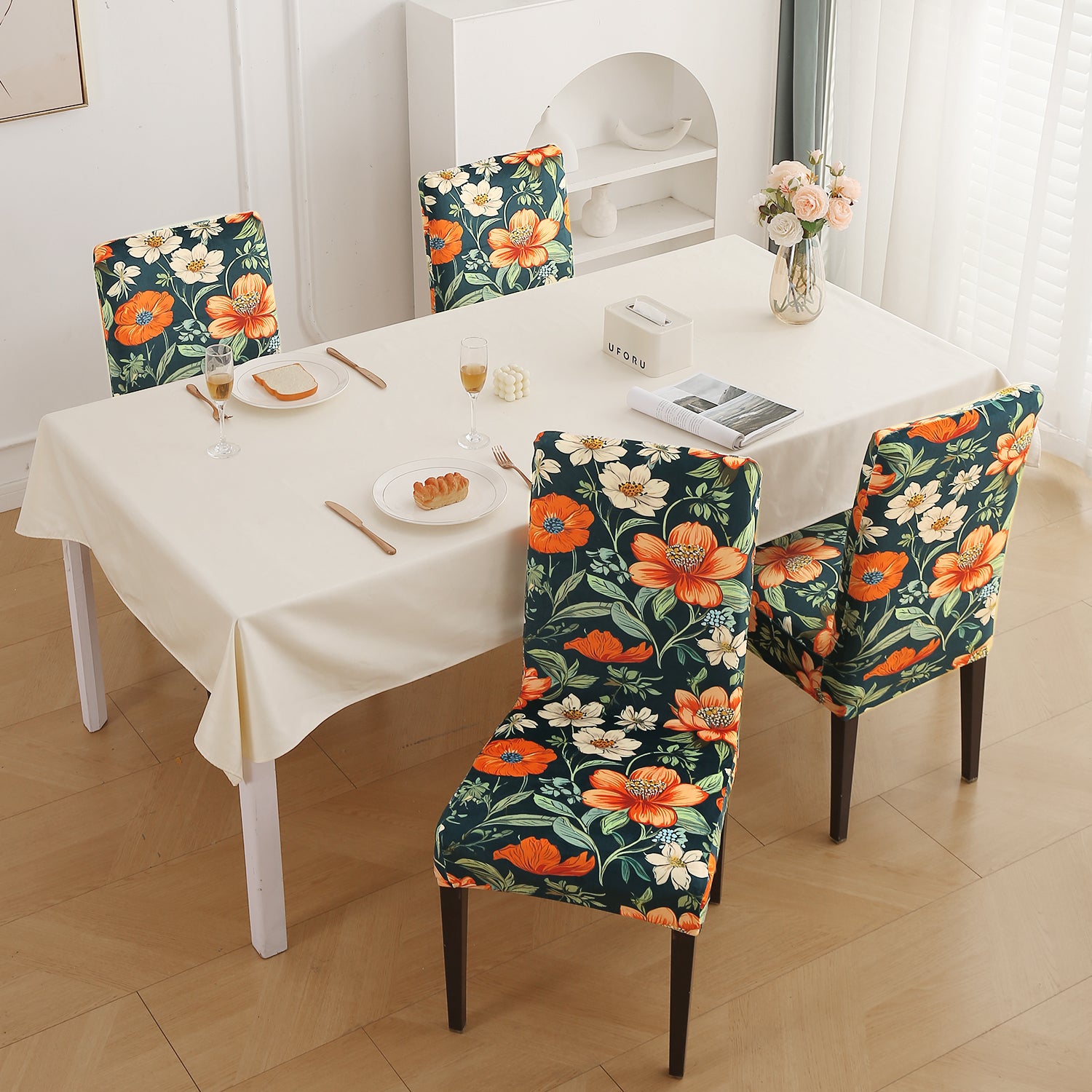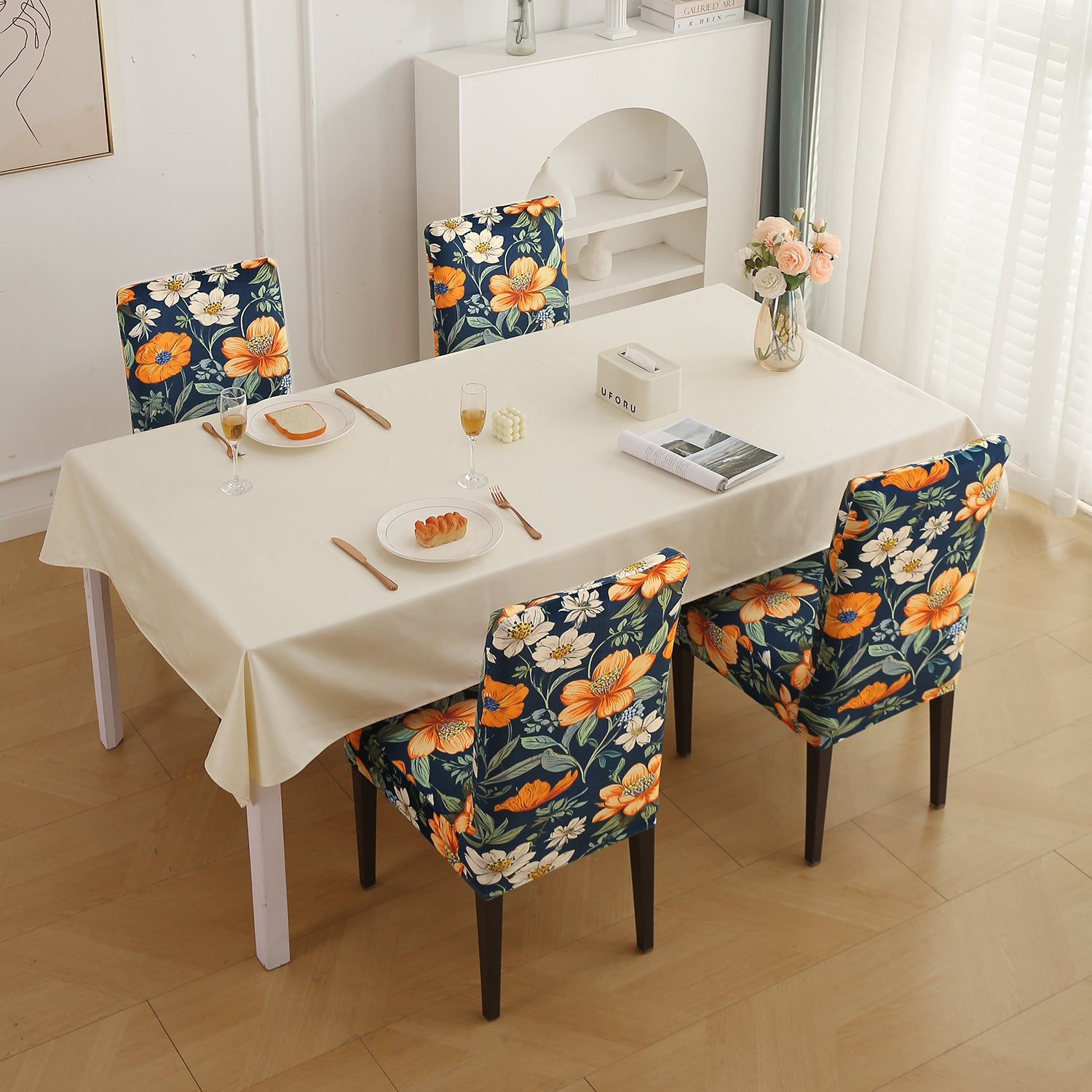 - Includes chair slipcovers for a coordinated dining setup.
