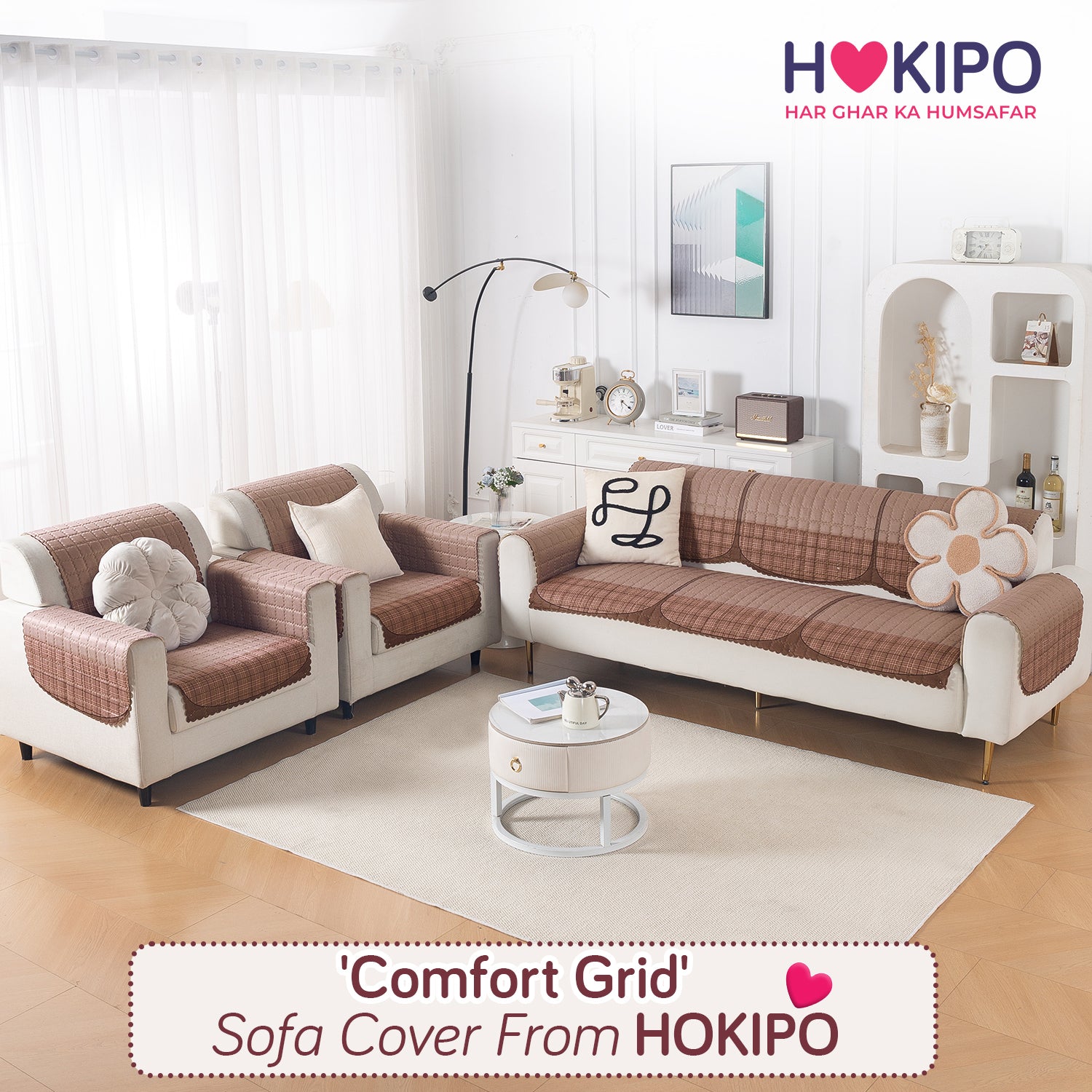 Premium Quilted 5 (3+1+1) Seater Sofa Cover Set with Foam Filling | 'Comfort Grid', Rose Taupe