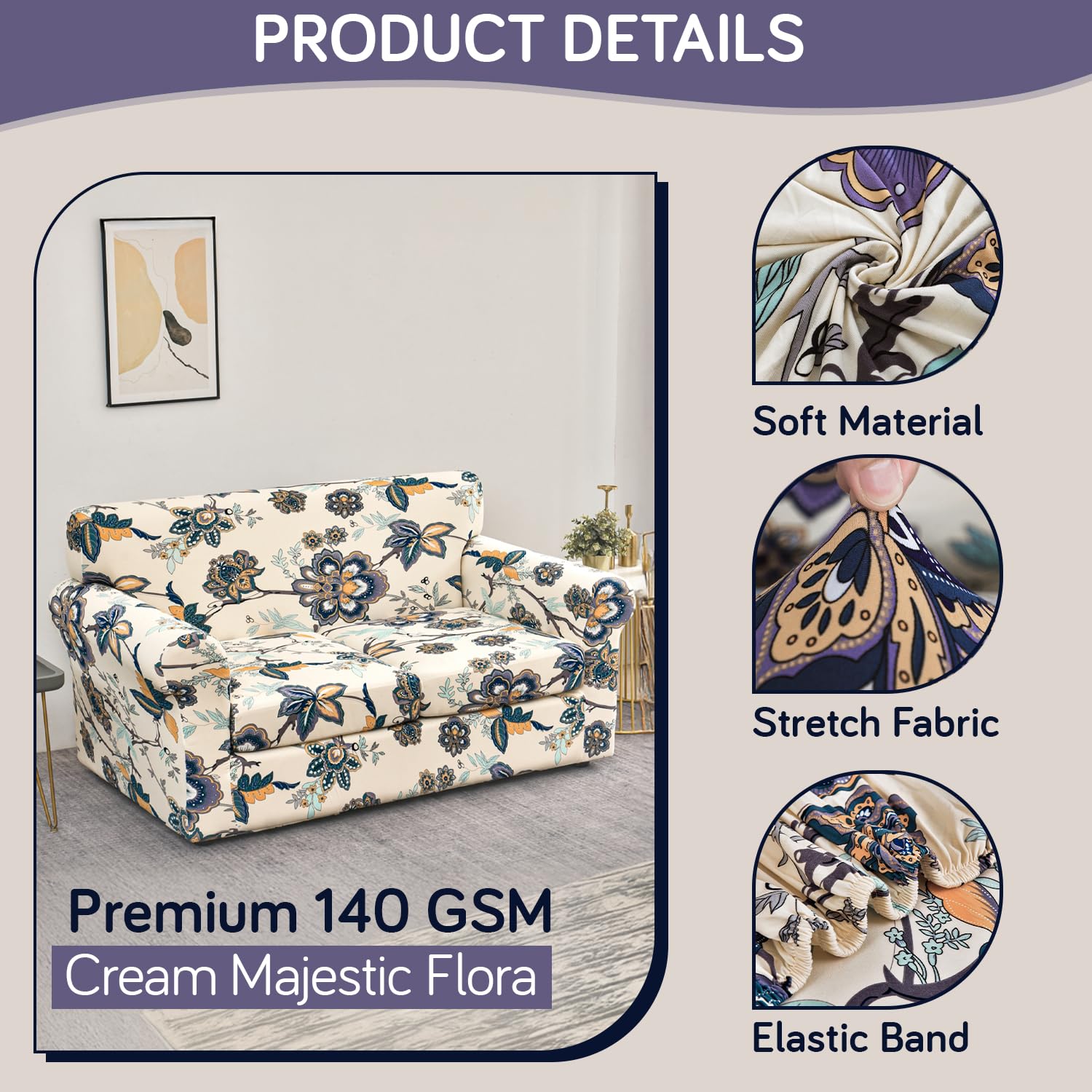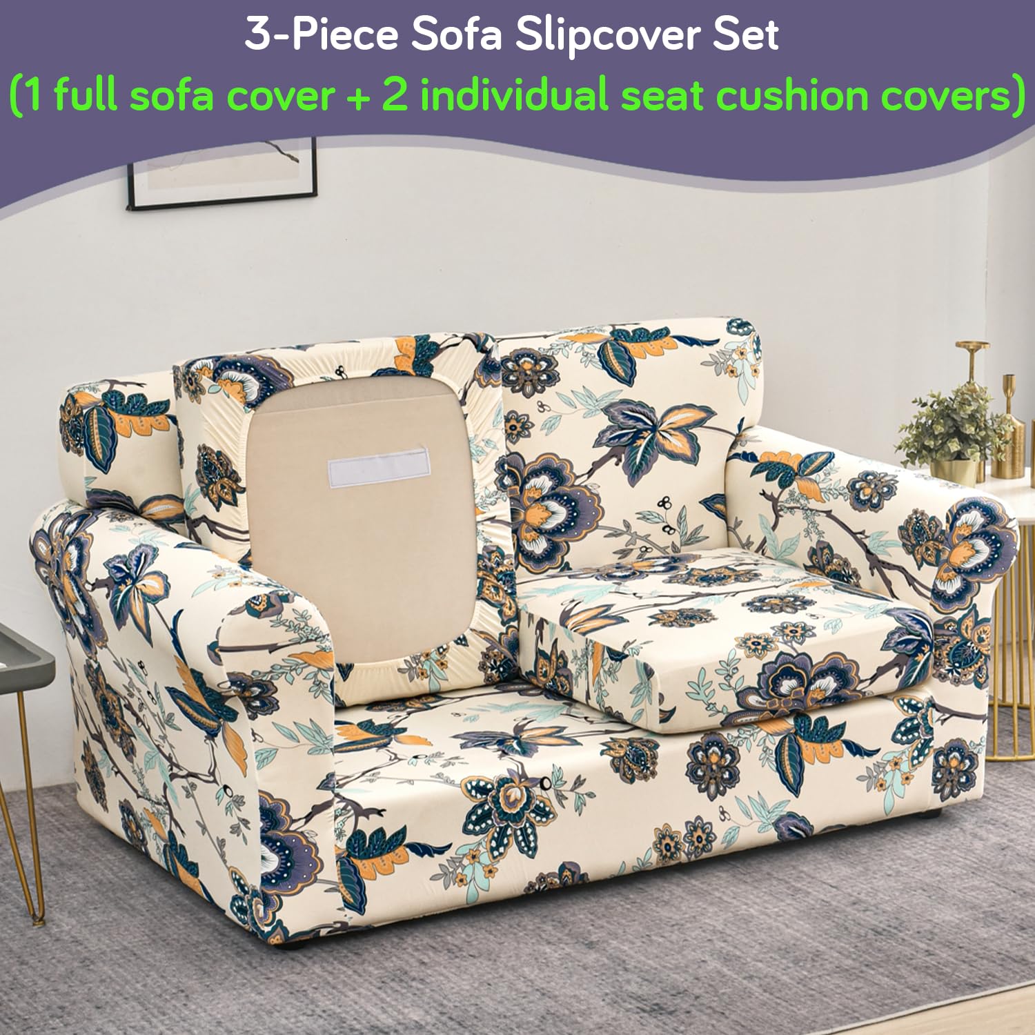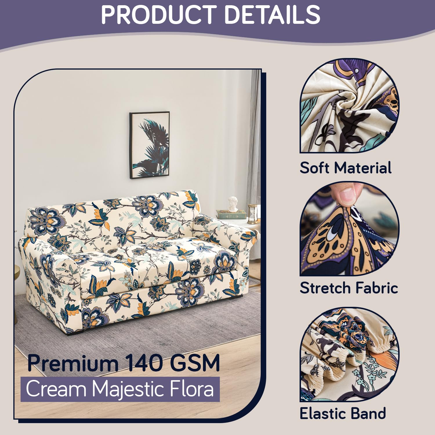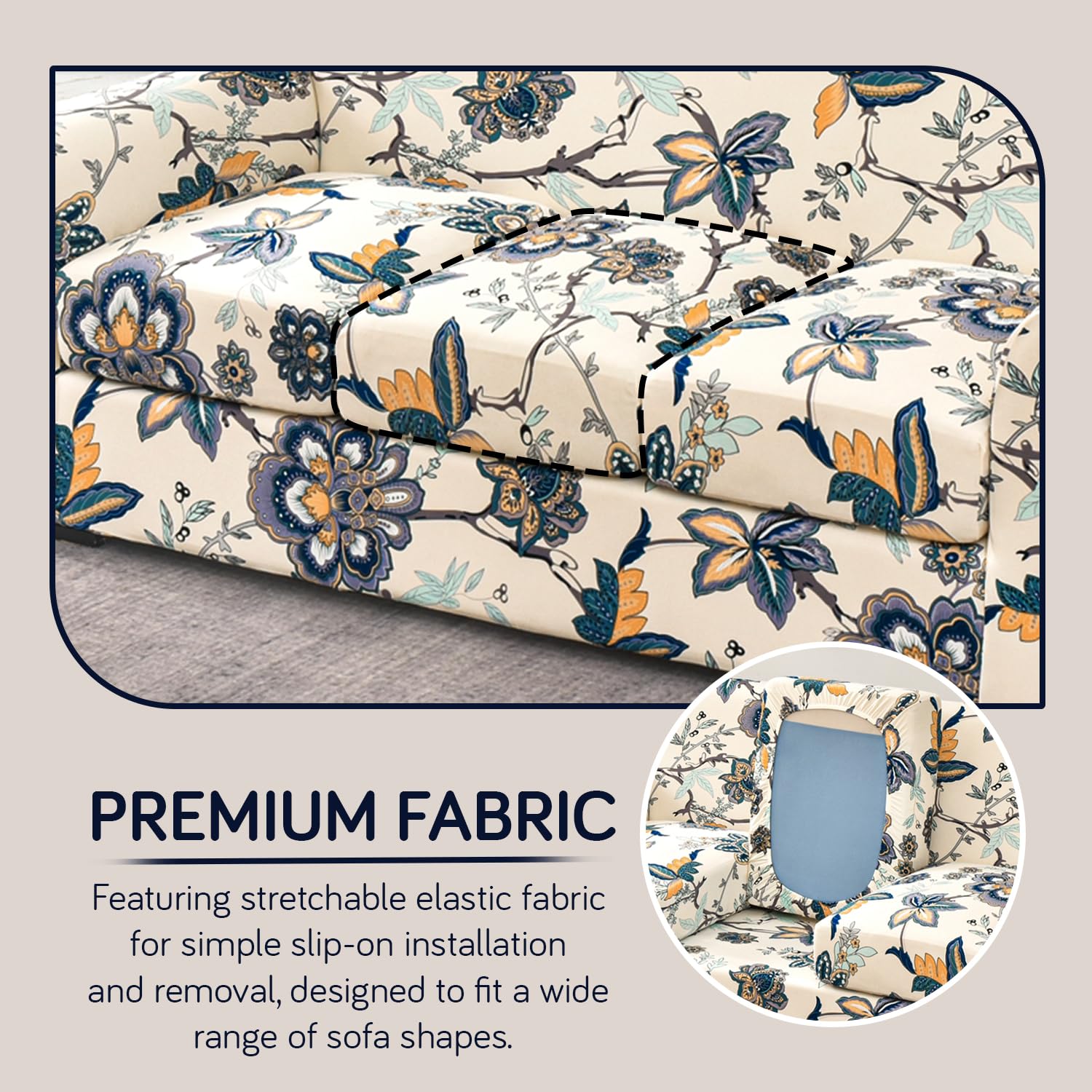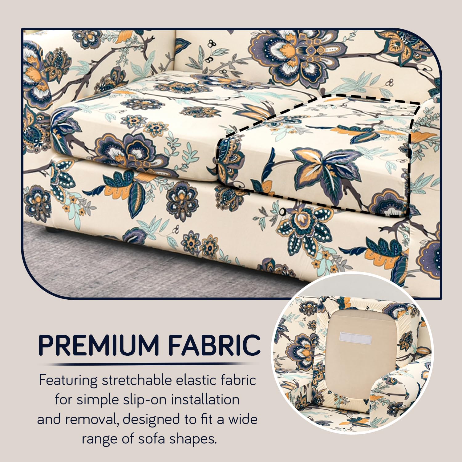 Printed Stretchable Sofa Slipcover with 1/2/3 Pc Separate Seat Cushion Cover for each 1/2/3 Seater, Cream Majestic Flora