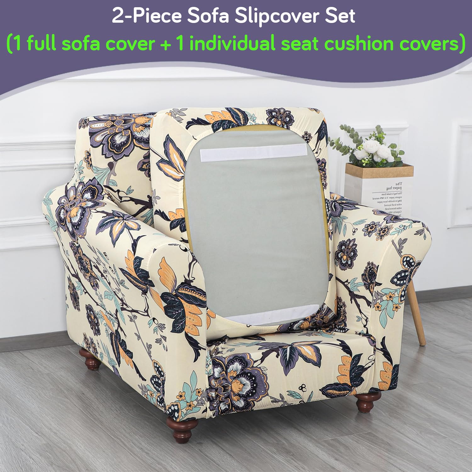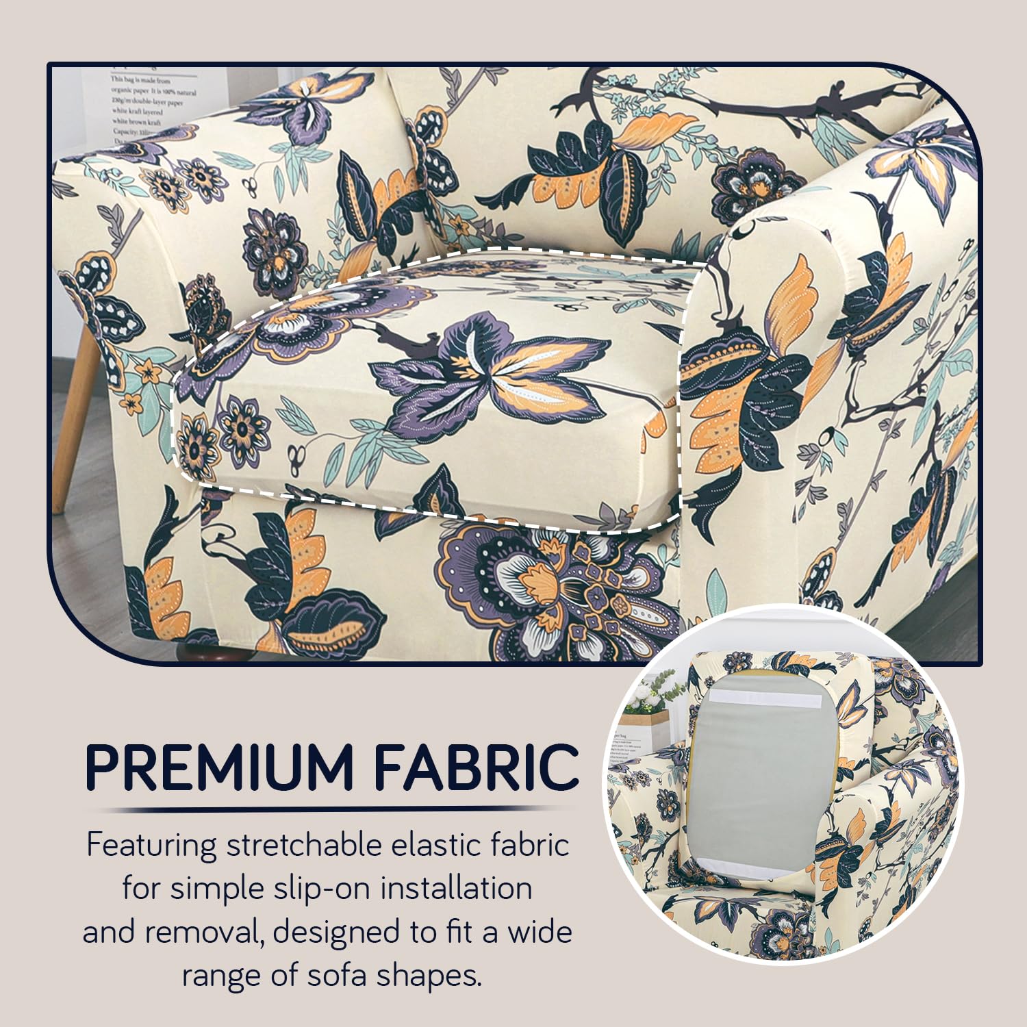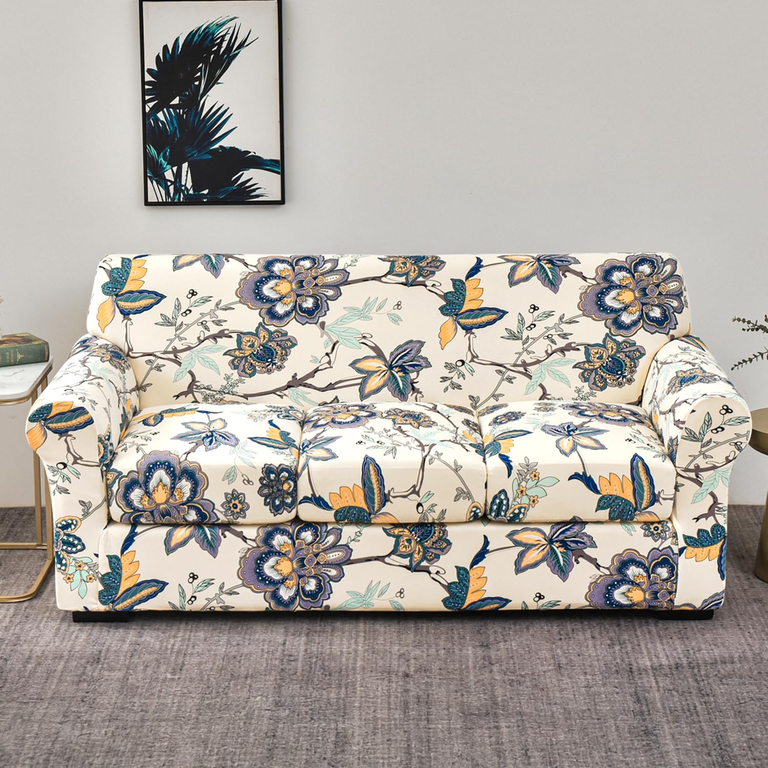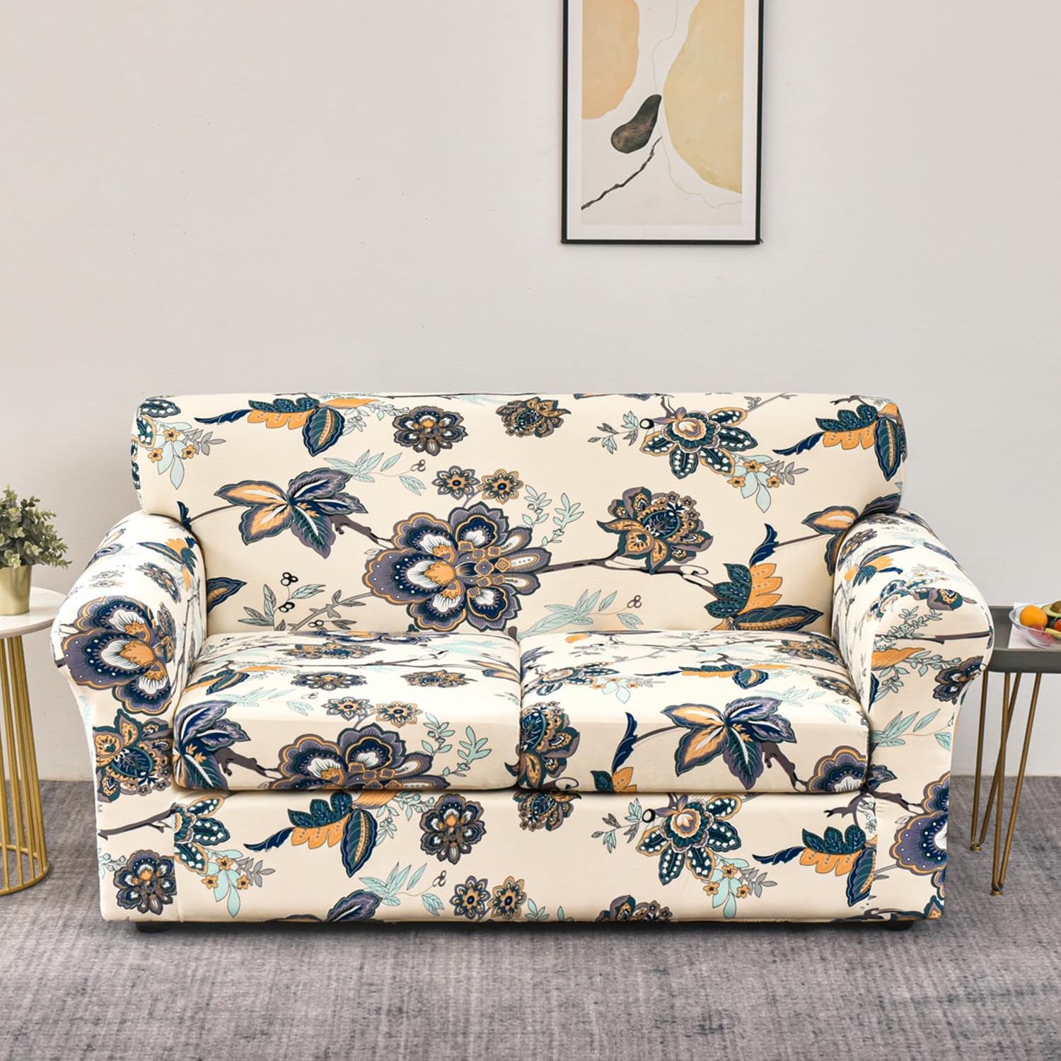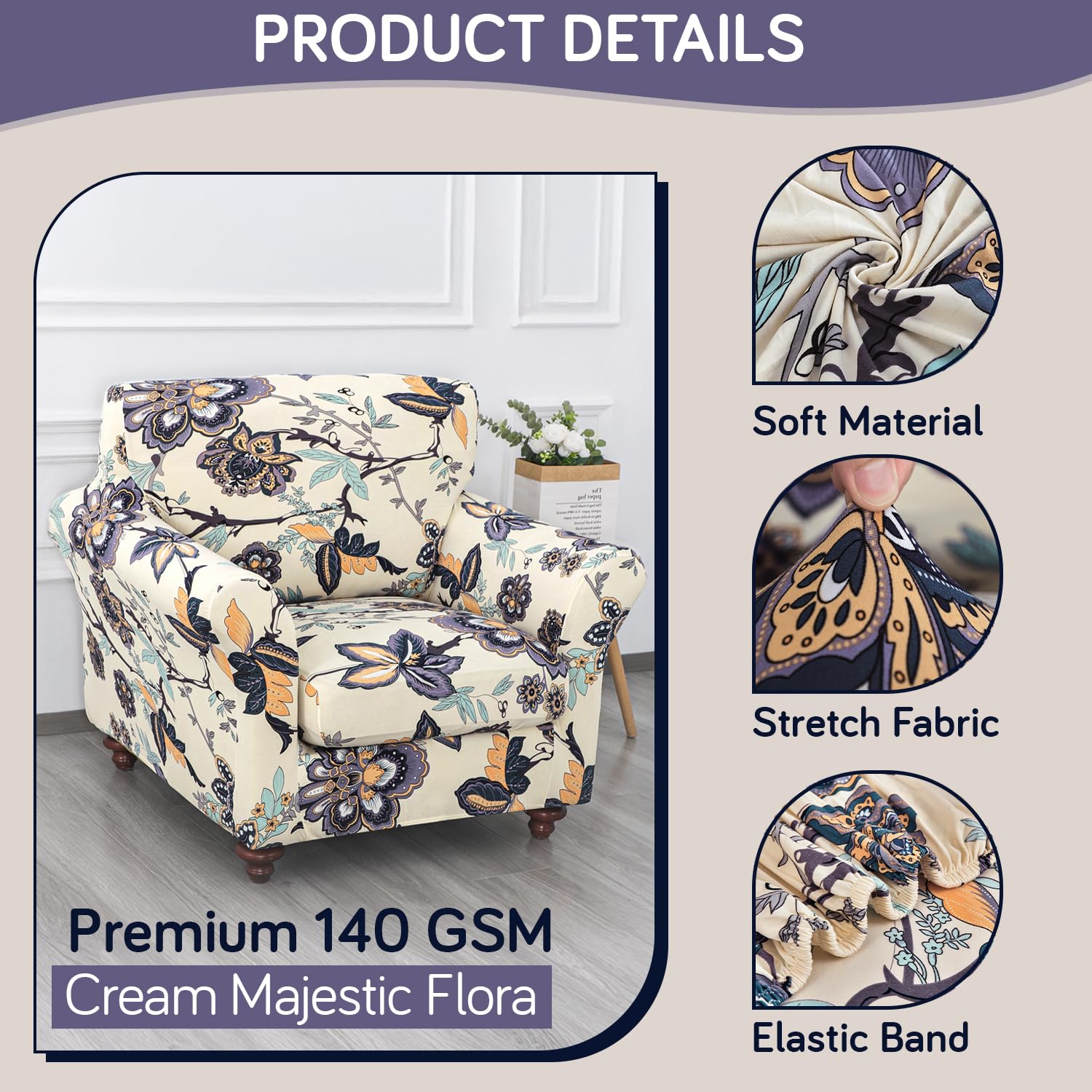 Printed Stretchable Sofa Slipcover with 1/2/3 Pc Separate Seat Cushion Cover for each 1/2/3 Seater, Cream Majestic Flora