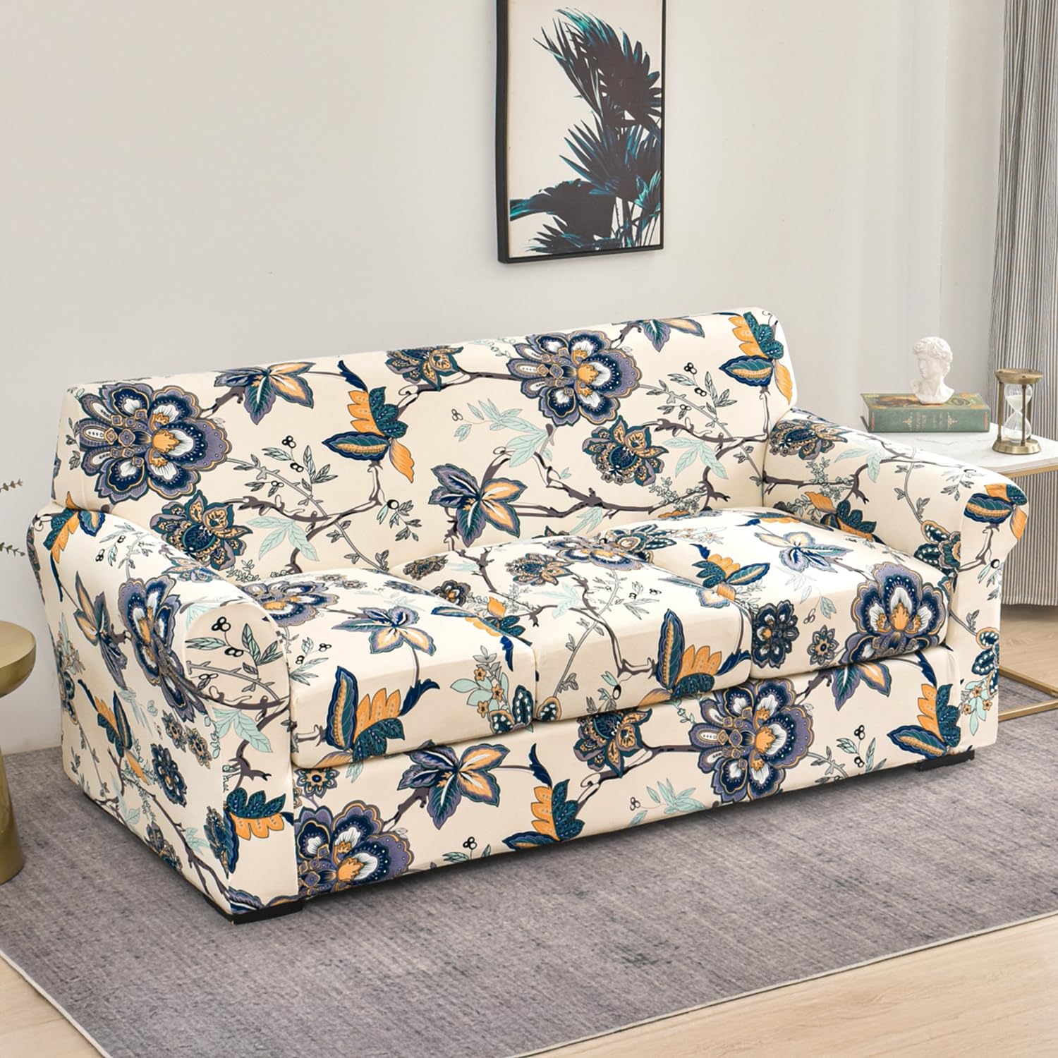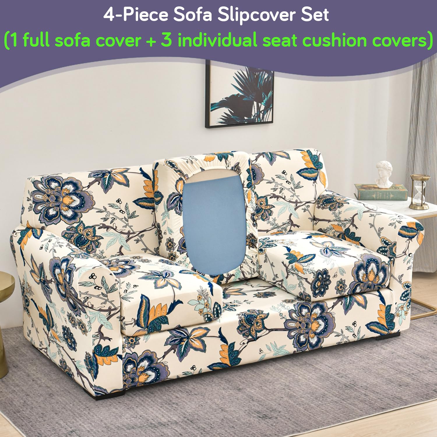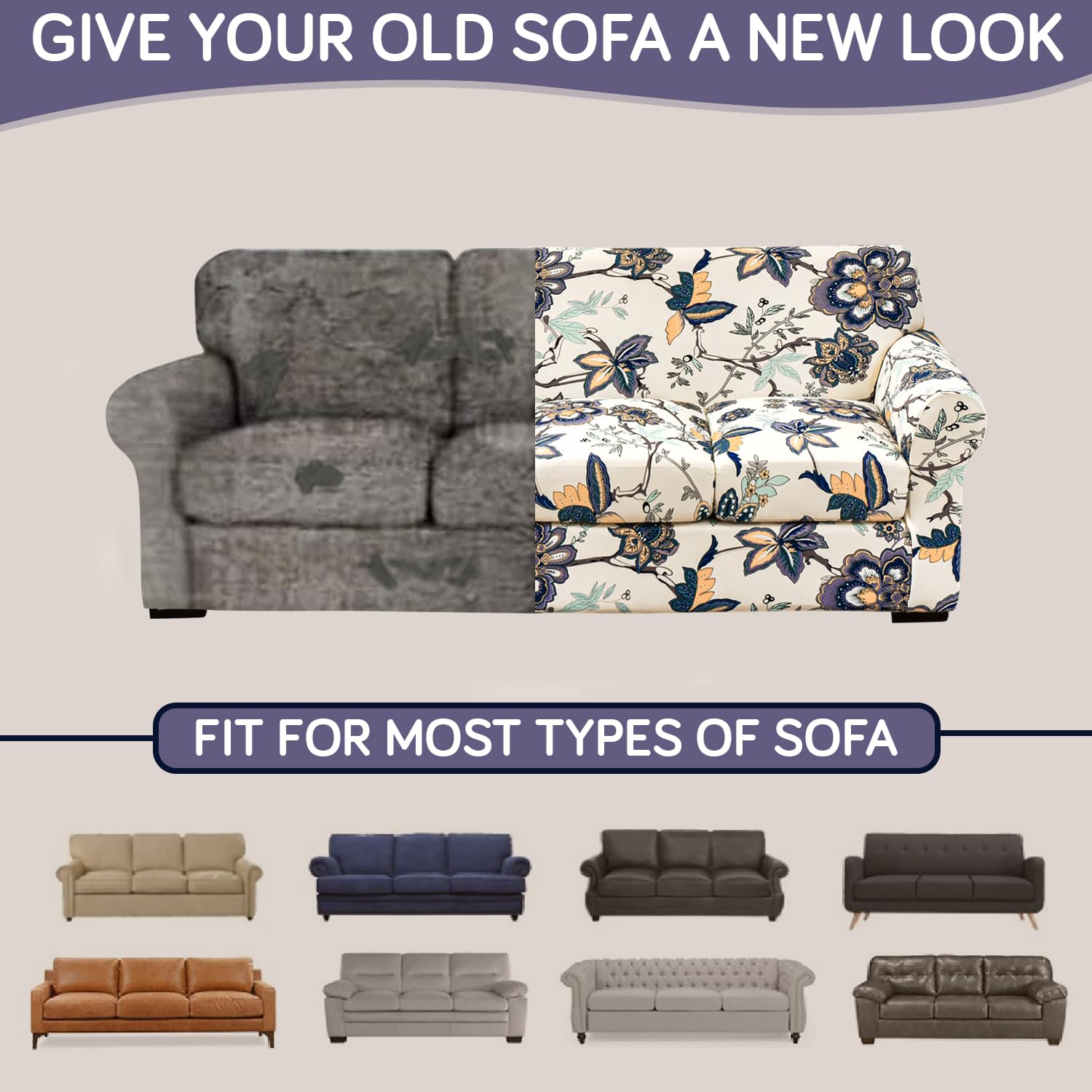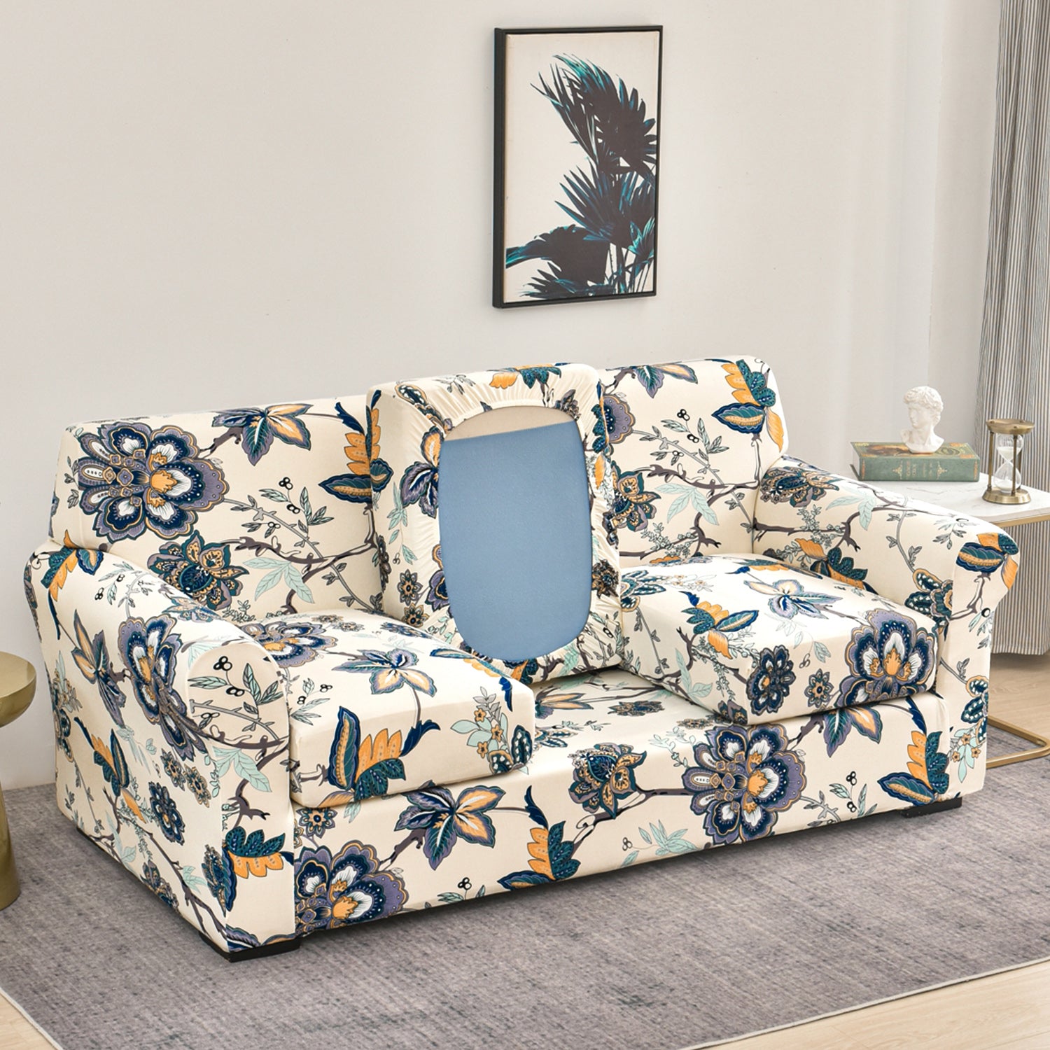 Printed Stretchable Sofa Slipcover with 1/2/3 Pc Separate Seat Cushion Cover for each 1/2/3 Seater, Cream Majestic Flora