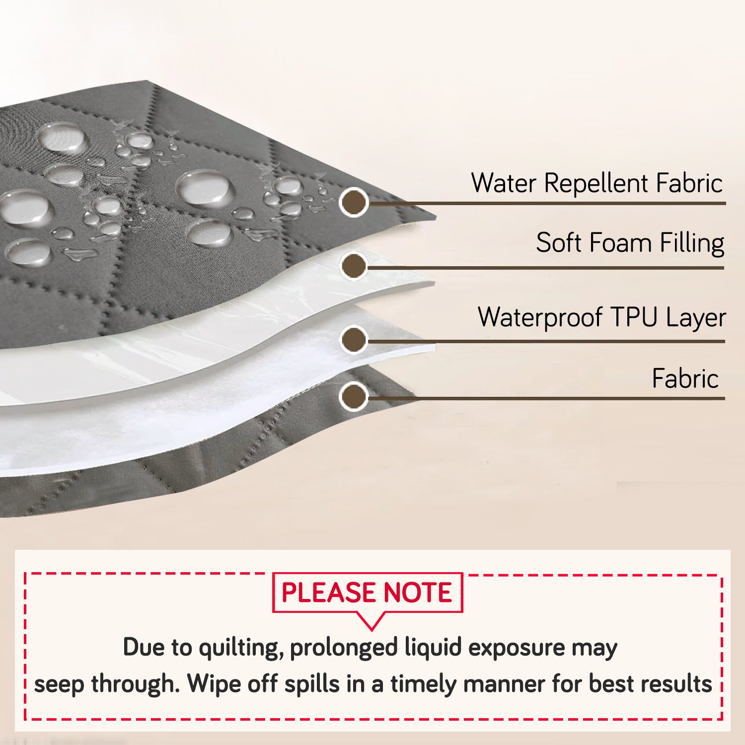 - Clean spills with a damp cloth. Wash only when needed. The water-repellent spray may wear off after washes, but the TPU layer remains waterproof. Do not iron to protect the waterproof layer.