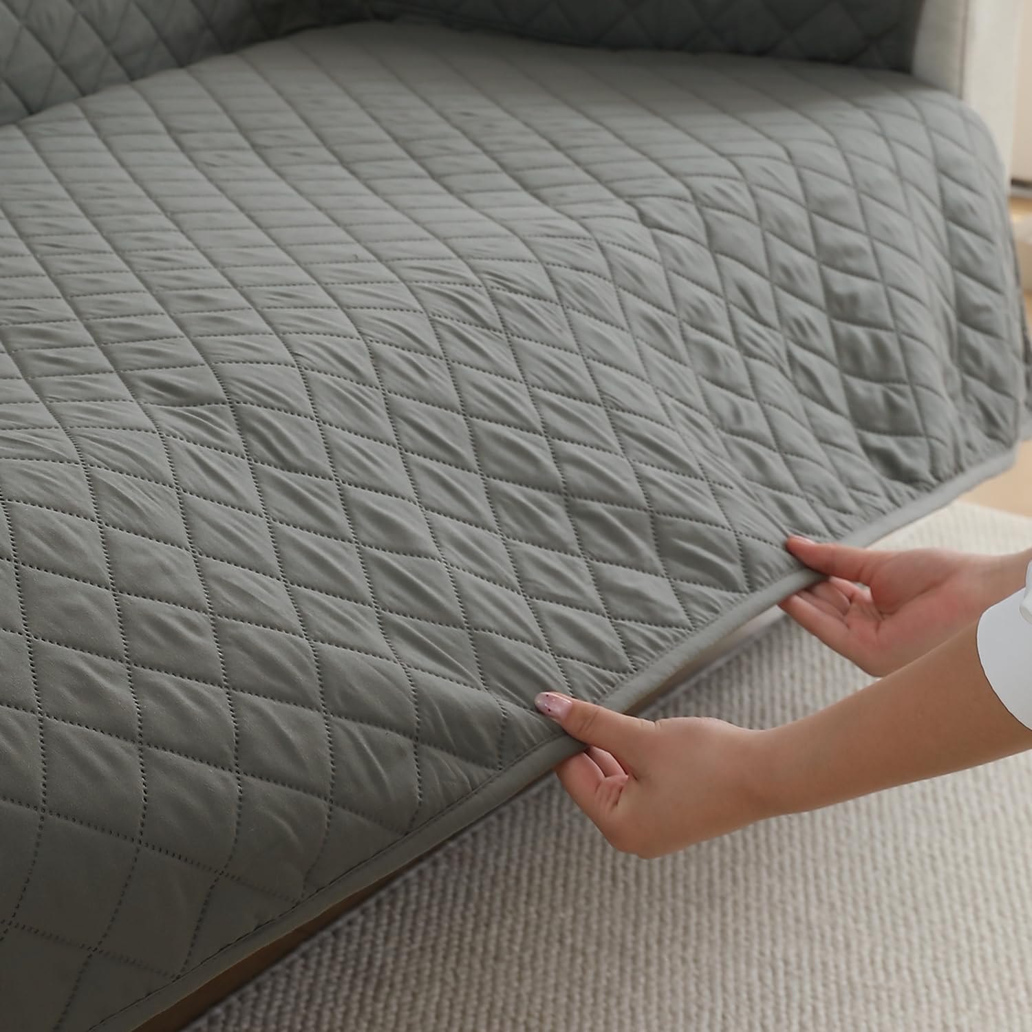 Waterproof & Quick-Dry Quilted 1/2/3-Seater Sofa Cover with Pockets on Armrest, Light Grey